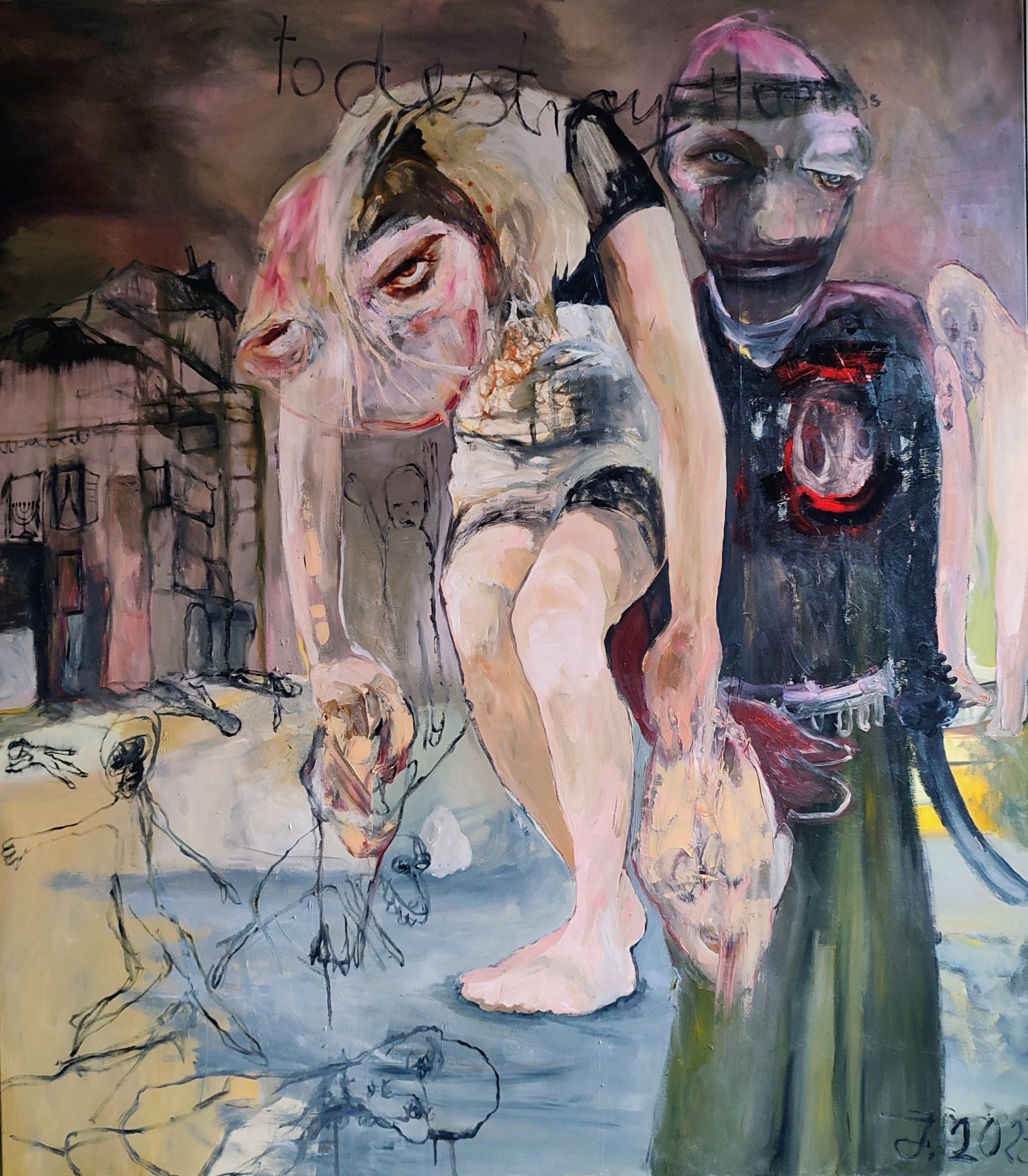 The titles of my pictures are elements of the painting, the words function as a visual element, not as a caption. Sometimes my works are zoomed on destructive art, where creating and destroying coincide.