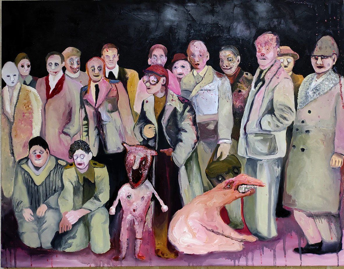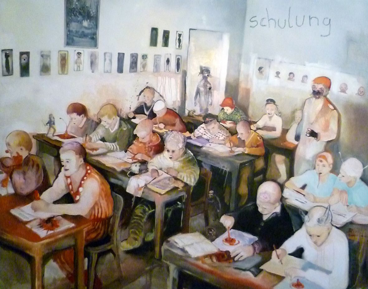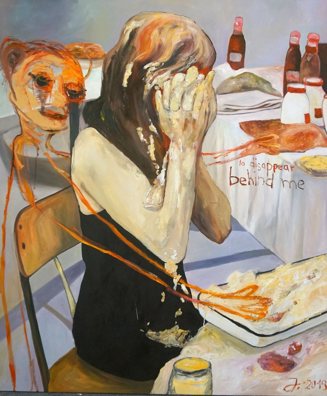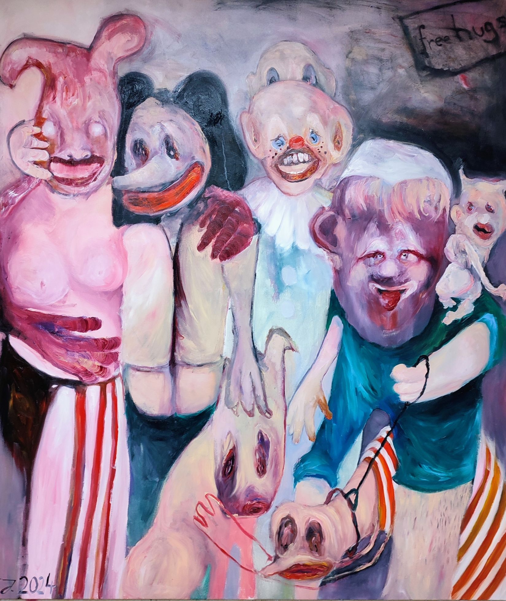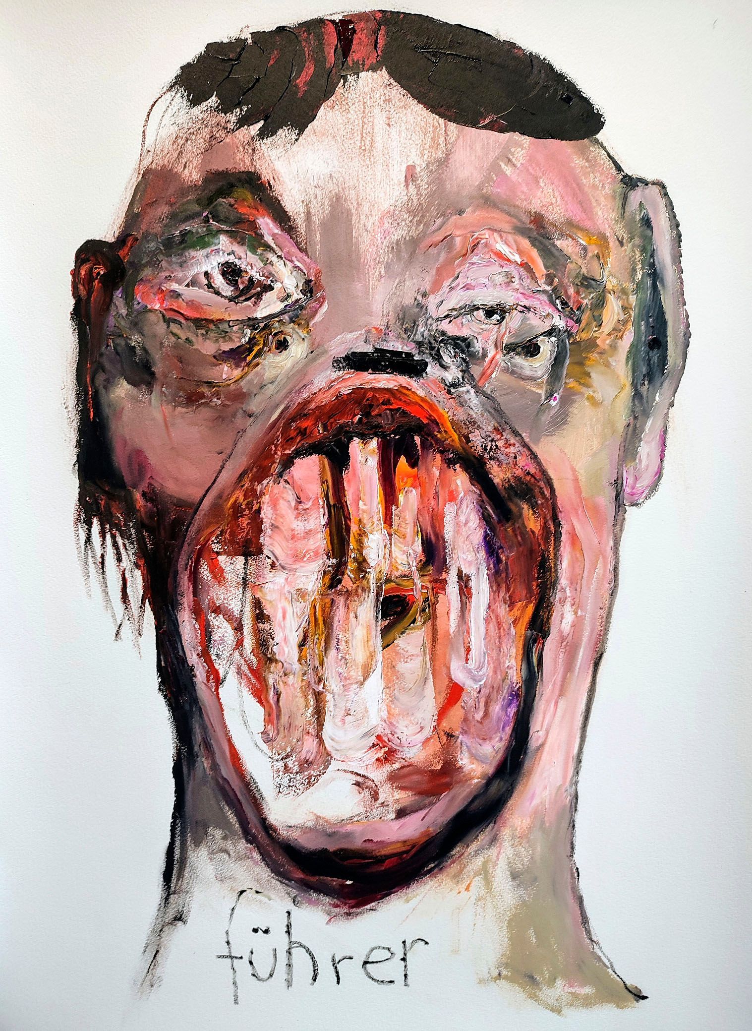 I´m inspired by the following artists. Francis Bacon, Paul Mc Carthy, Georg Grosz, Cindy Sherman but I`m not very ambitious in art history, so I often work very free without having some imaginations from other artists in my mind. I think that is the reason of the independence of my paintings. In my education, during my studies I learned a lot about Georg Grosz. I try to make satire paintings for the present time, we live in today.