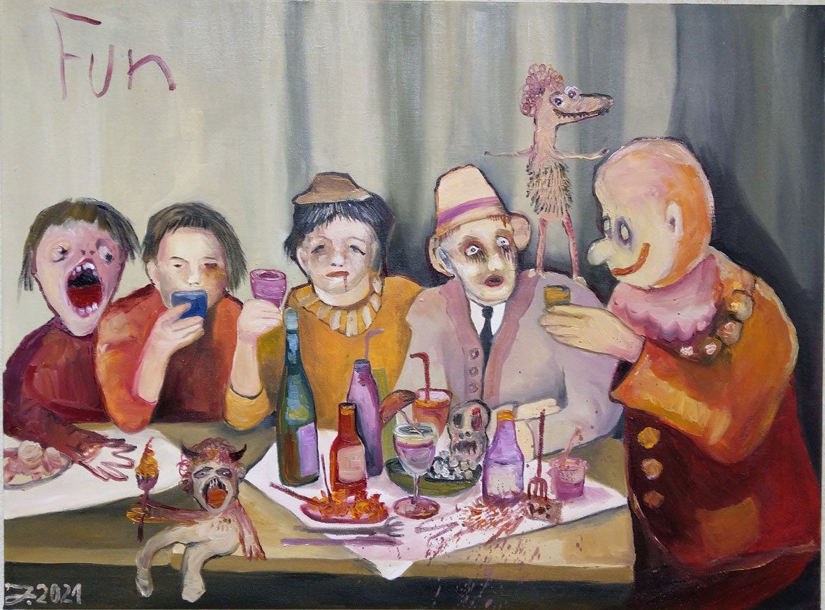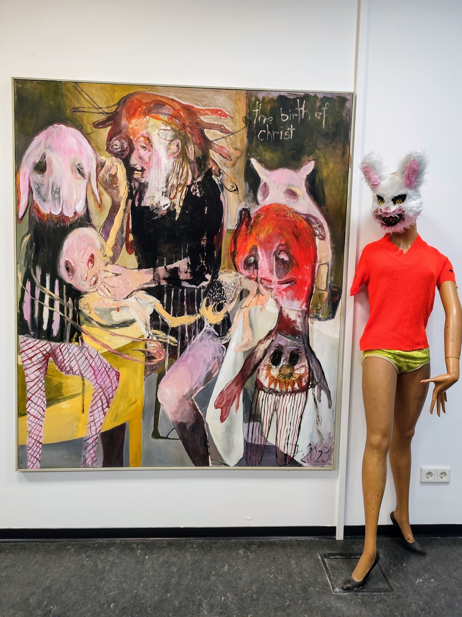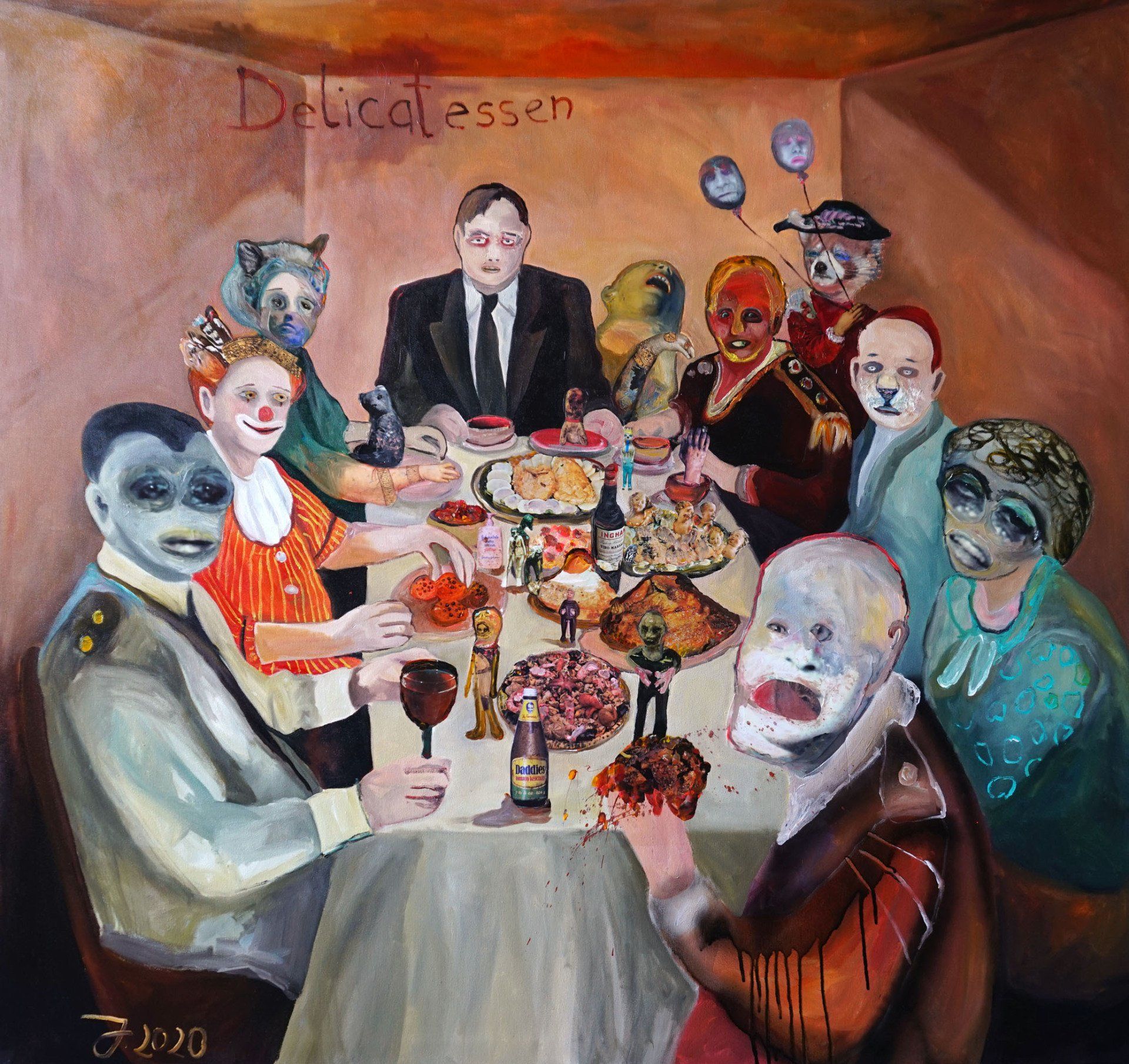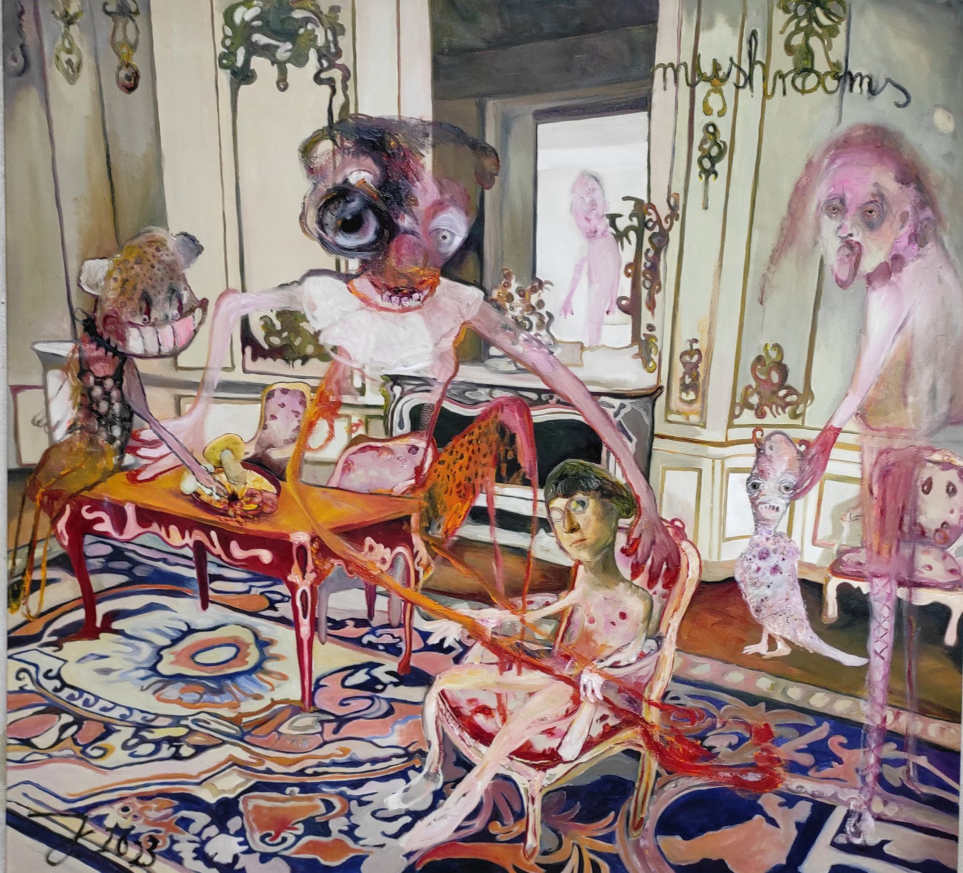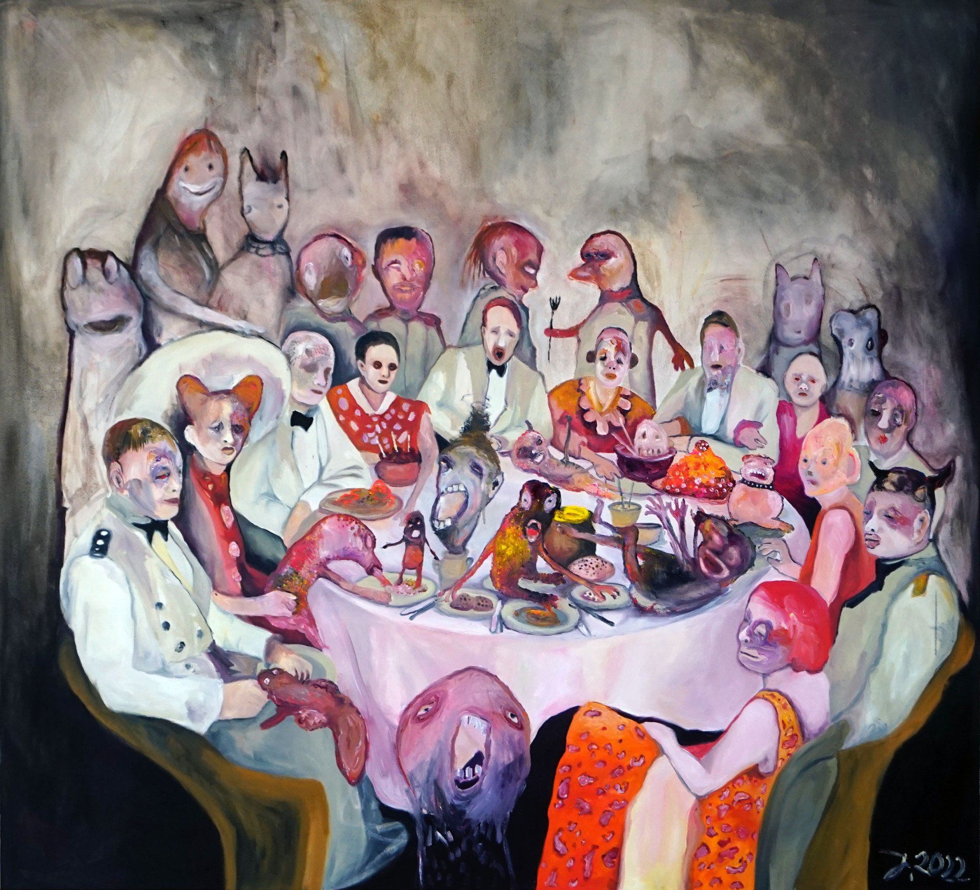 I´m inspired by the following artists. Francis Bacon, Paul Mc Carthy, Georg Grosz, Cindy Sherman but I`m not very ambitious in art history, so I often work very free without having some imaginations from other artists in my mind. I think that is the reason of the independence of my paintings. In my education, during my studies I learned a lot about Georg Grosz. I try to make satire paintings for the present time, we live in today.