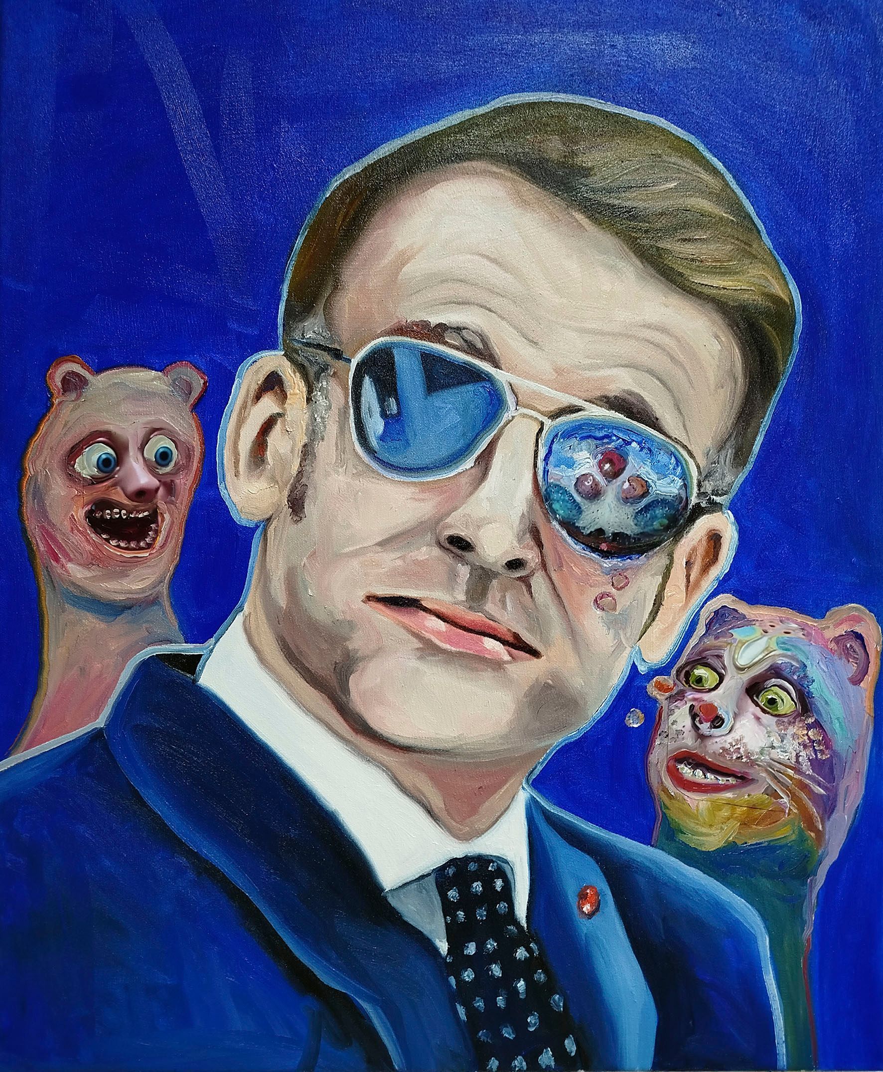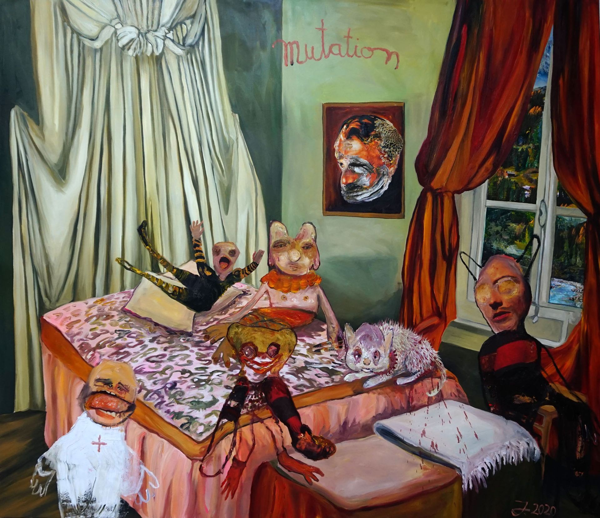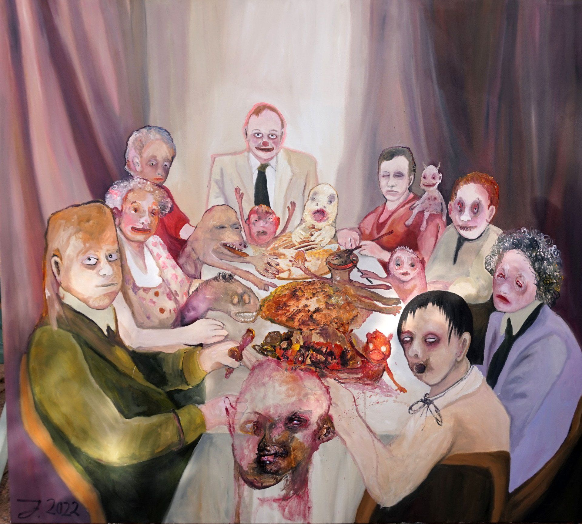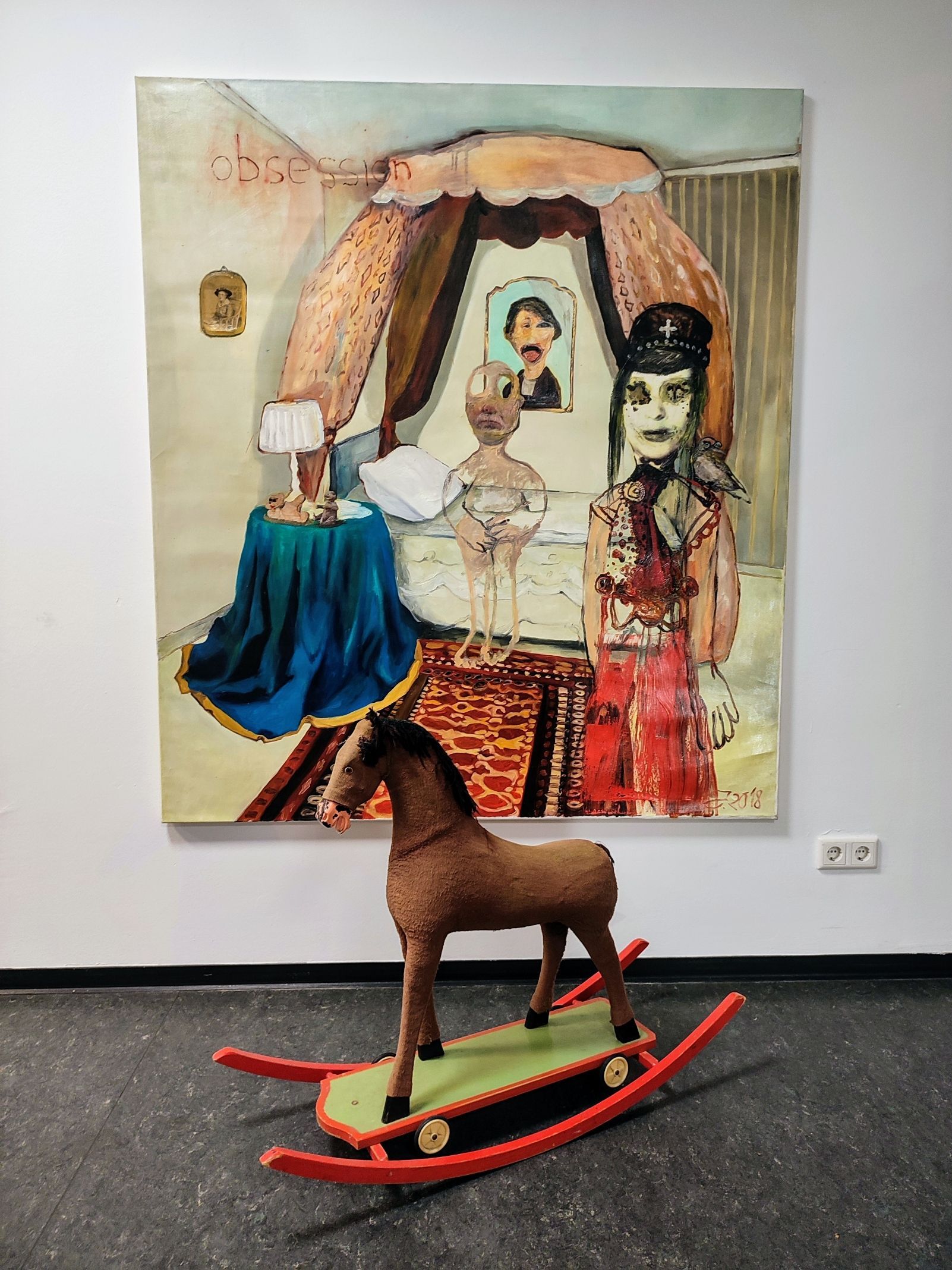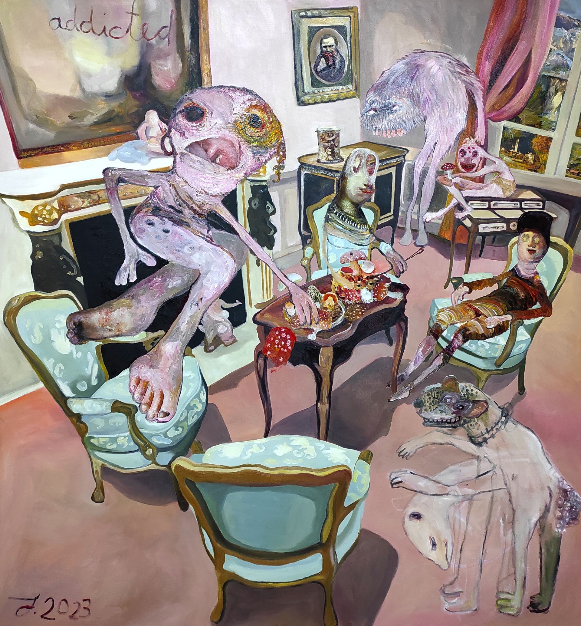 I´m inspired by the following artists. Francis Bacon, Paul Mc Carthy, Georg Grosz, Cindy Sherman but I`m not very ambitious in art history, so I often work very free without having some imaginations from other artists in my mind. I think that is the reason of the independence of my paintings. In my education, during my studies I learned a lot about Georg Grosz. I try to make satire paintings for the present time, we live in today.