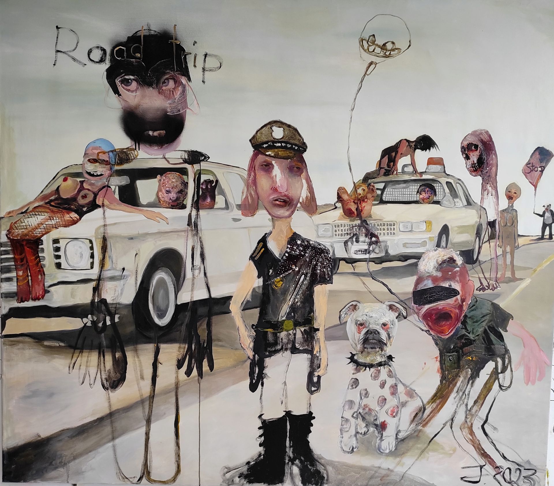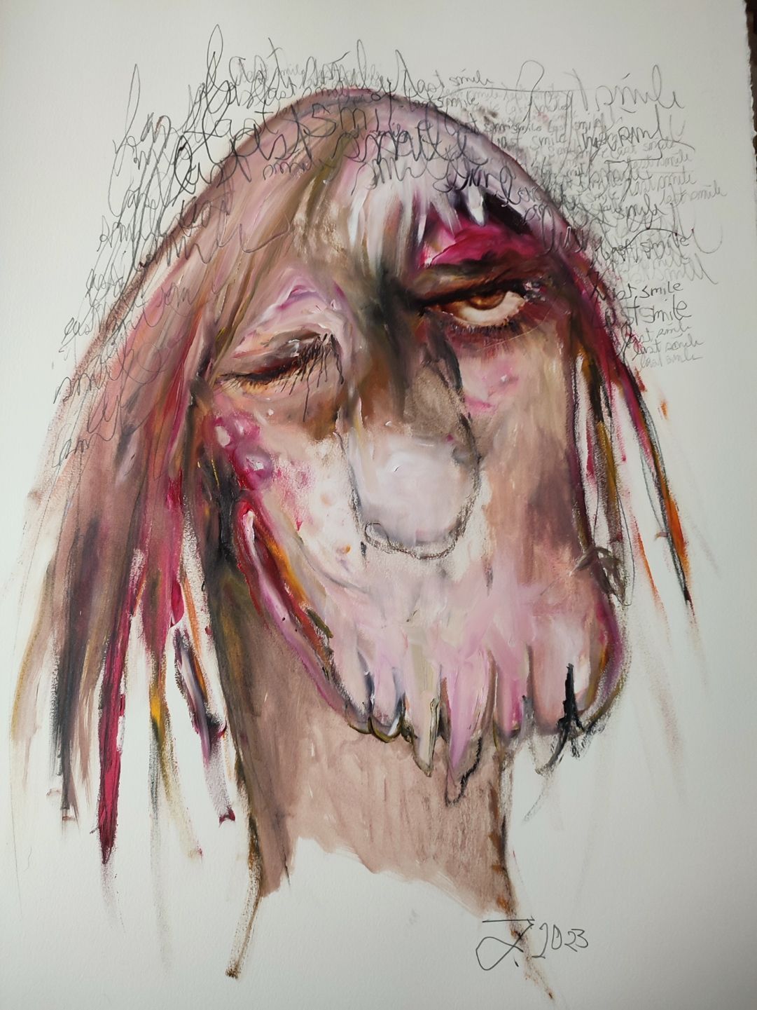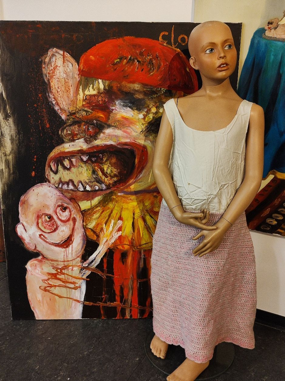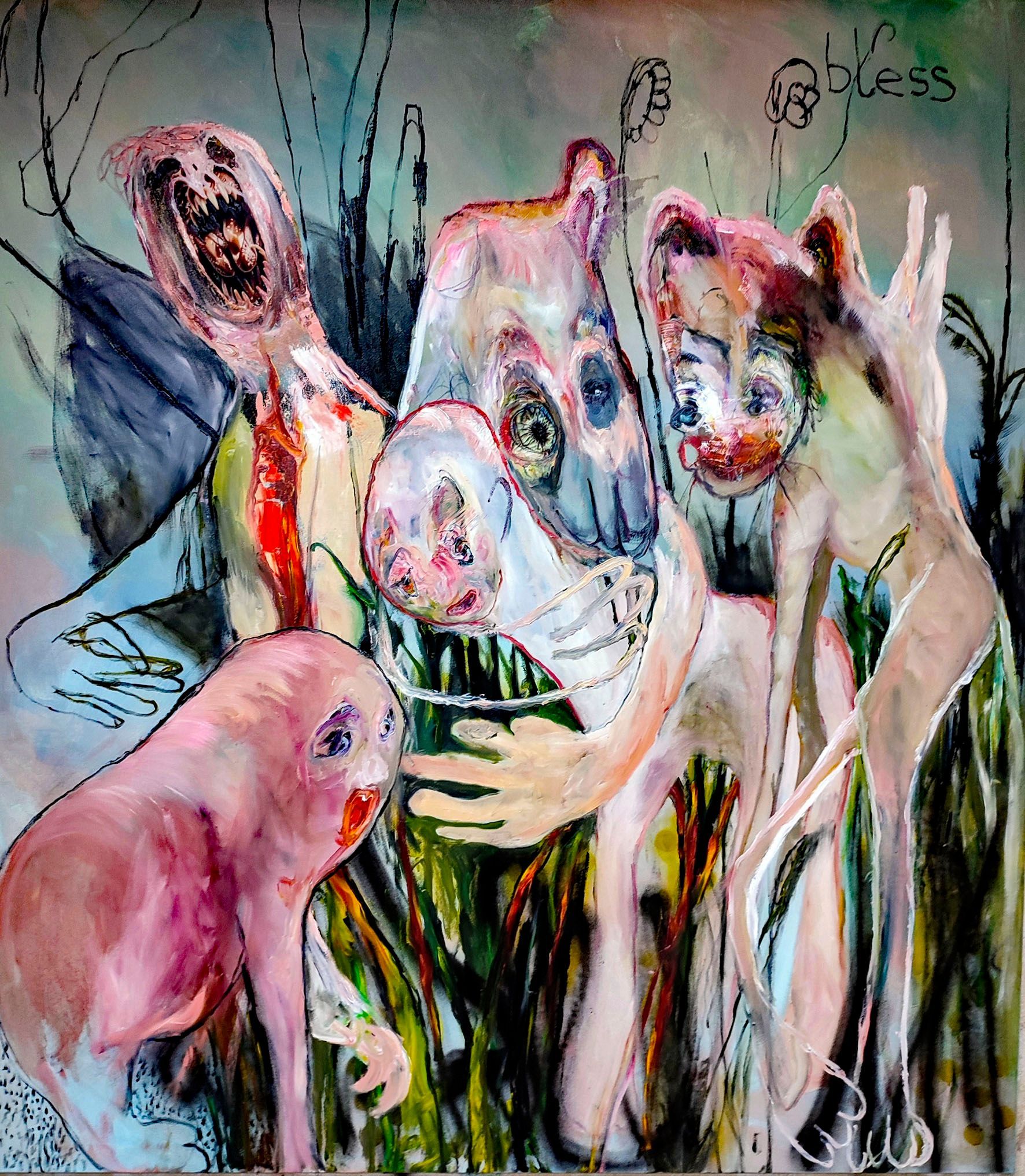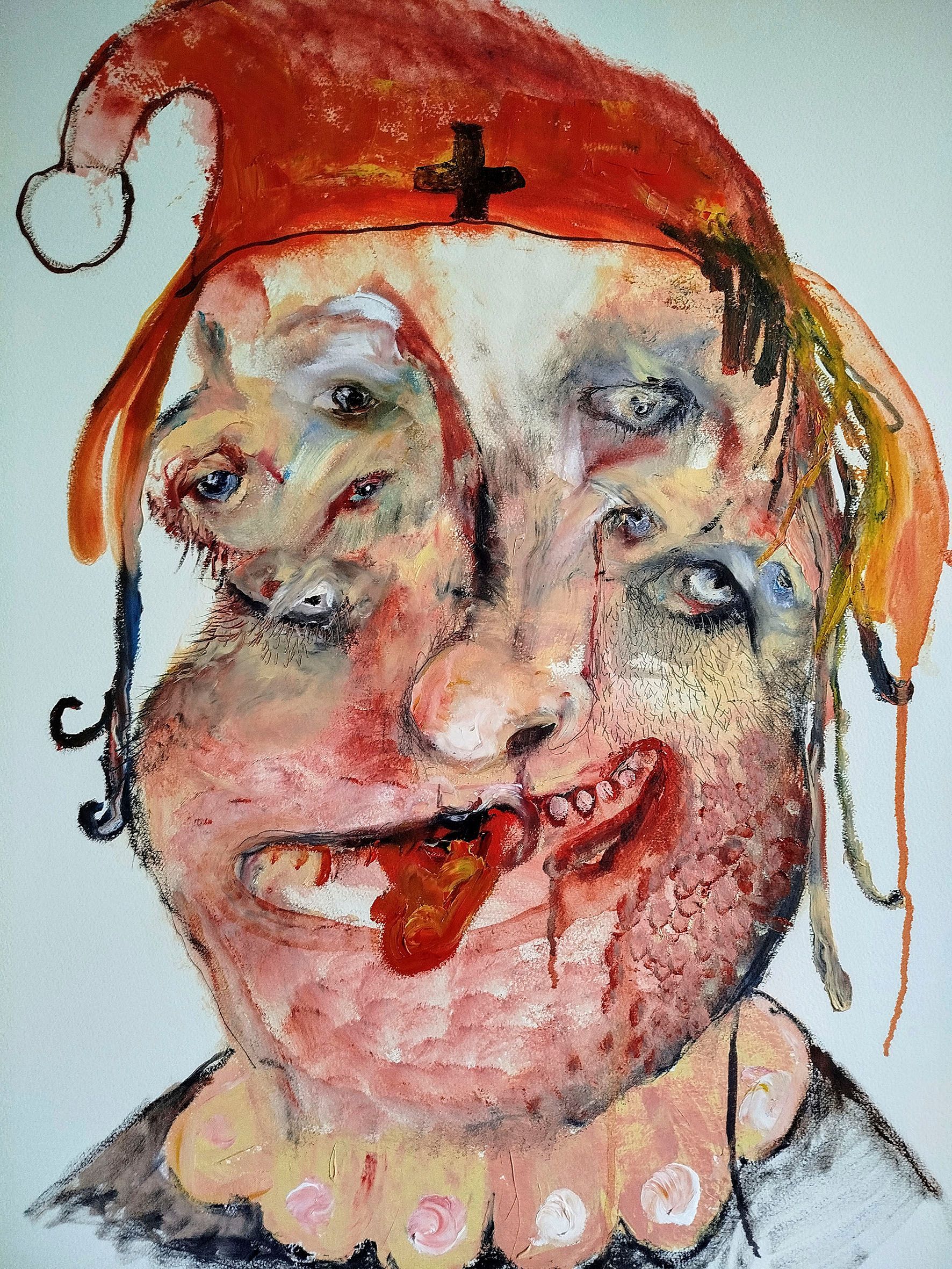 I´m inspired by the following artists. Francis Bacon, Paul Mc Carthy, Georg Grosz, Cindy Sherman but I`m not very ambitious in art history, so I often work very free without having some imaginations from other artists in my mind. I think that is the reason of the independence of my paintings. In my education, during my studies I learned a lot about Georg Grosz. I try to make satire paintings for the present time, we live in today.