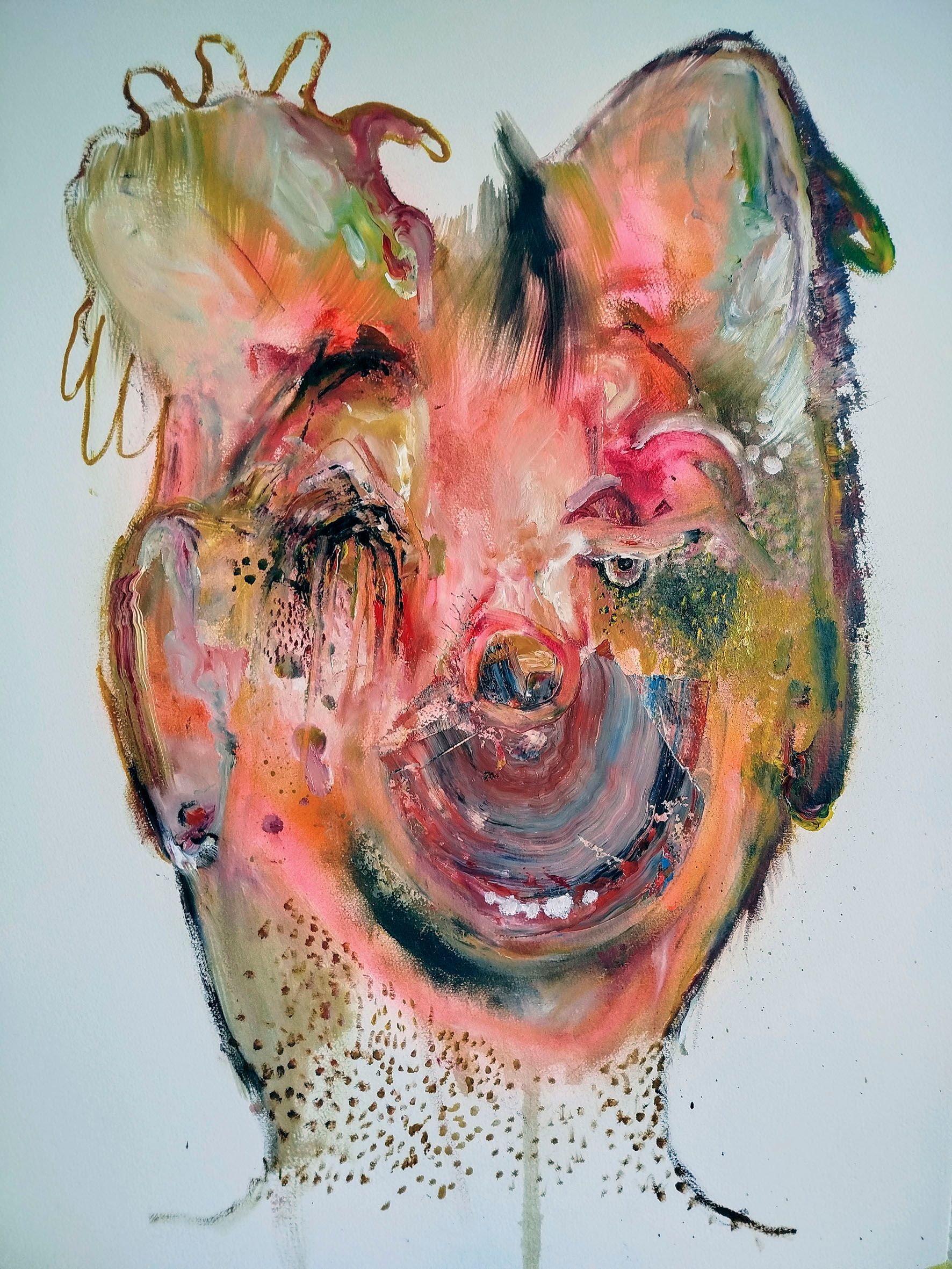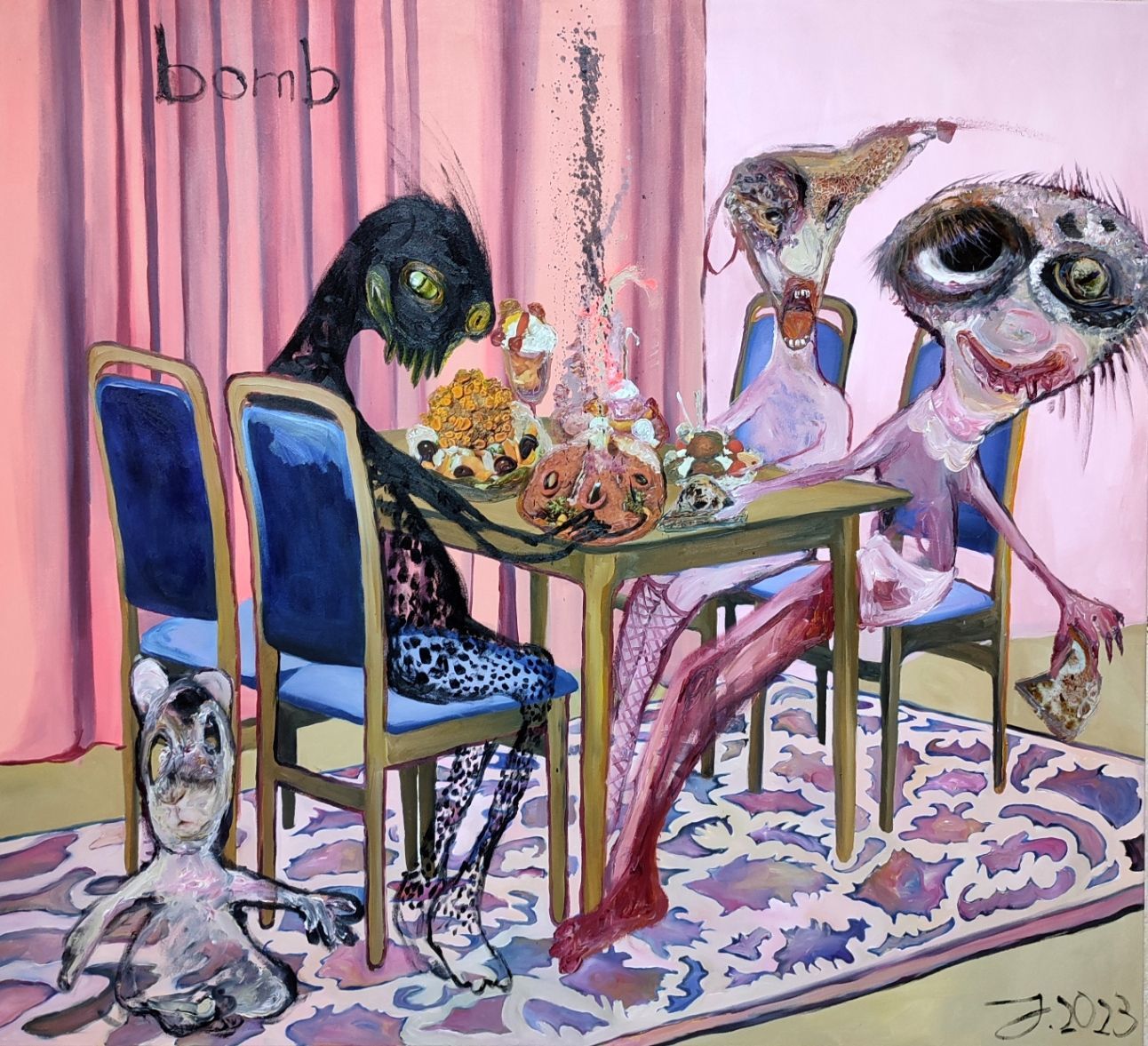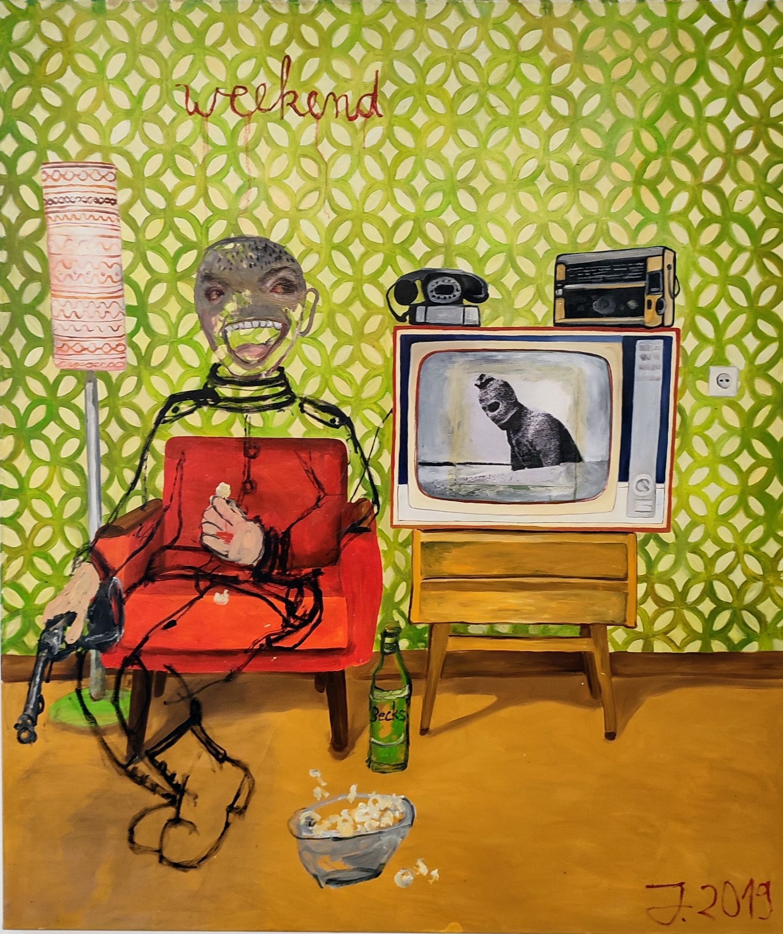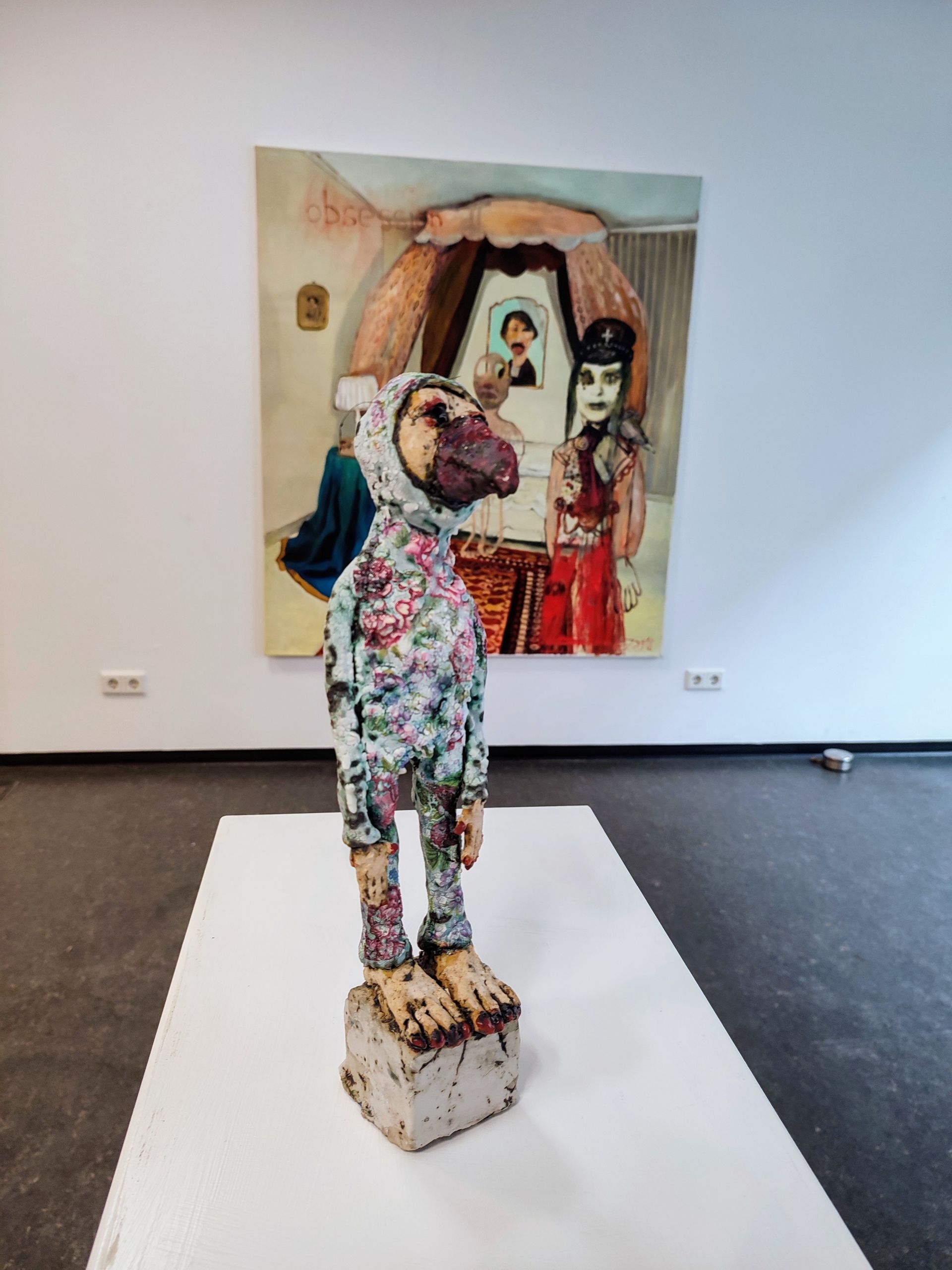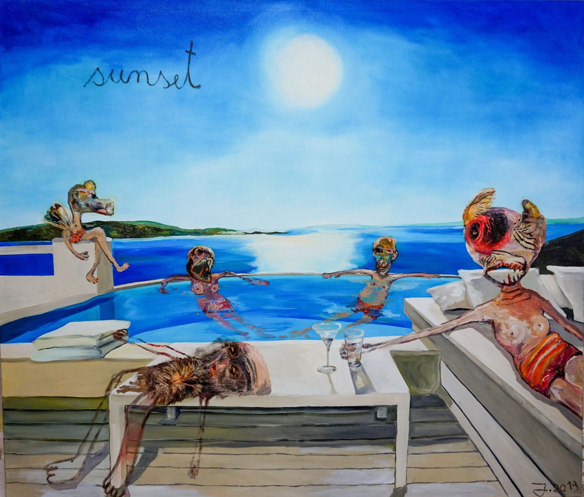 I´m inspired by the following artists. Francis Bacon, Paul Mc Carthy, Georg Grosz, Cindy Sherman but I`m not very ambitious in art history, so I often work very free without having some imaginations from other artists in my mind. I think that is the reason of the independence of my paintings. In my education, during my studies I learned a lot about Georg Grosz. I try to make satire paintings for the present time, we live in today.