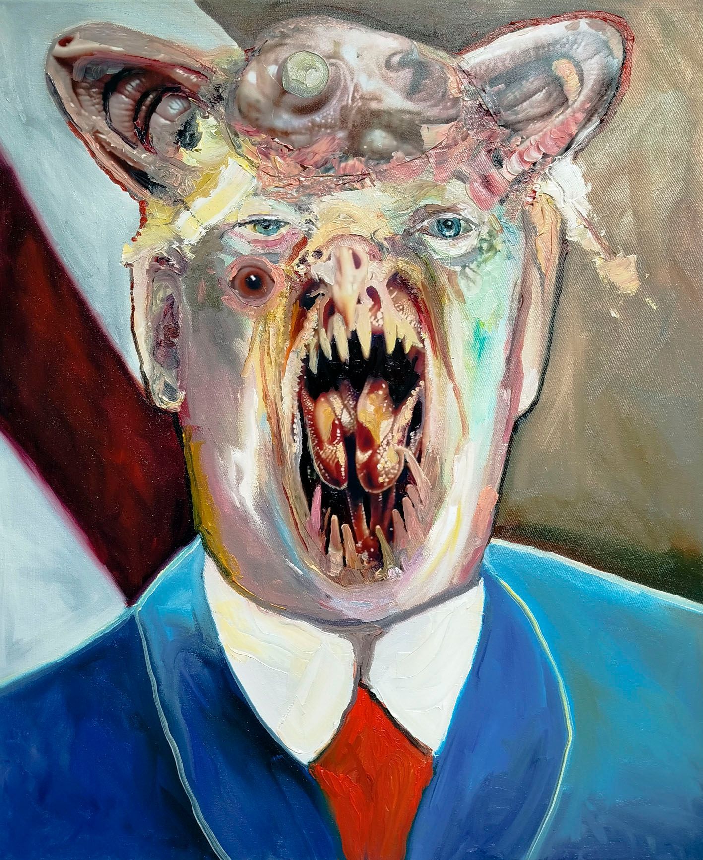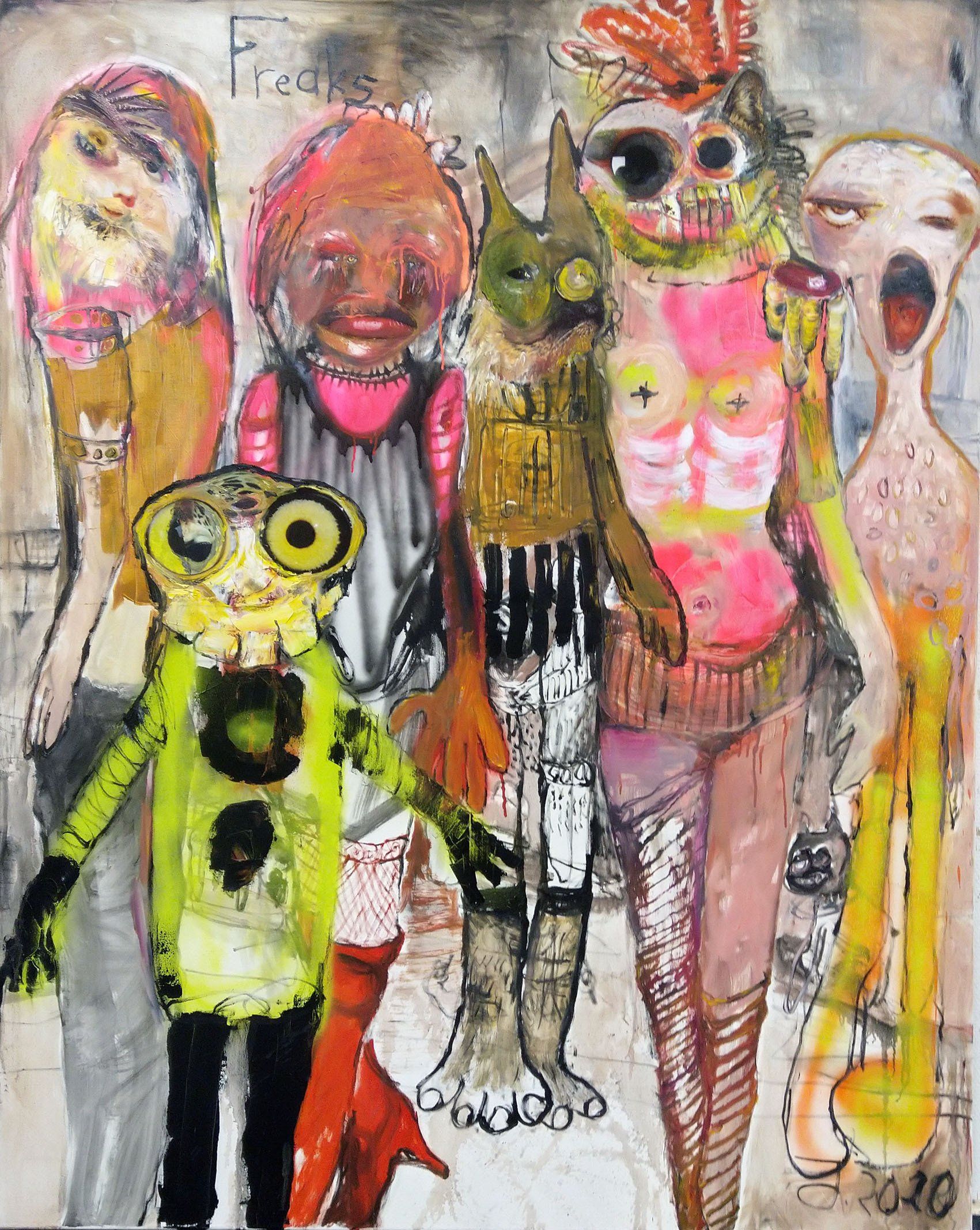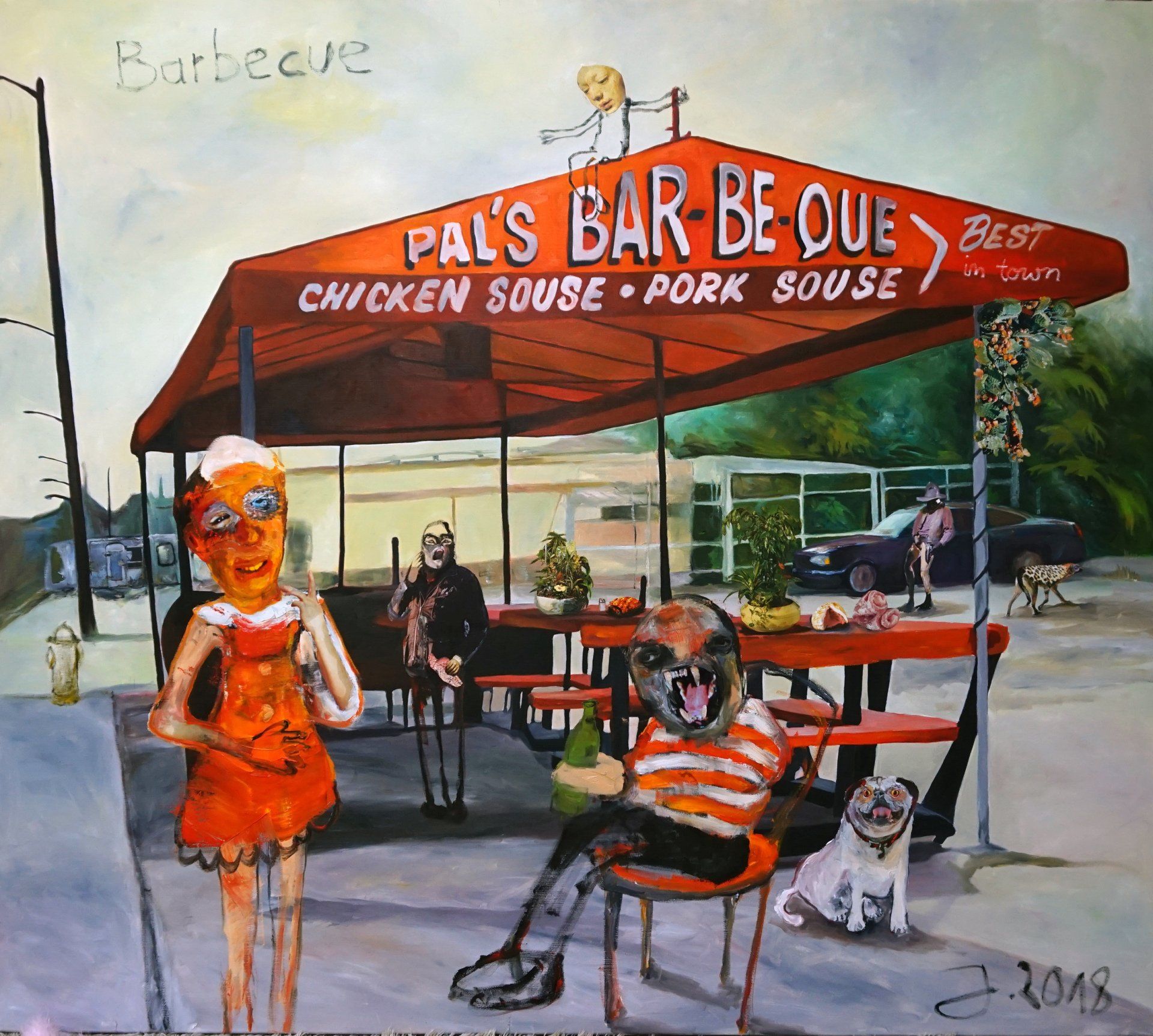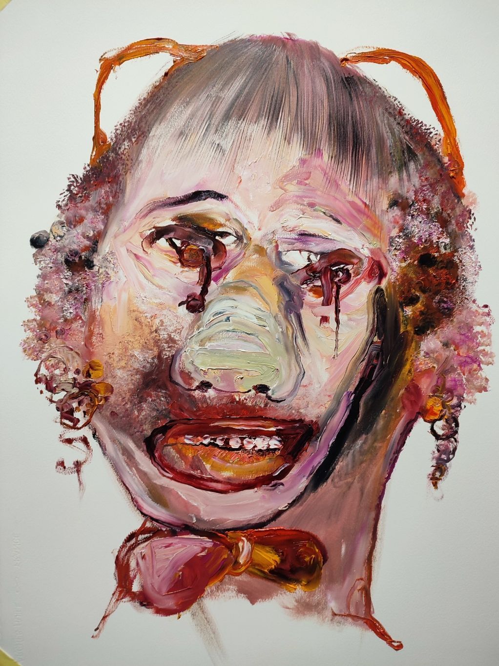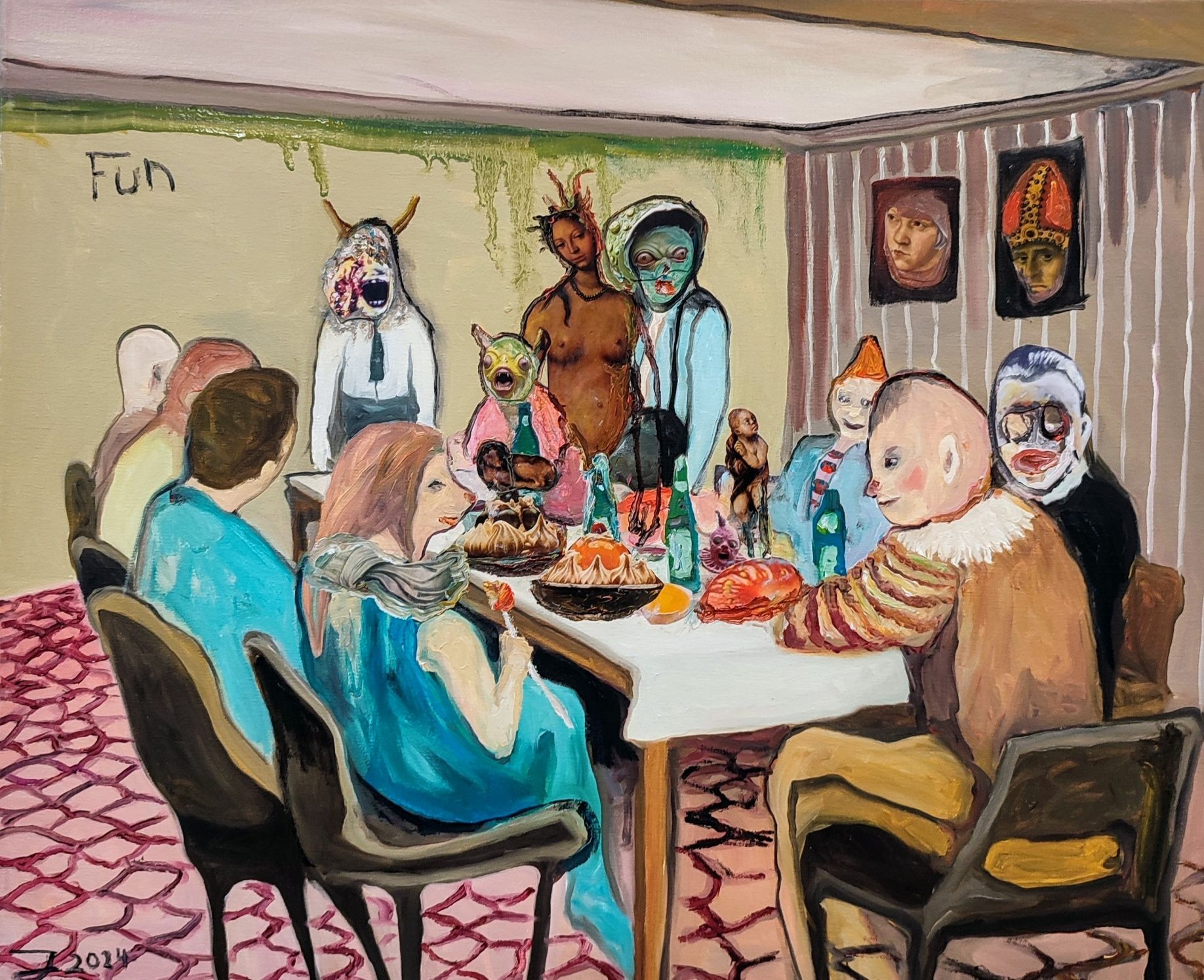 I´m inspired by the following artists. Francis Bacon, Paul Mc Carthy, Georg Grosz, Cindy Sherman but I`m not very ambitious in art history, so I often work very free without having some imaginations from other artists in my mind. I think that is the reason of the independence of my paintings. In my education, during my studies I learned a lot about Georg Grosz. I try to make satire paintings for the present time, we live in today.
