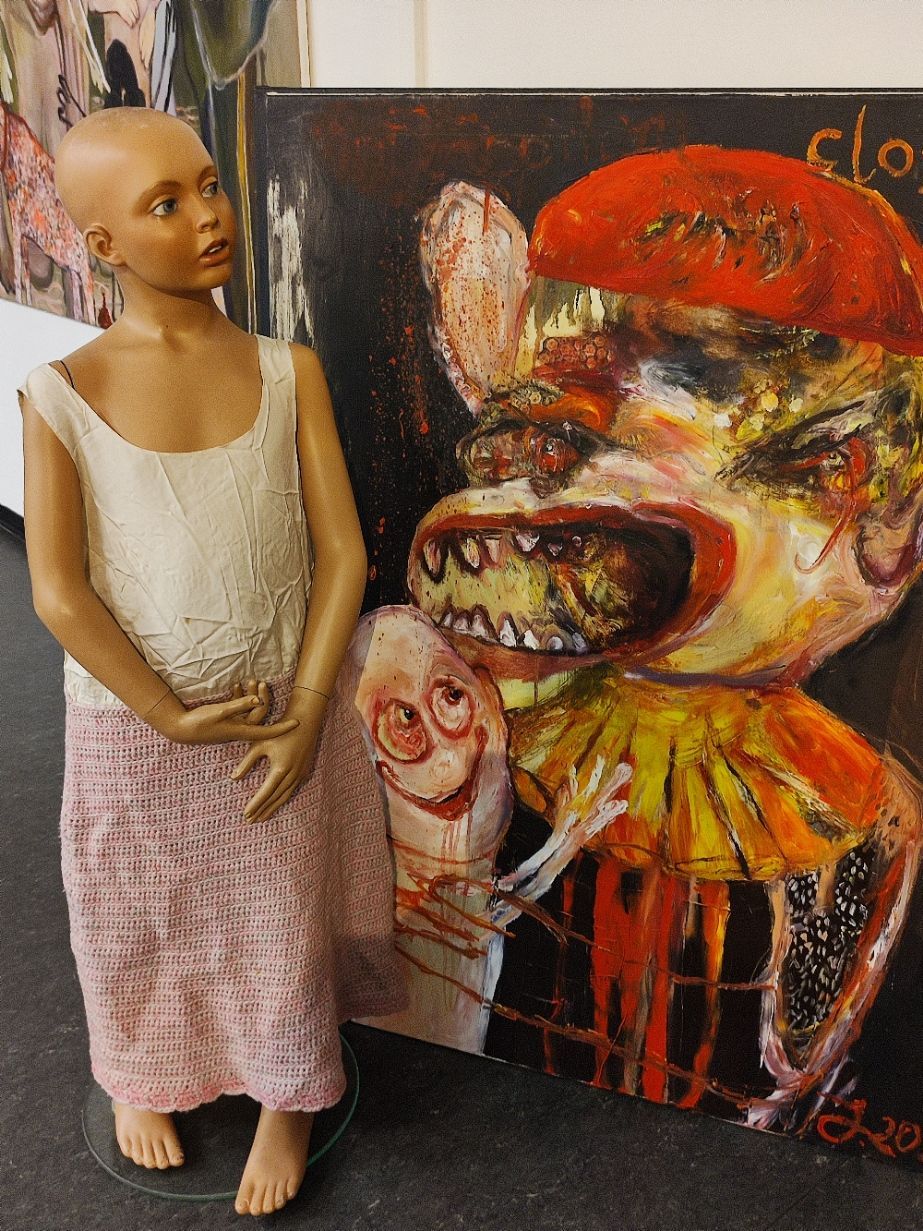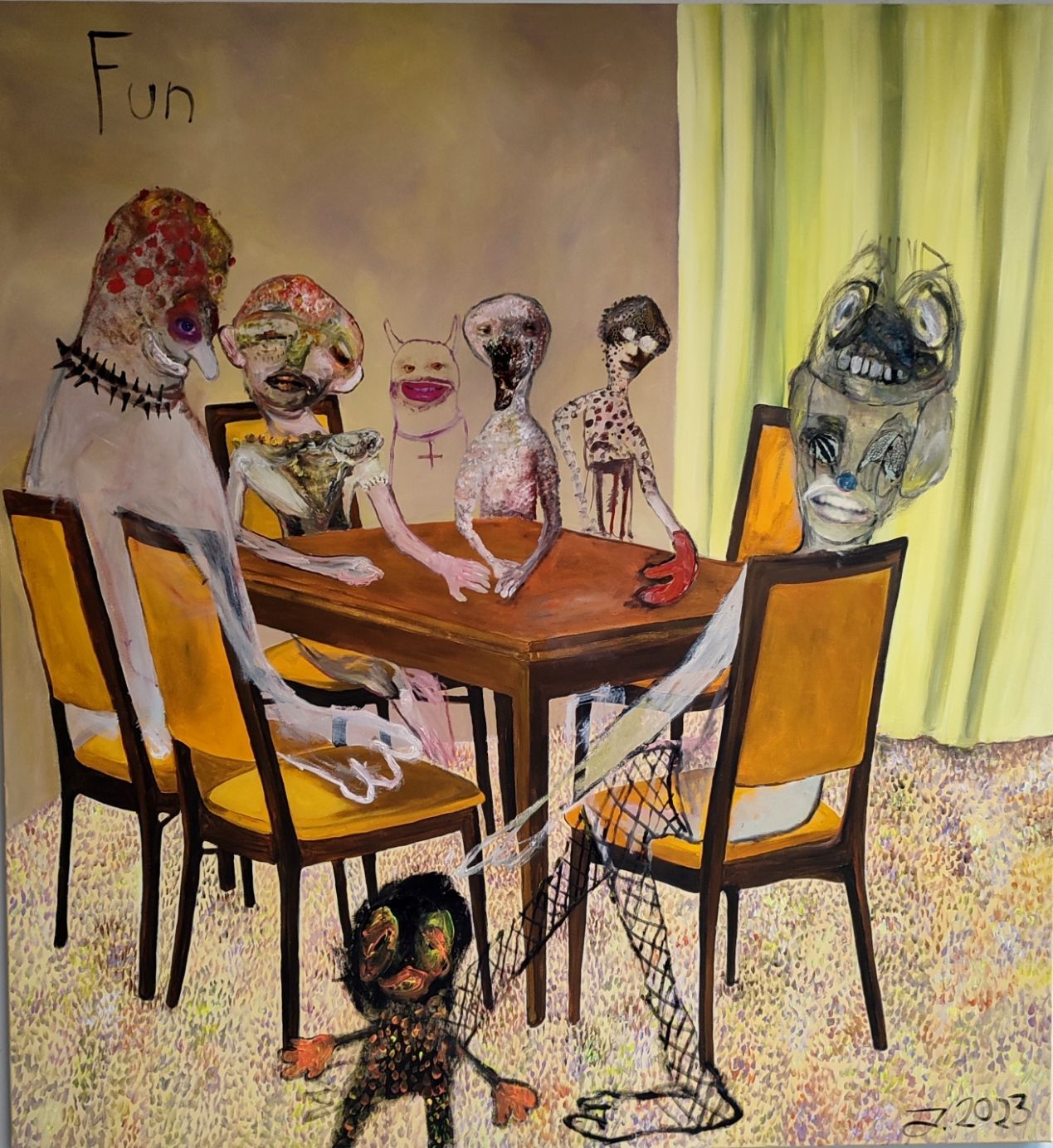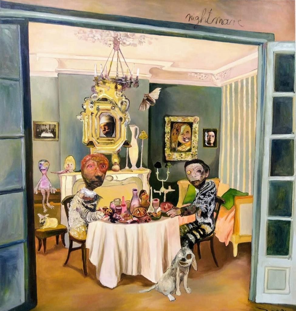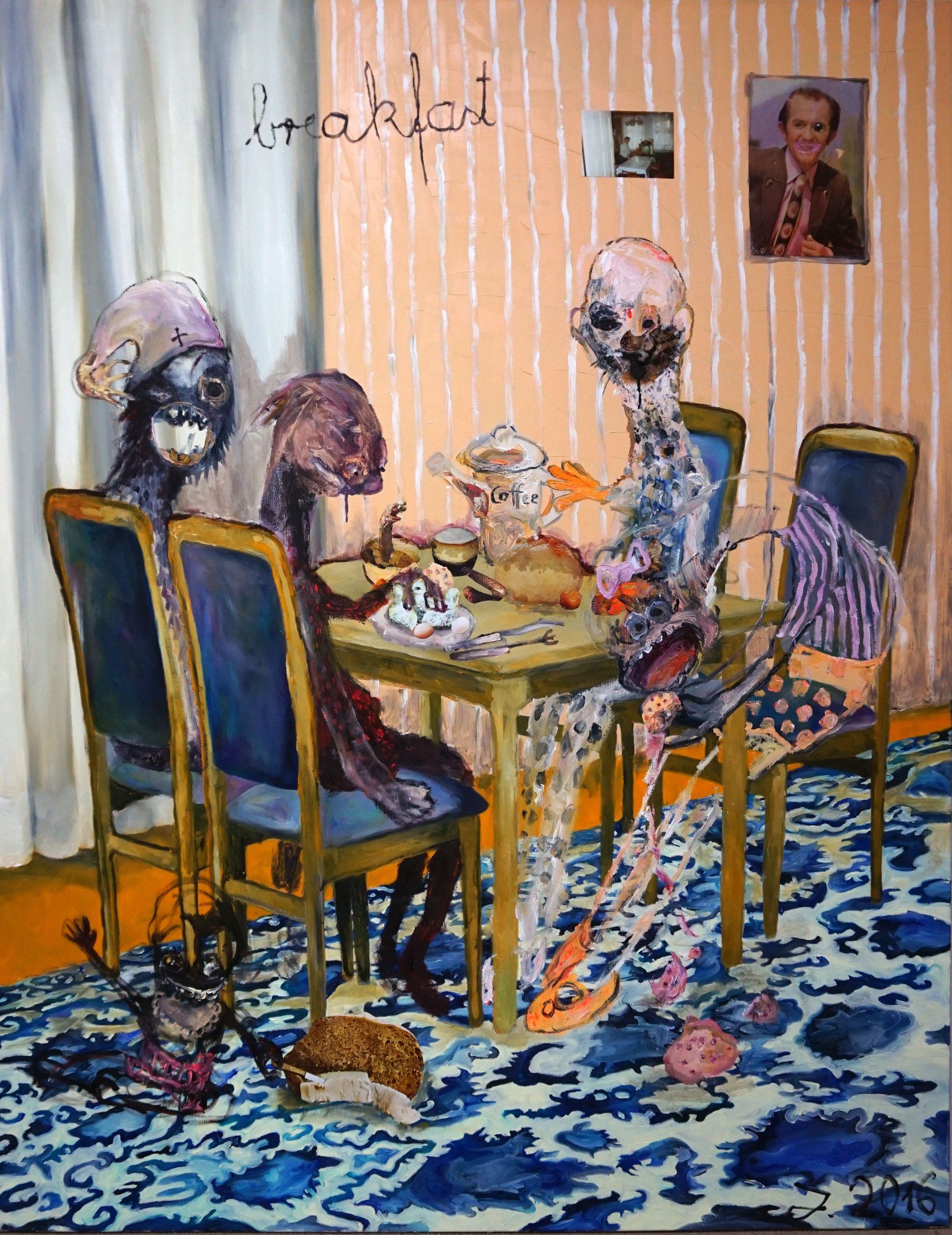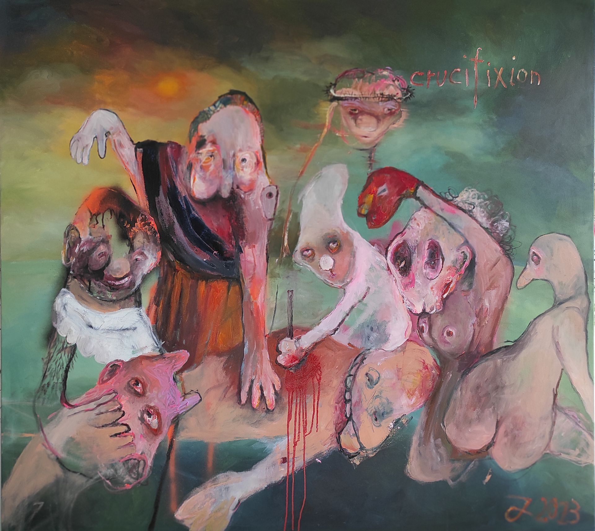 I´m inspired by the following artists. Francis Bacon, Paul Mc Carthy, Georg Grosz, Cindy Sherman but I`m not very ambitious in art history, so I often work very free without having some imaginations from other artists in my mind. I think that is the reason of the independence of my paintings. In my education, during my studies I learned a lot about Georg Grosz. I try to make satire paintings for the present time, we live in today.