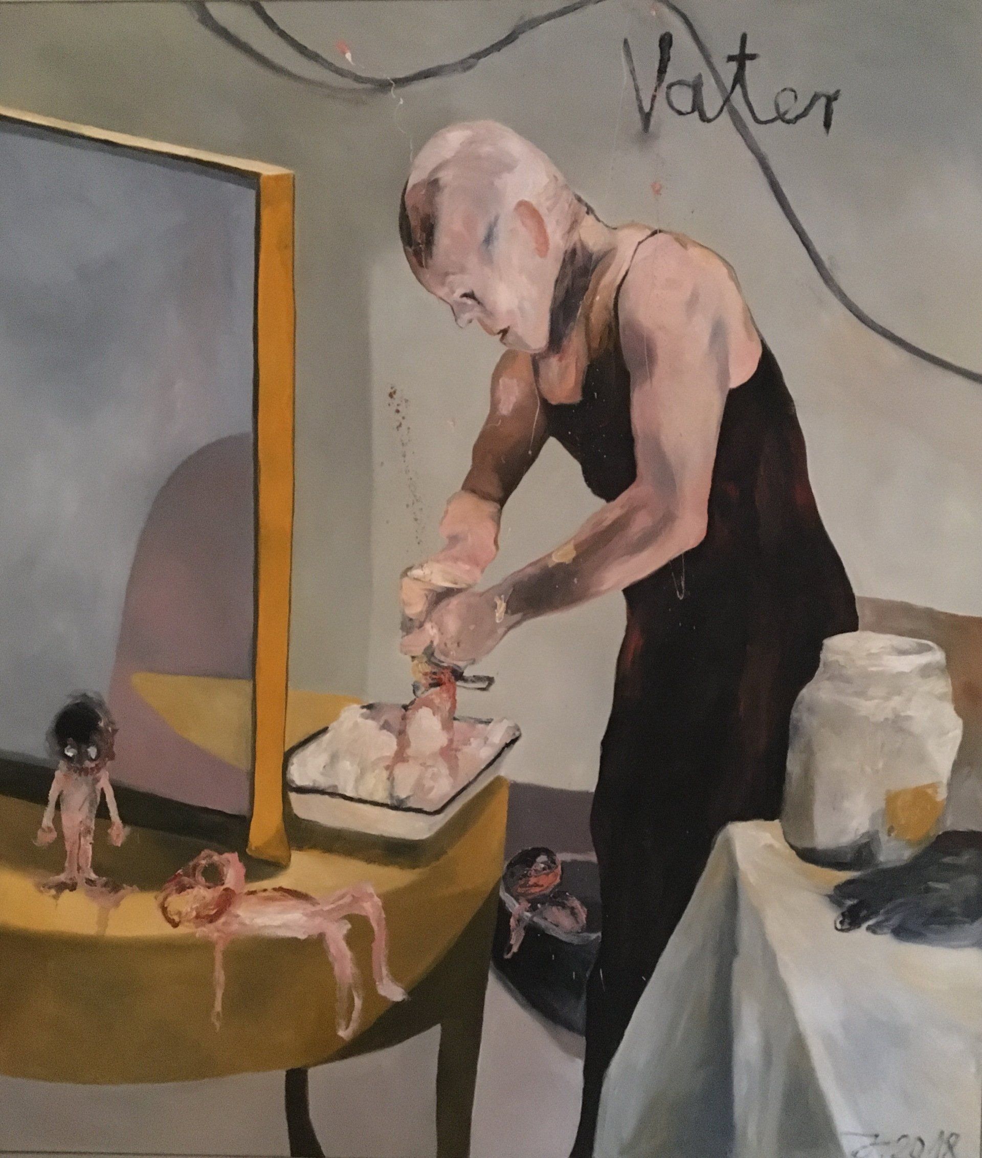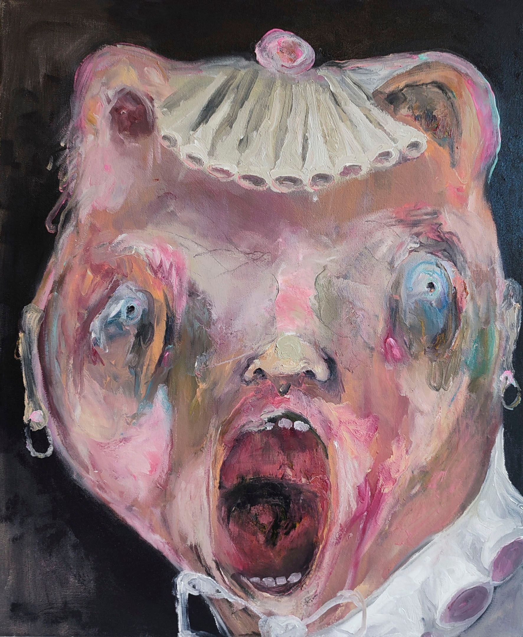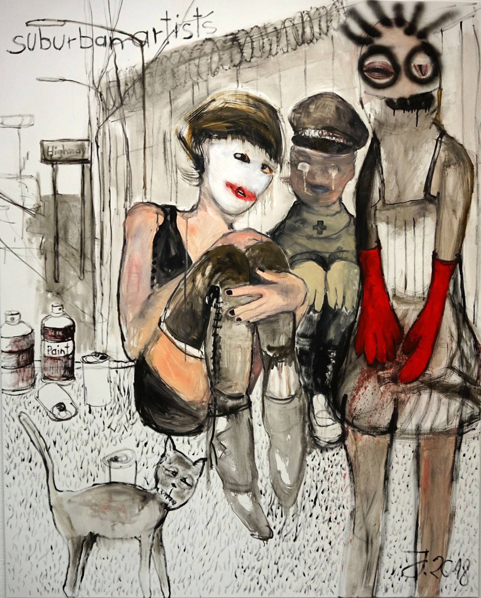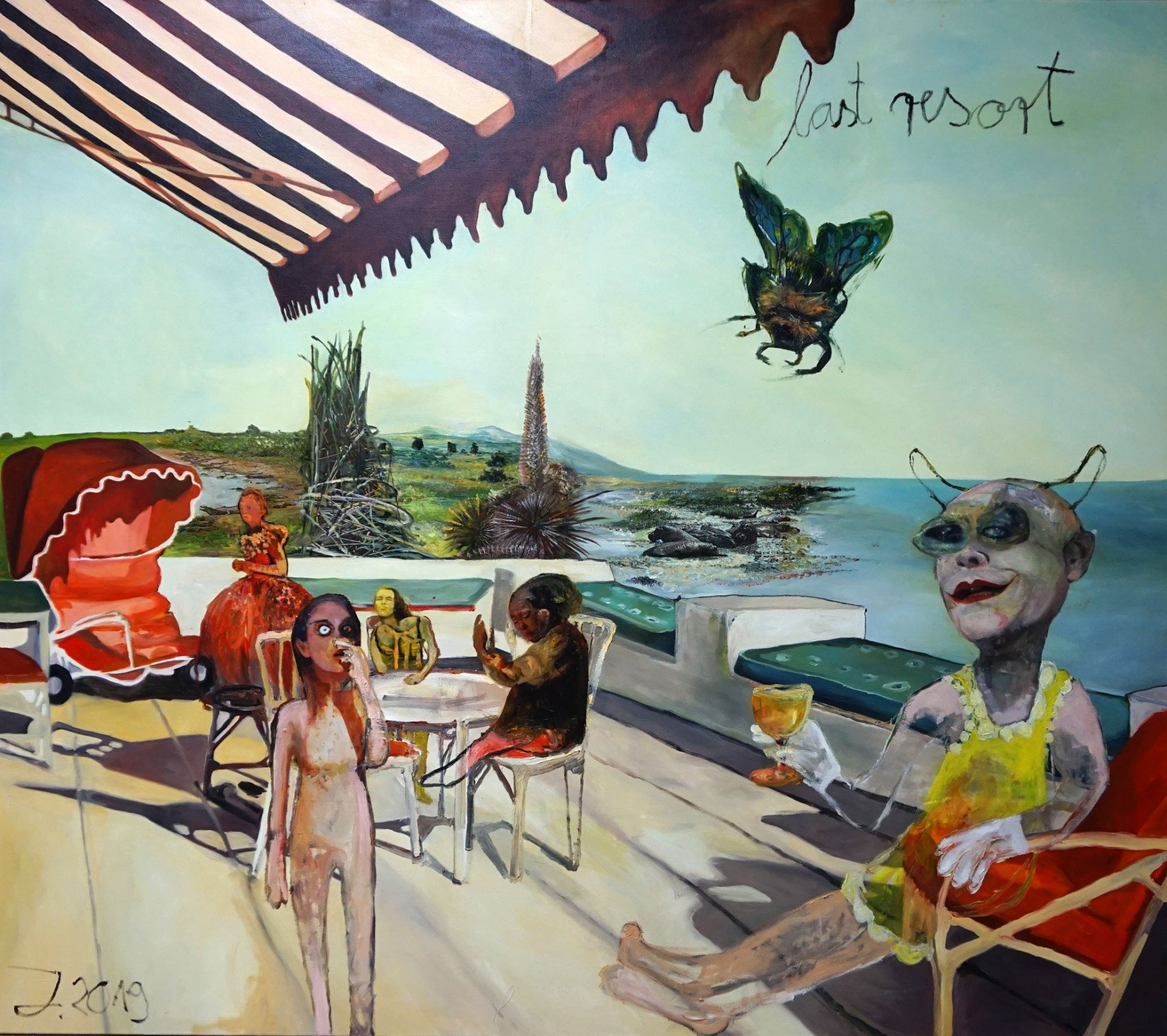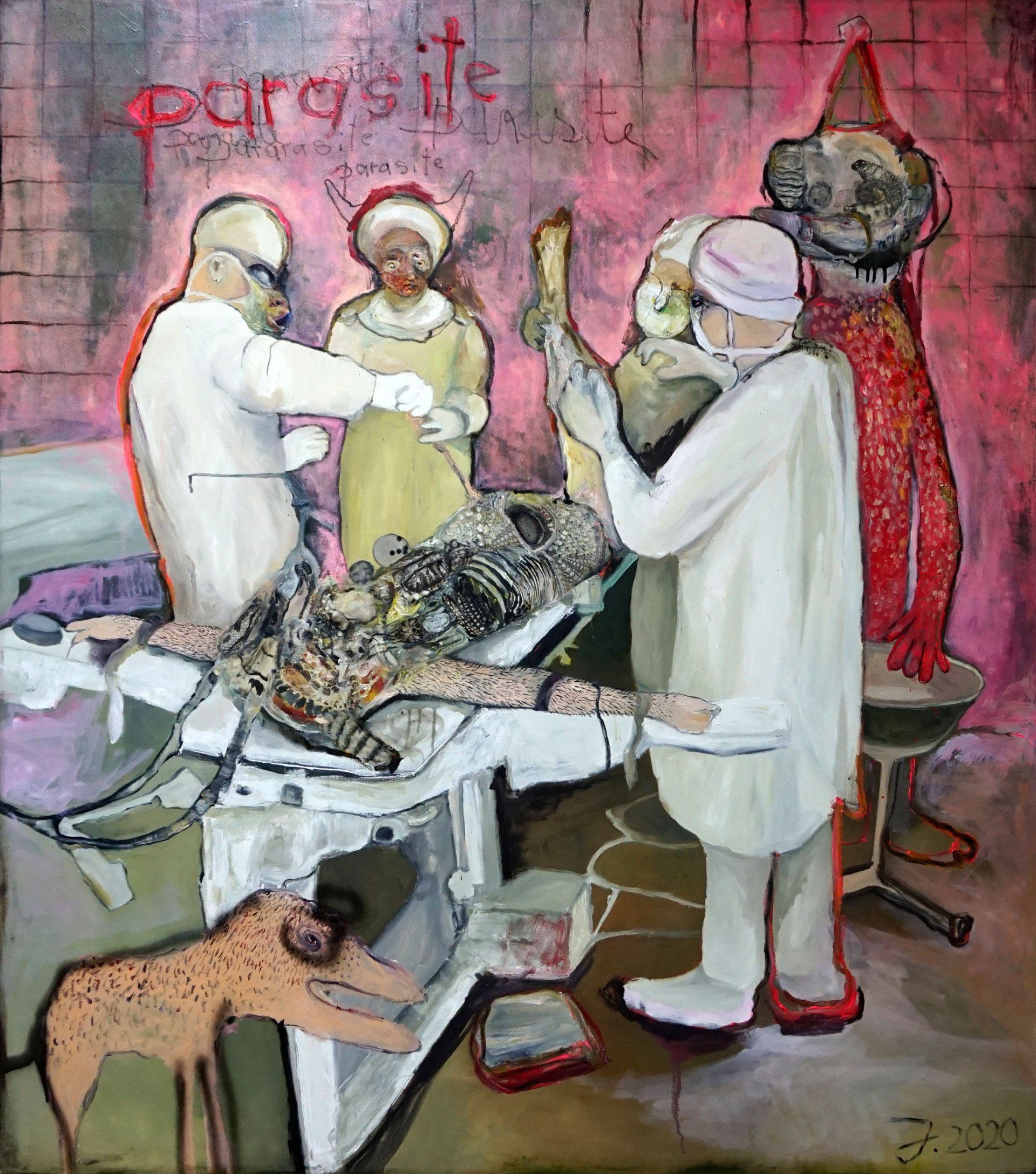 I´m inspired by the following artists. Francis Bacon, Paul Mc Carthy, Georg Grosz, Cindy Sherman but I`m not very ambitious in art history, so I often work very free without having some imaginations from other artists in my mind. I think that is the reason of the independence of my paintings. In my education, during my studies I learned a lot about Georg Grosz. I try to make satire paintings for the present time, we live in today.