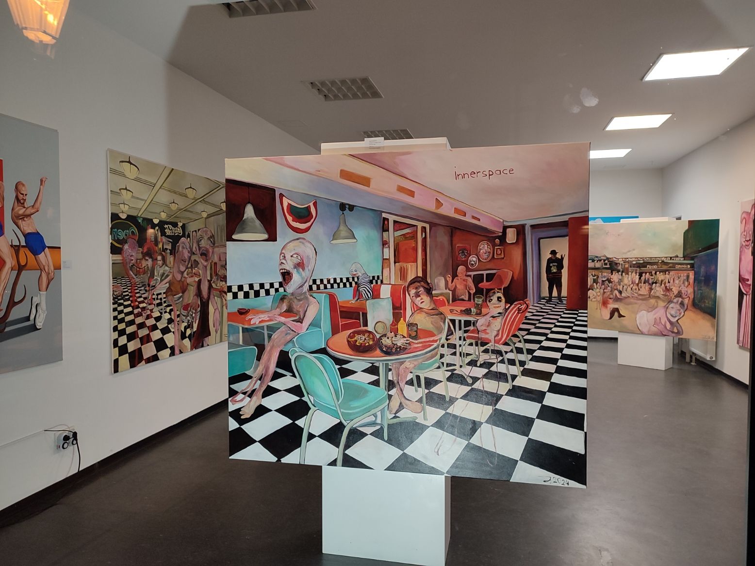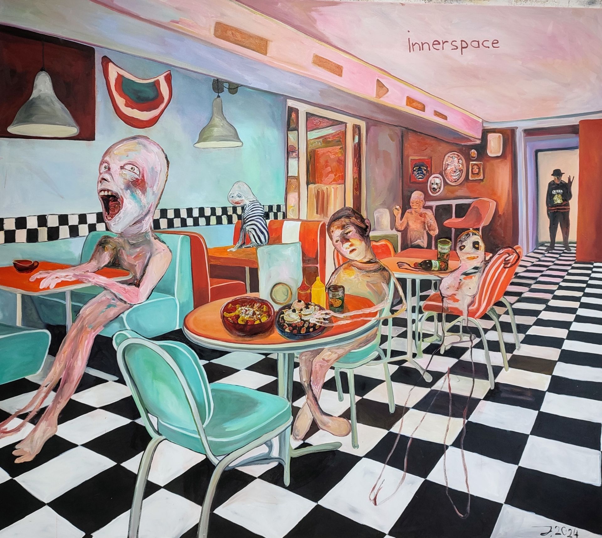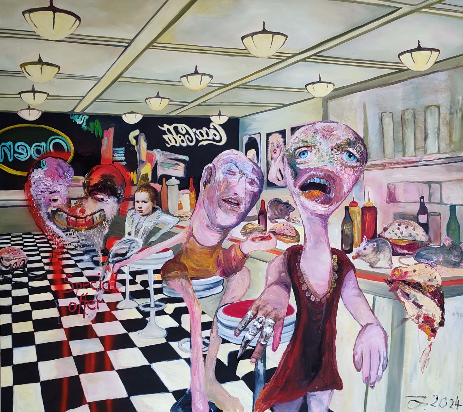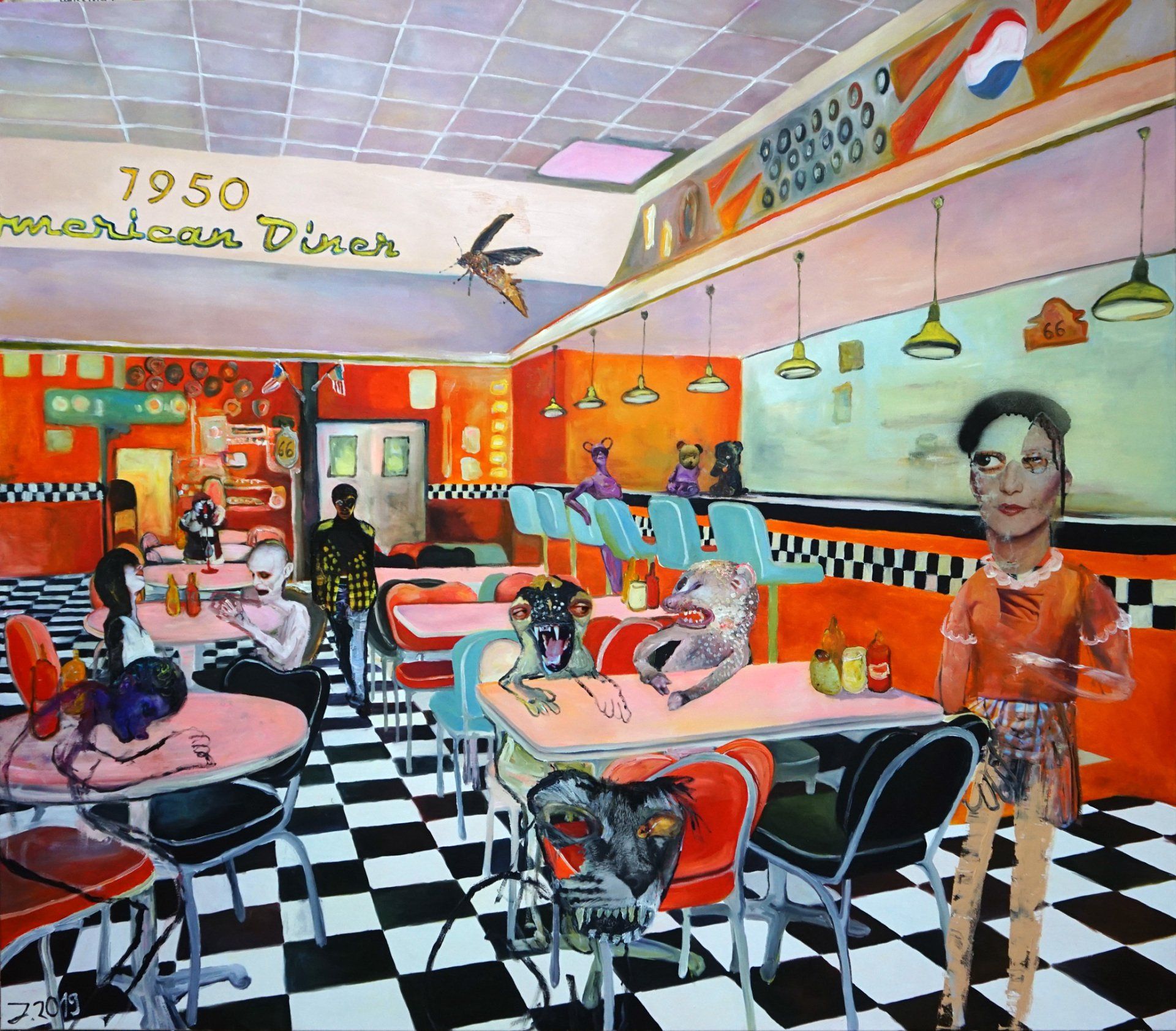 - American diner paintings, scenes with diners, strange scenes with eating people and creatures