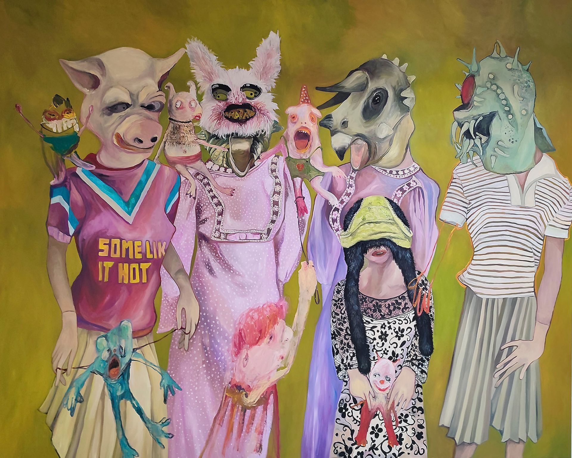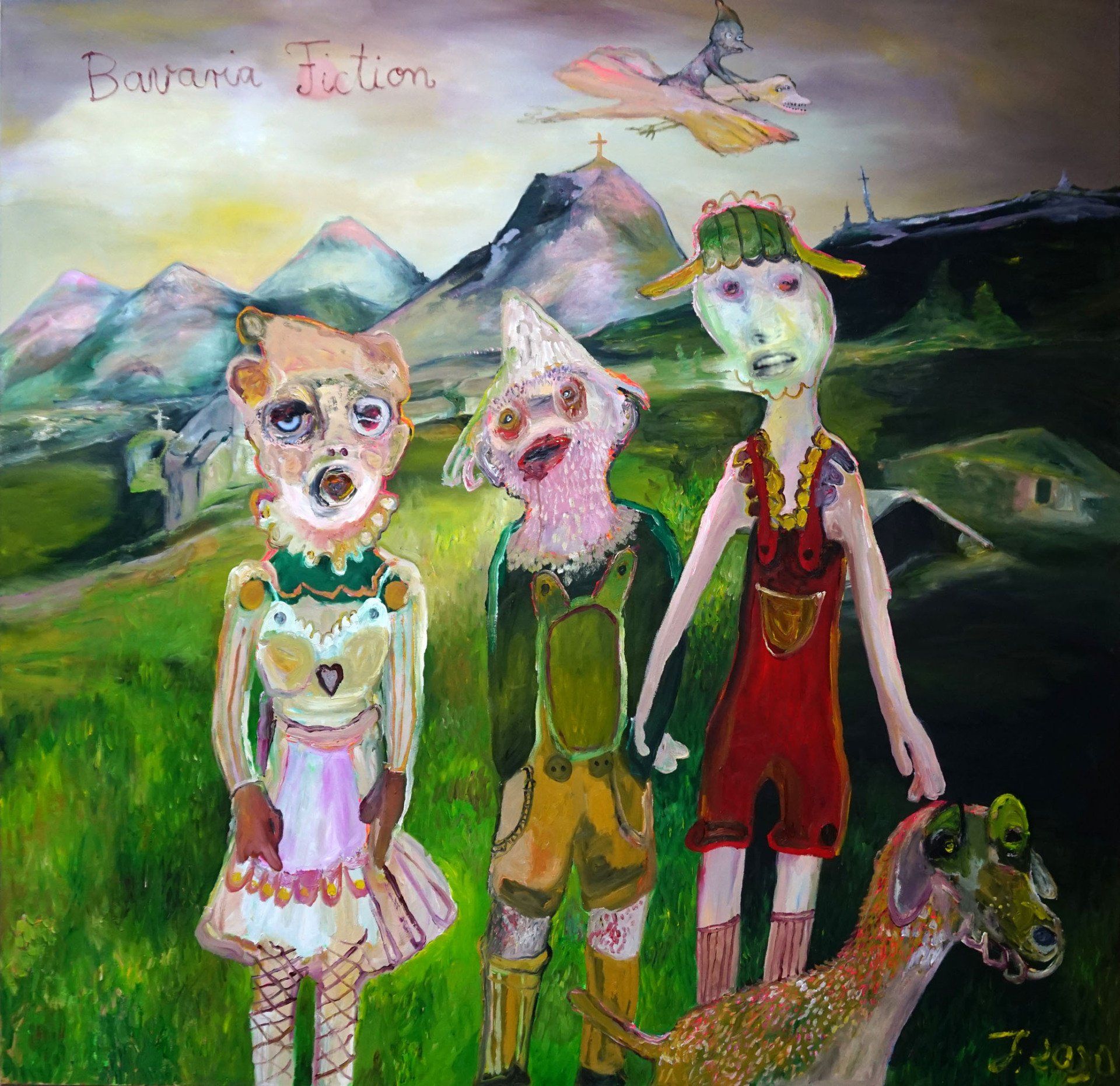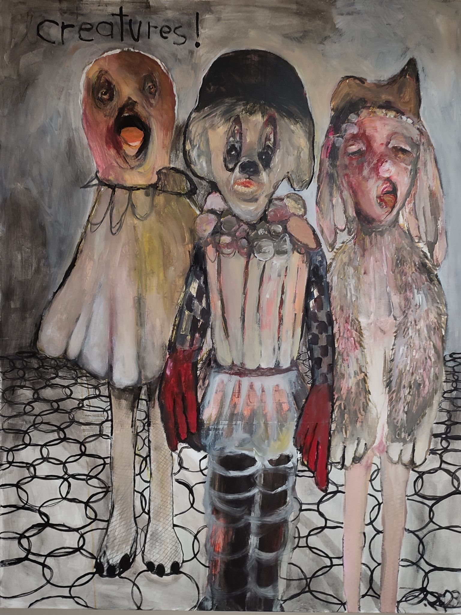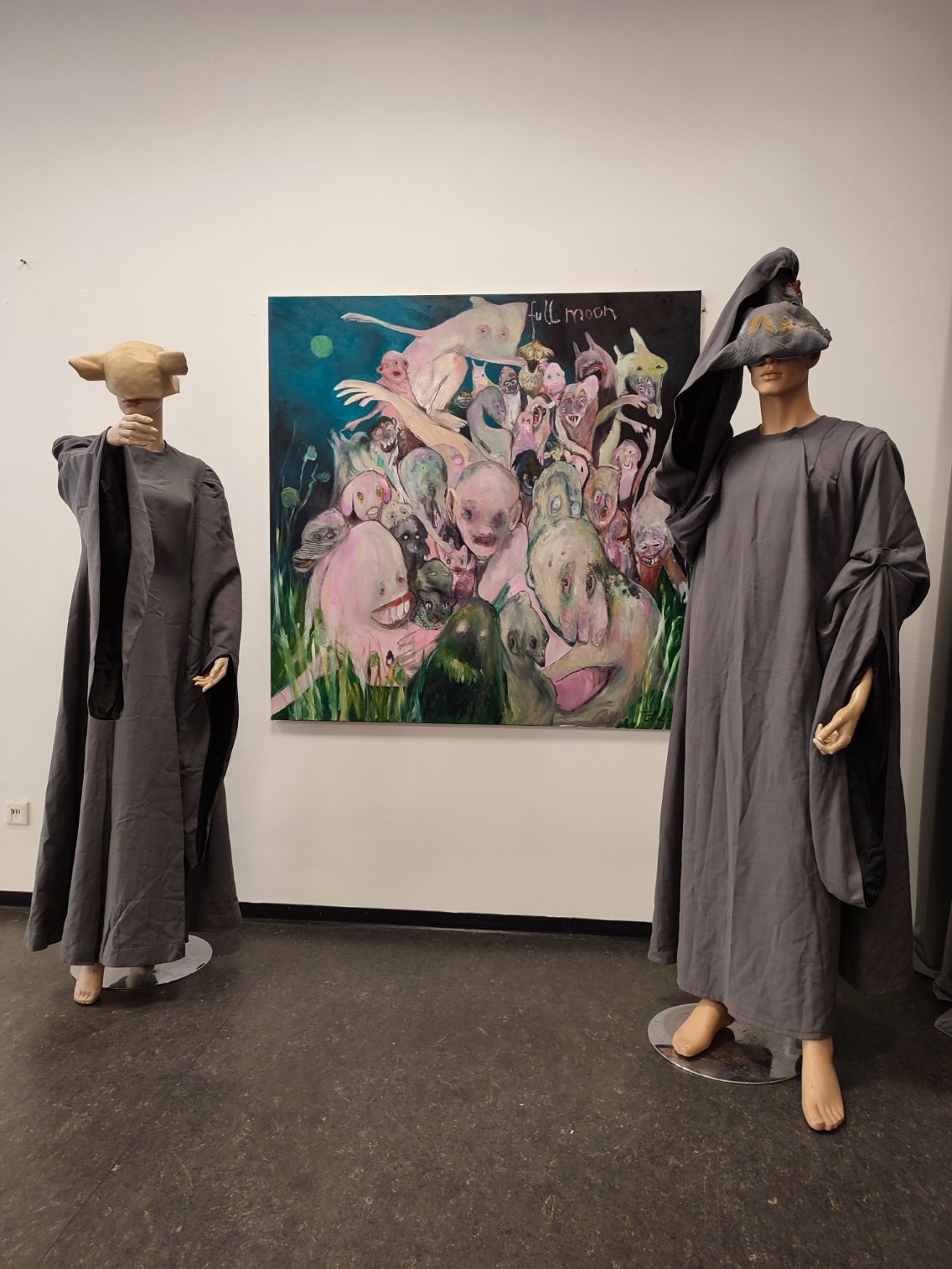 My works are very close to filmstills, like modern theater and when I`m painting I slip into a role to imagine and create the strange creatures I paint in my work.