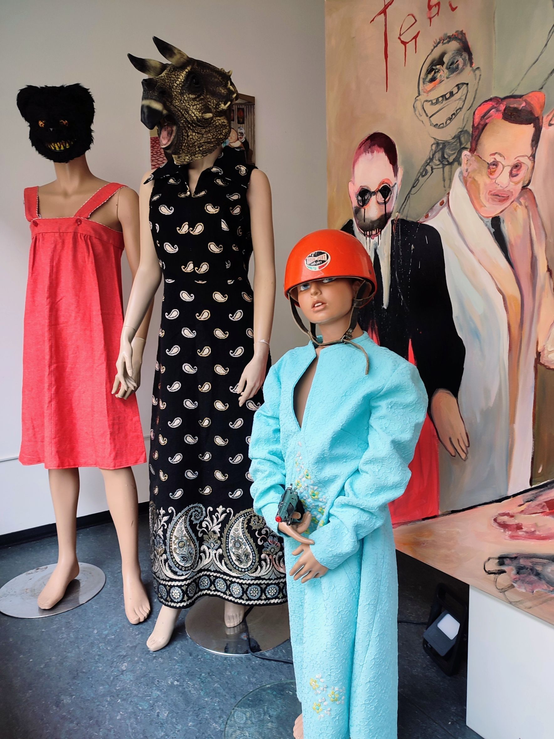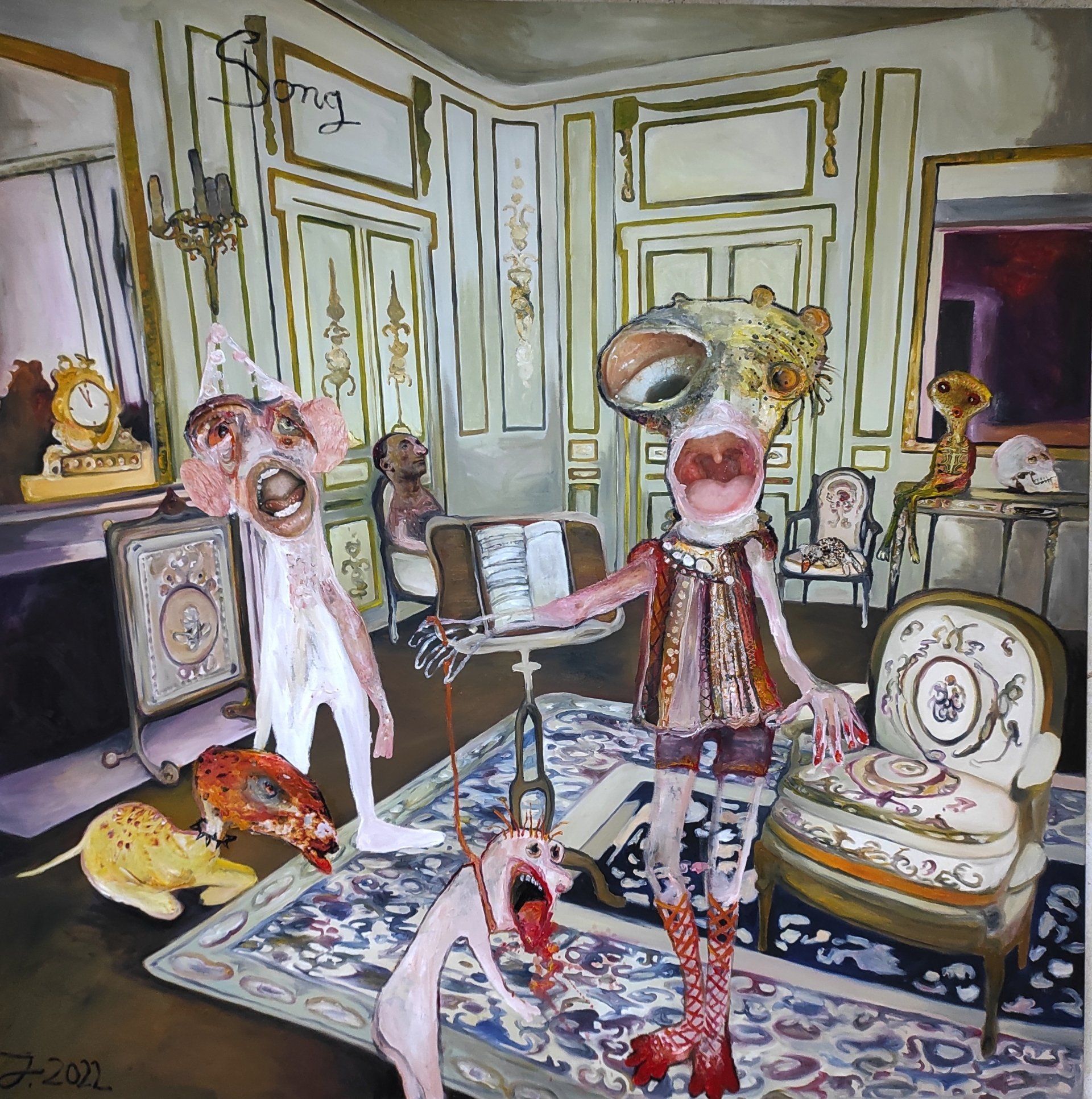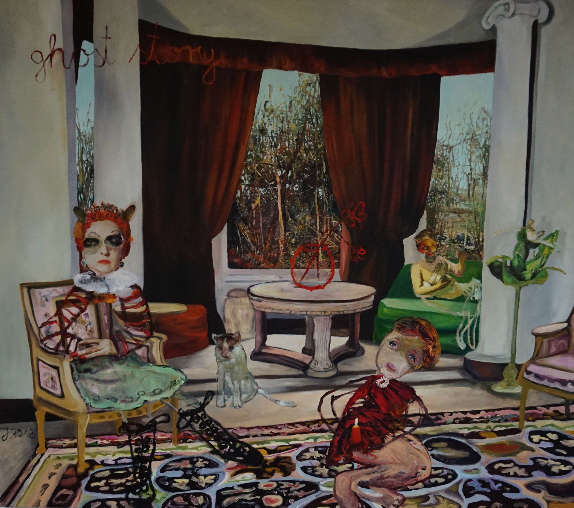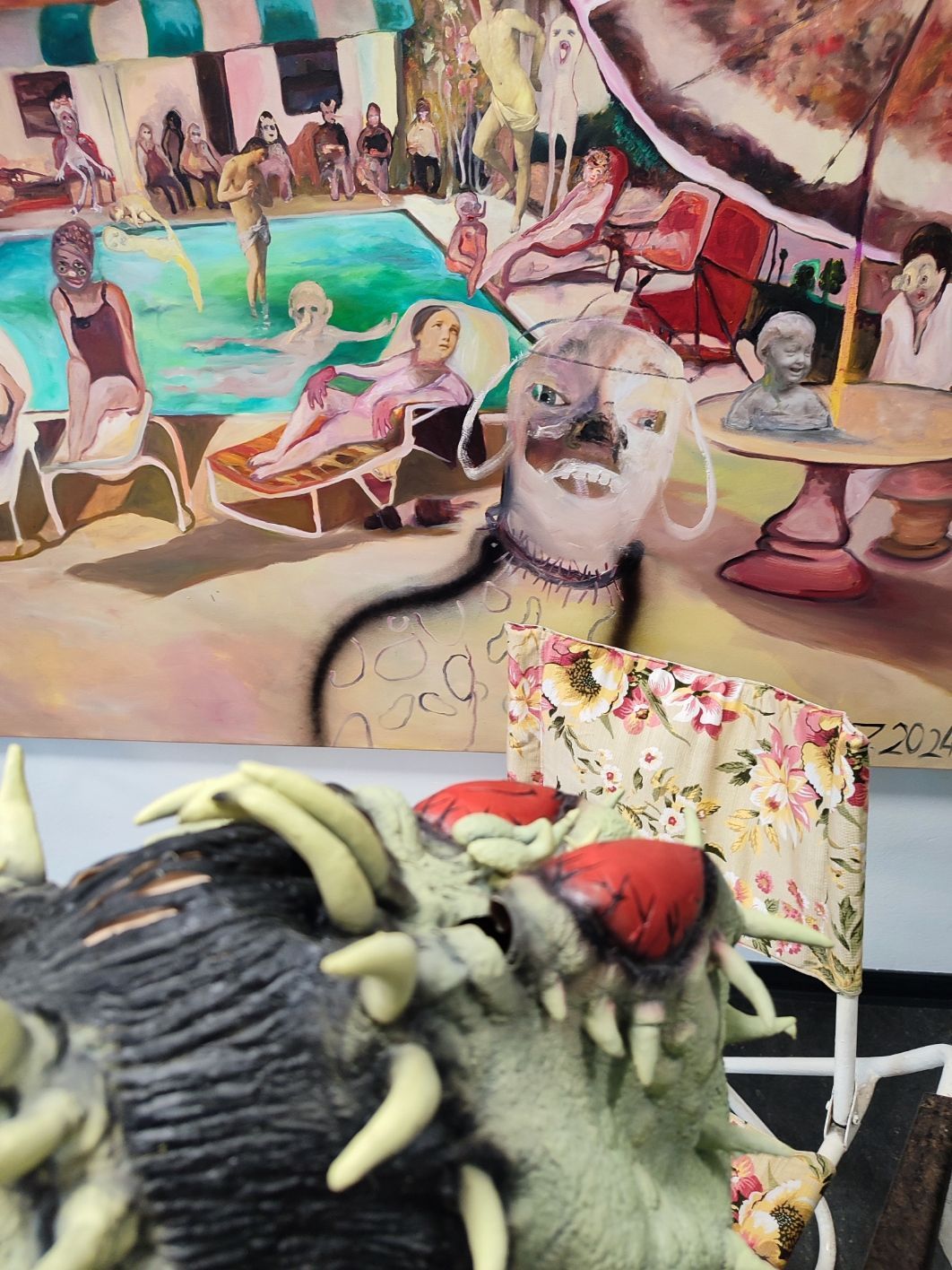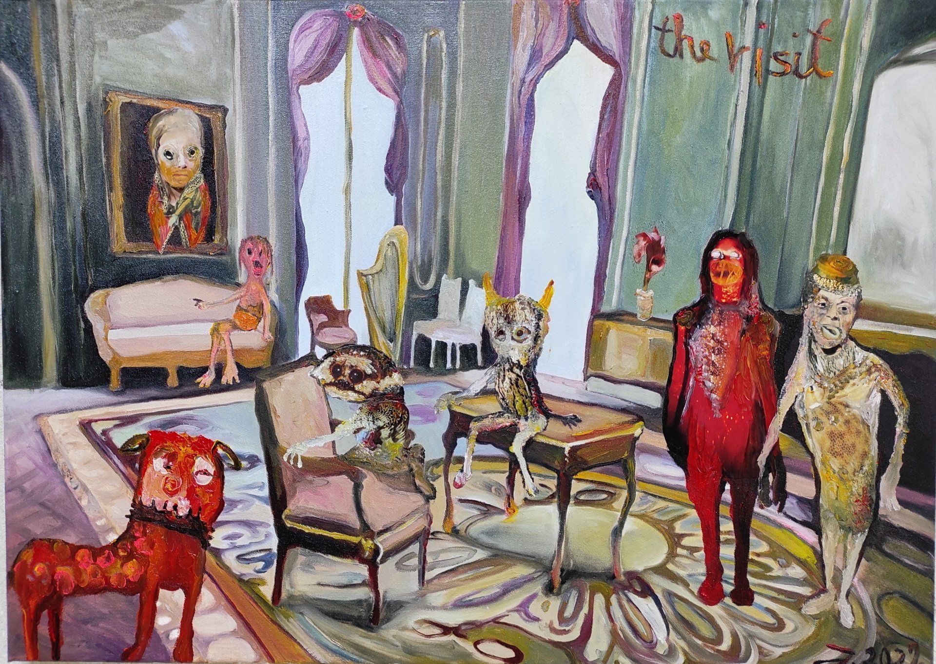 My works are very close to filmstills, like modern theater and when I`m painting I slip into a role to imagine and create the strange creatures I paint in my work.