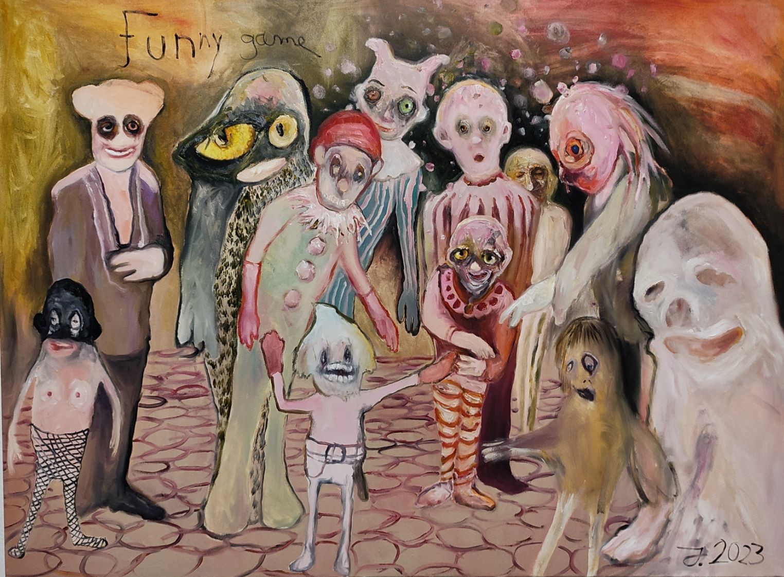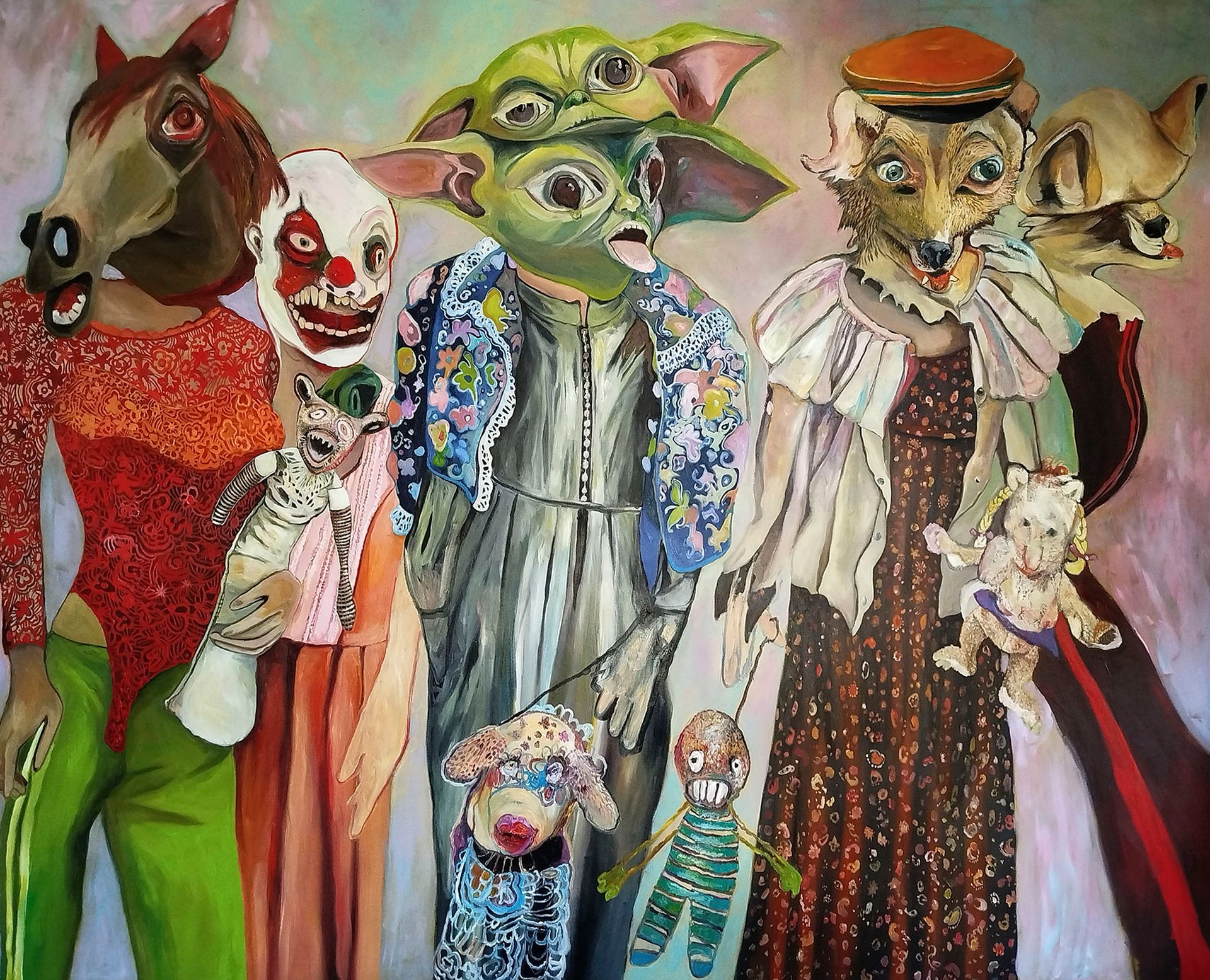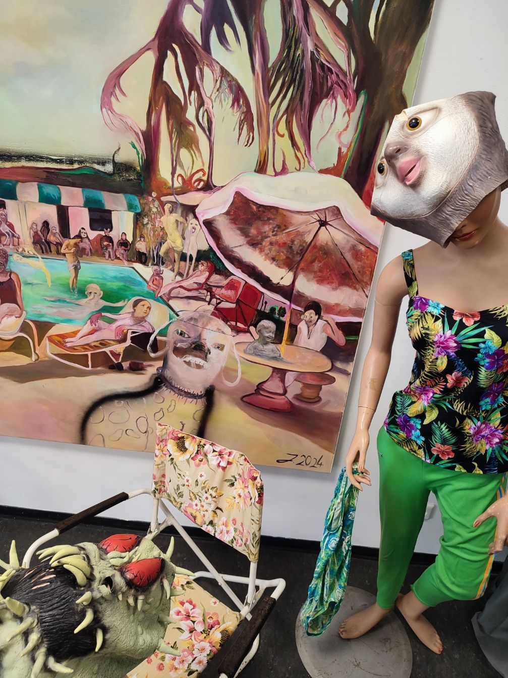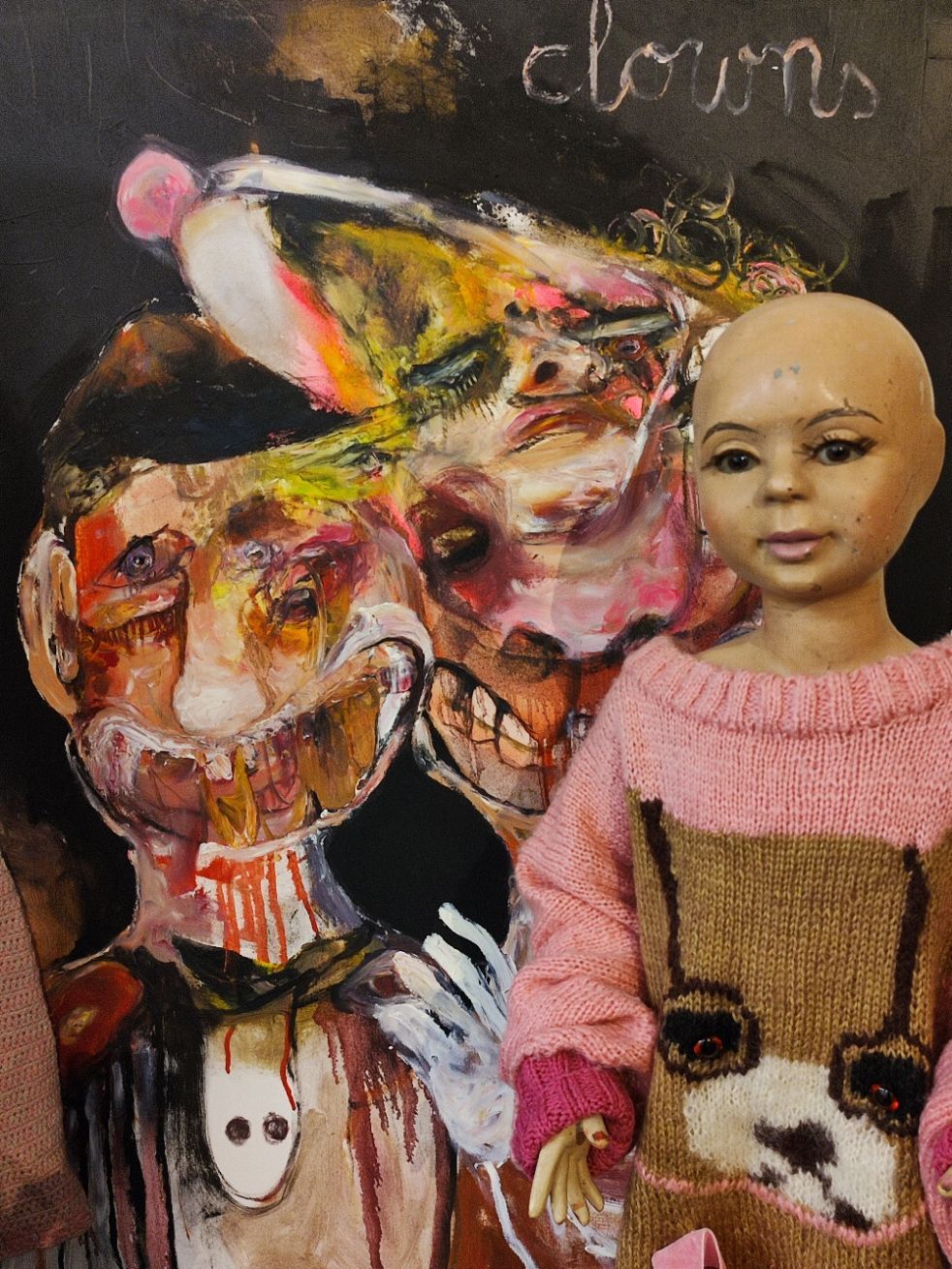 My works are very close to filmstills, like modern theater and when I`m painting I slip into a role to imagine and create the strange creatures I paint in my work.