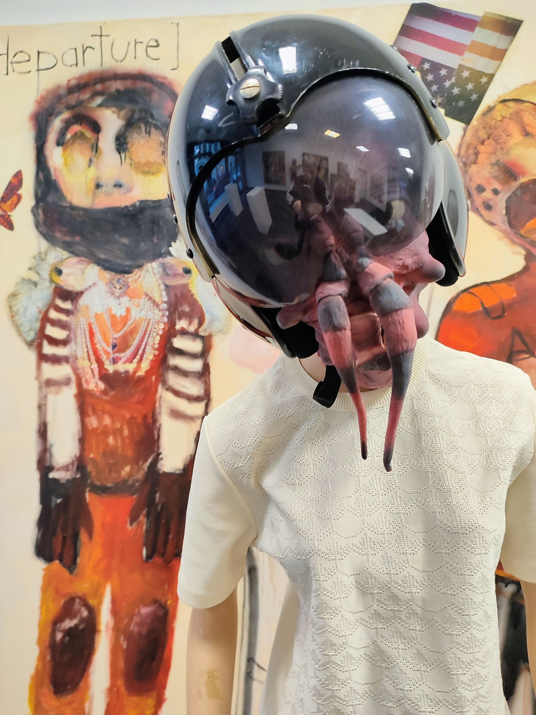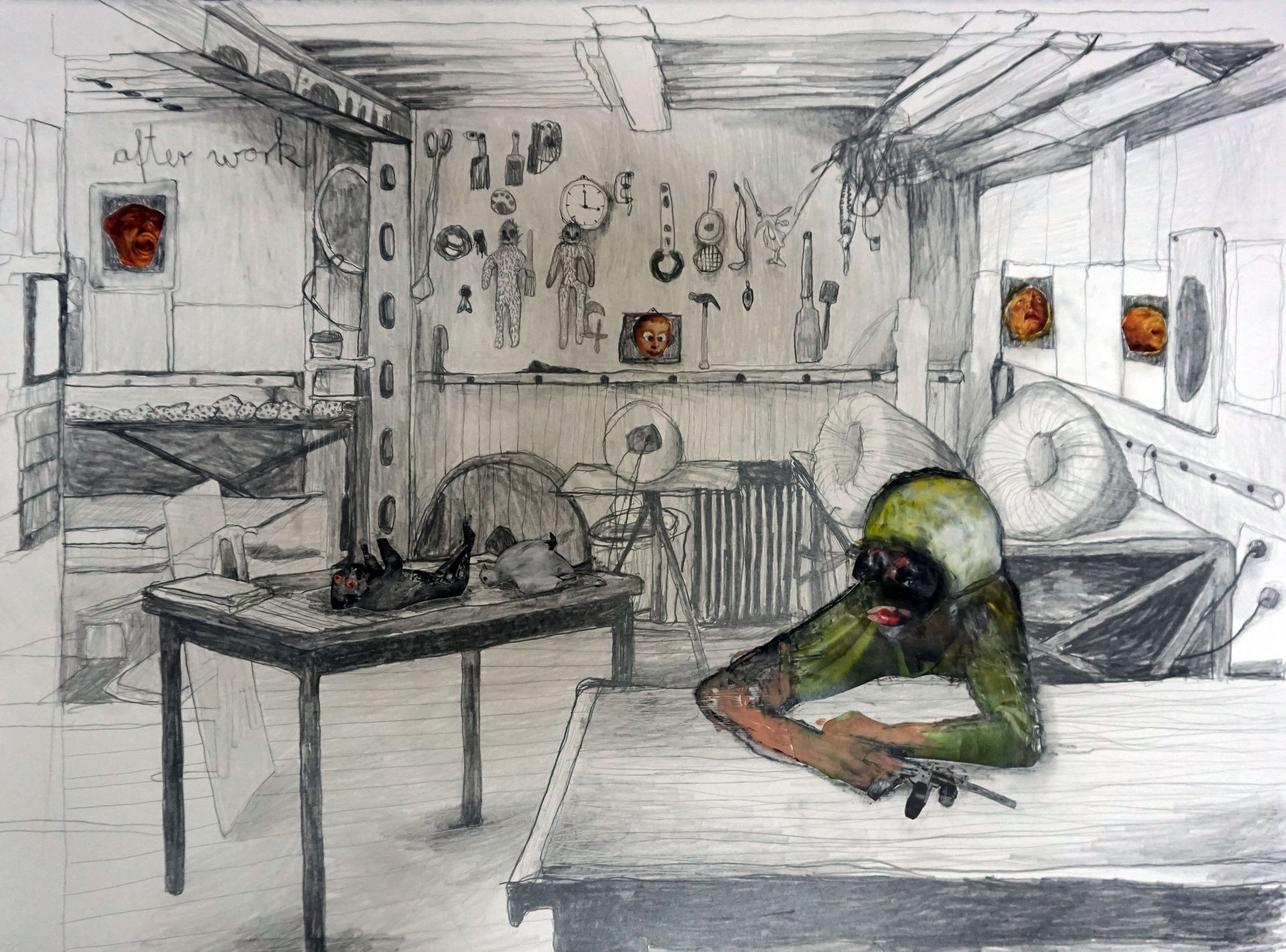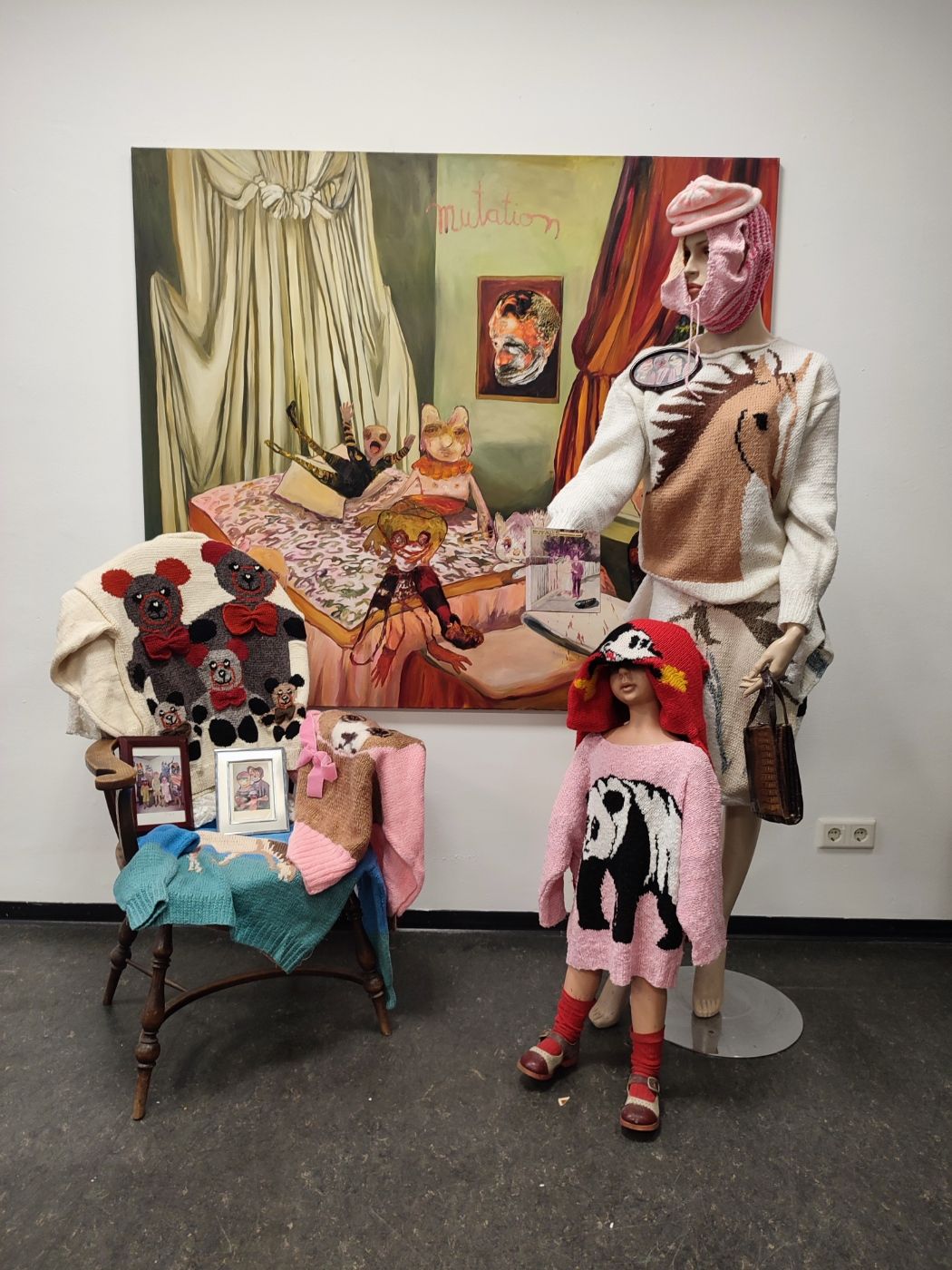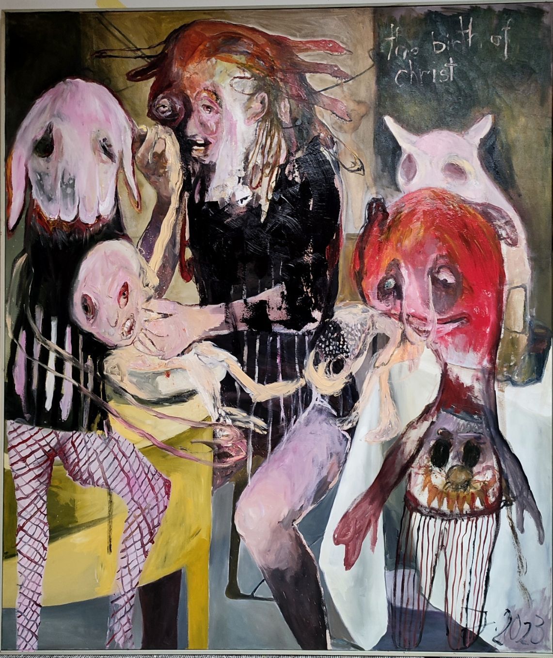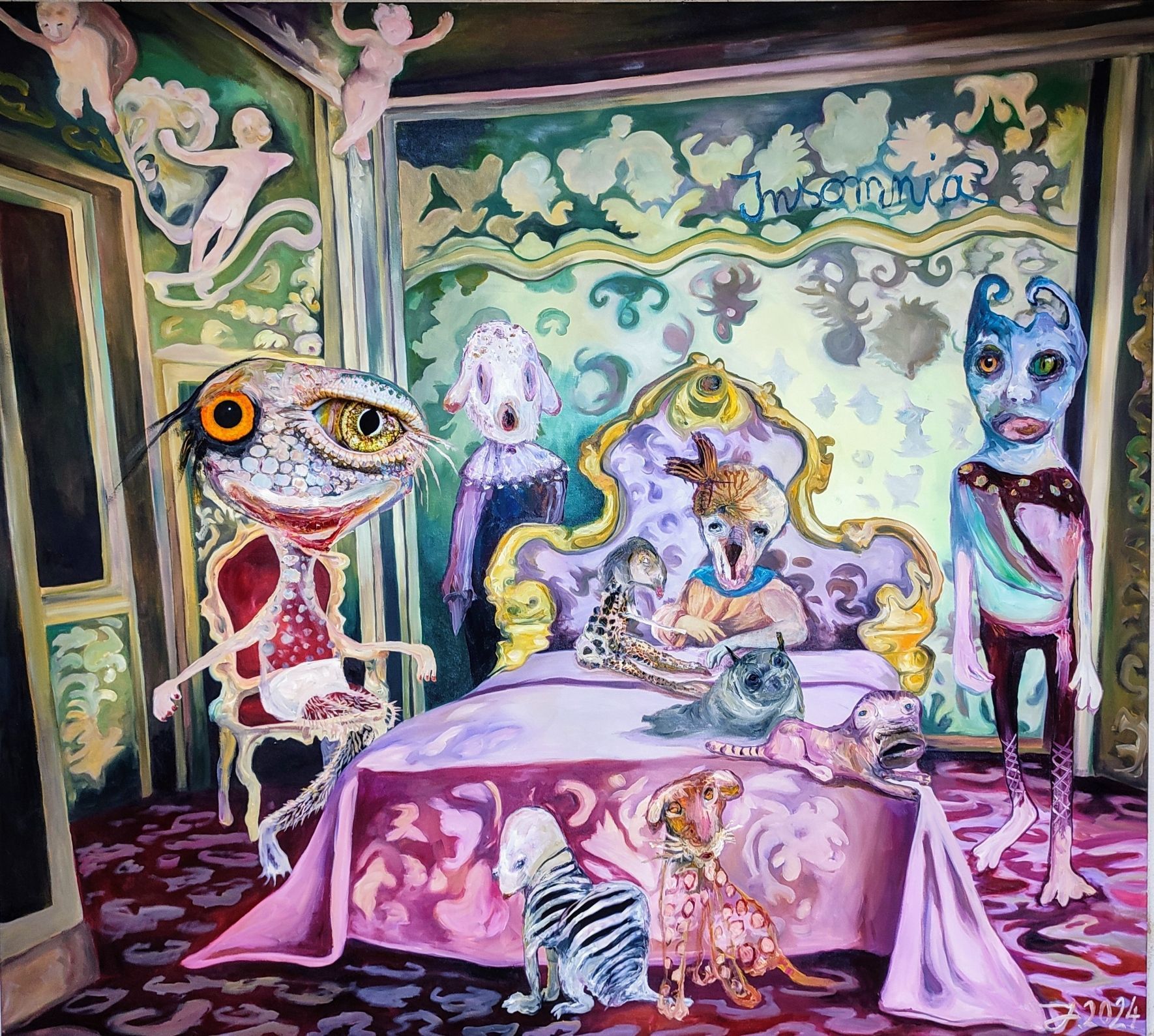 My works are very close to filmstills, like modern theater and when I`m painting I slip into a role to imagine and create the strange creatures I paint in my work.