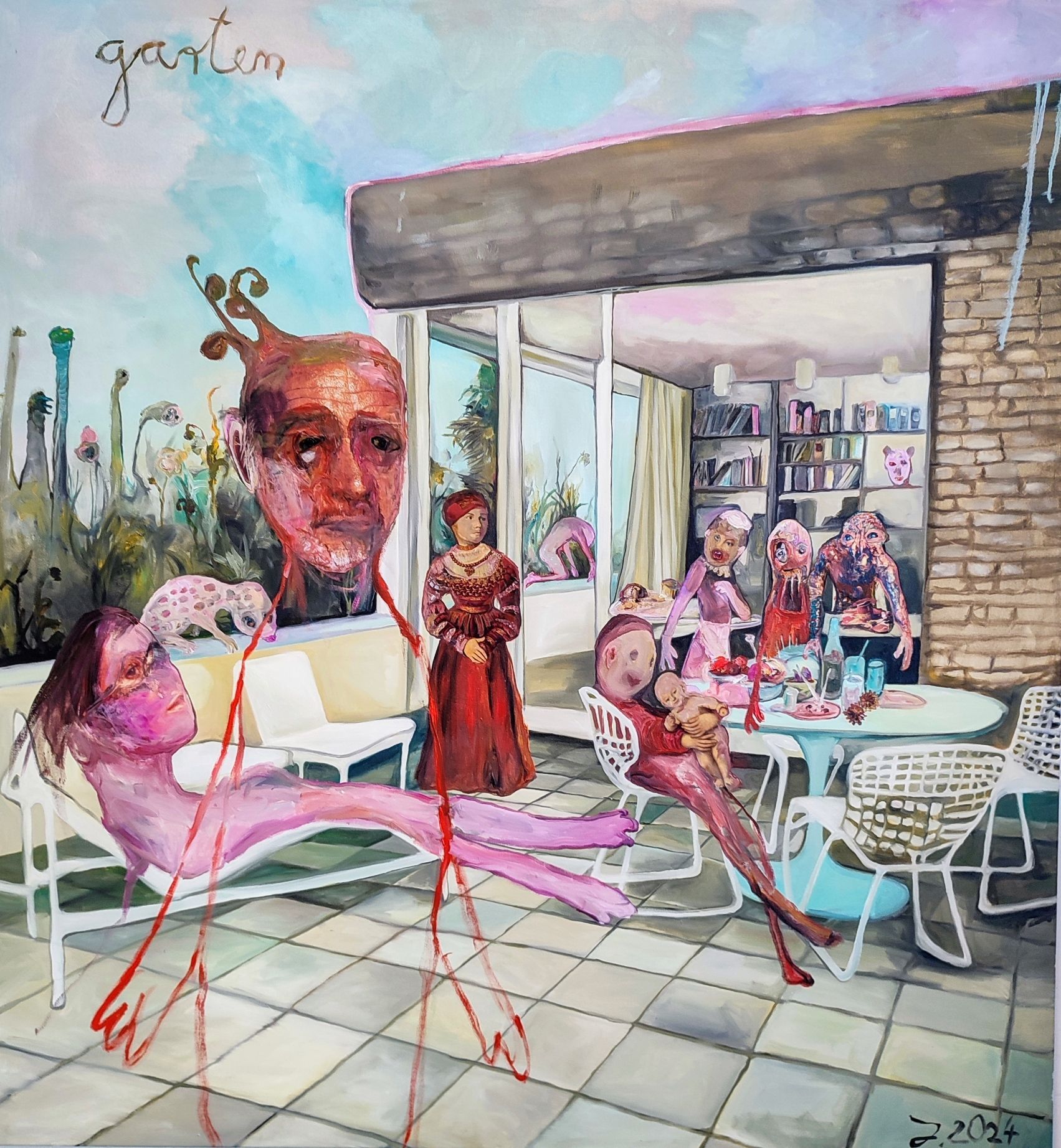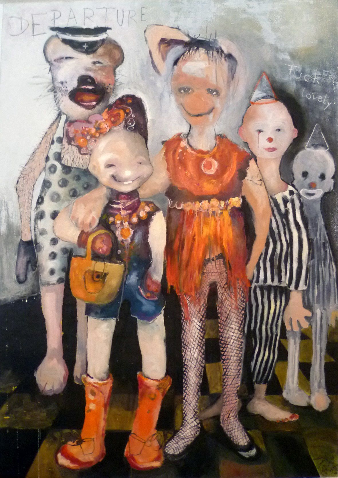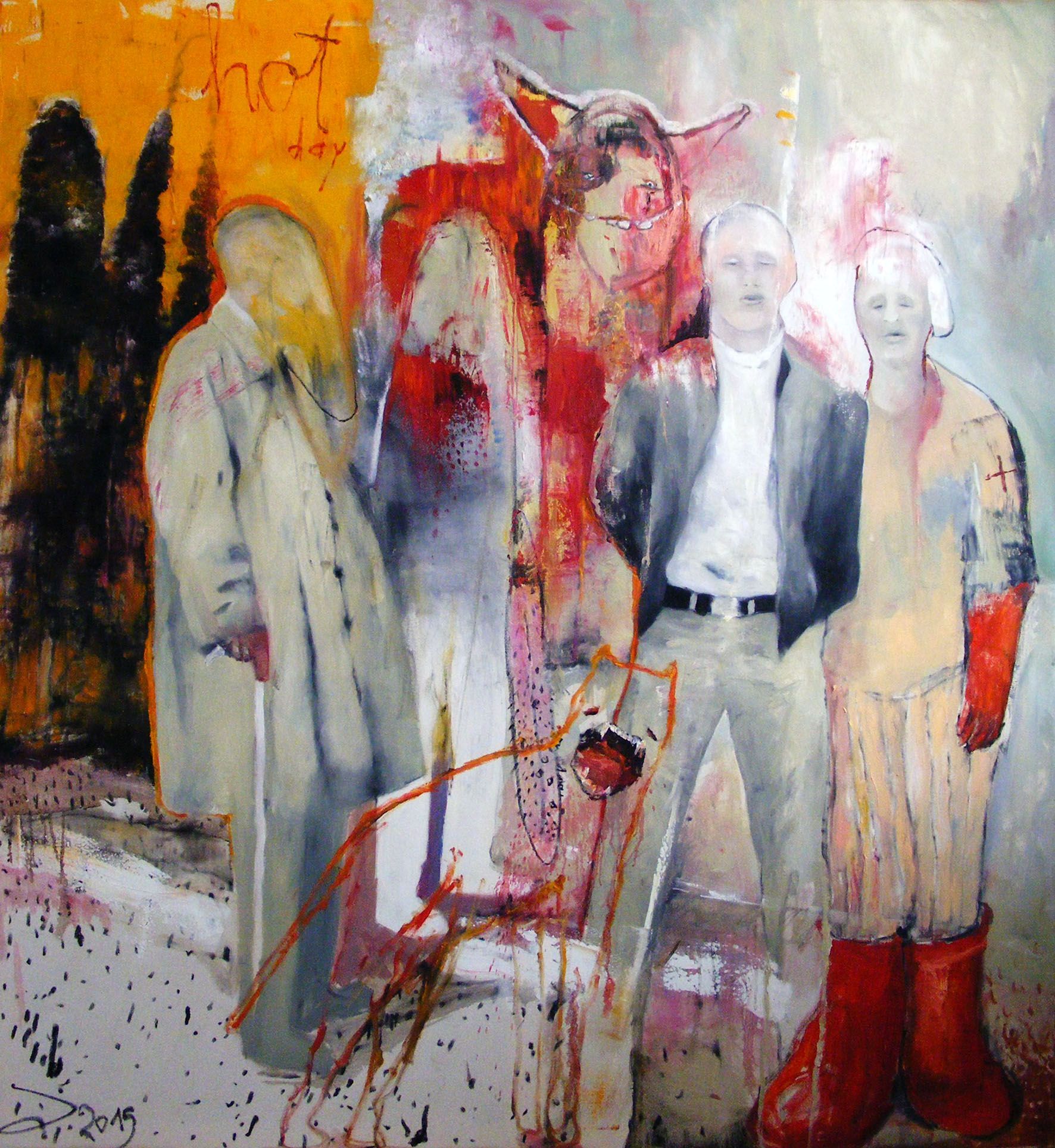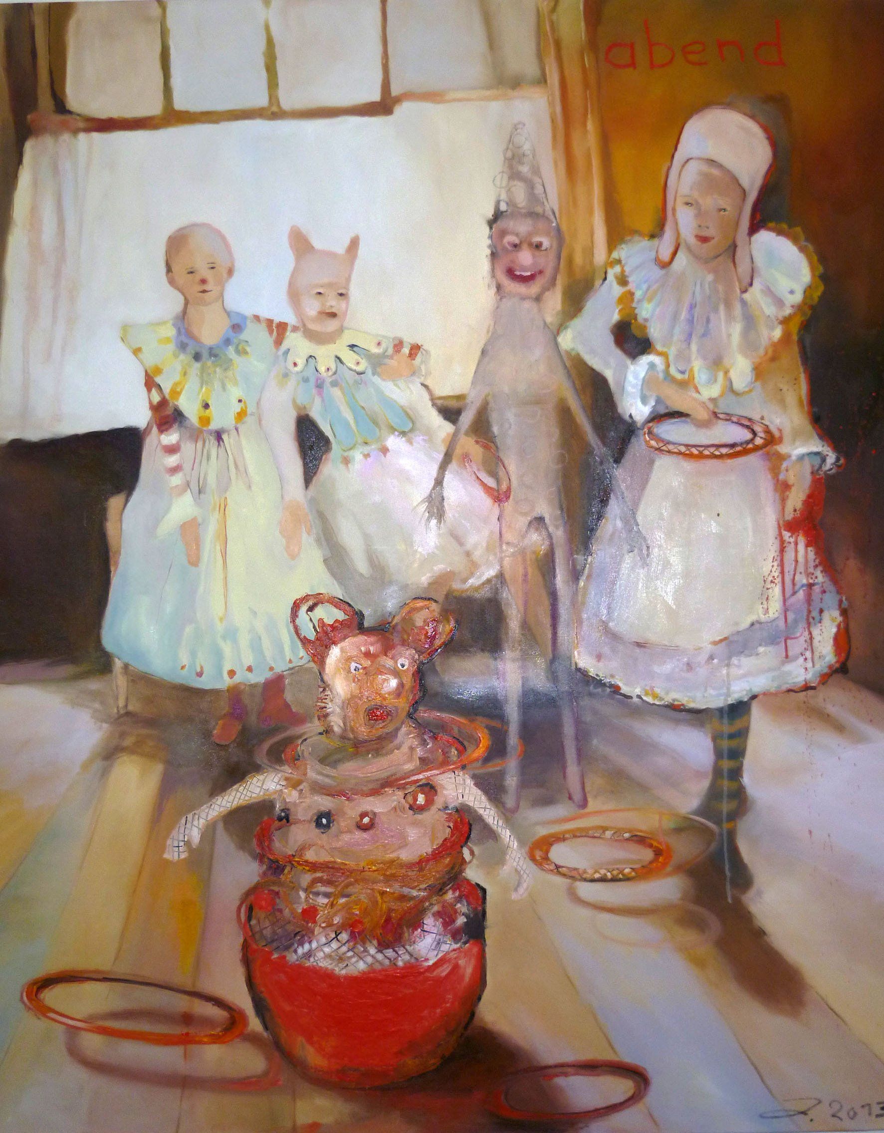Die dargestellten Figuren wirken wie Protagonisten auf einer Bühne, es findet eine Szene statt, ein Rollenspiel mit einer Gruppendynamik.