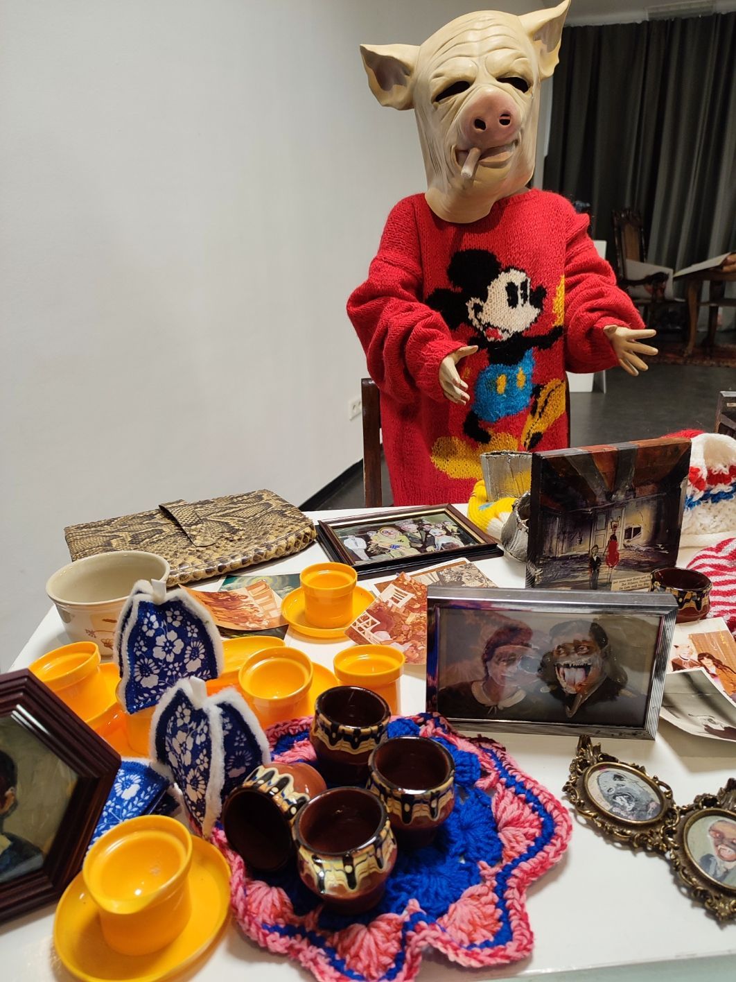 In diesem absurden Universum finden lächerliche Gruppenrituale statt und wir begegnen dem Grauen auch manchmal auf der Ebene der Kunst. Die Konstruktion und Dekonstruktion von Emotion ist die Aufgabe.