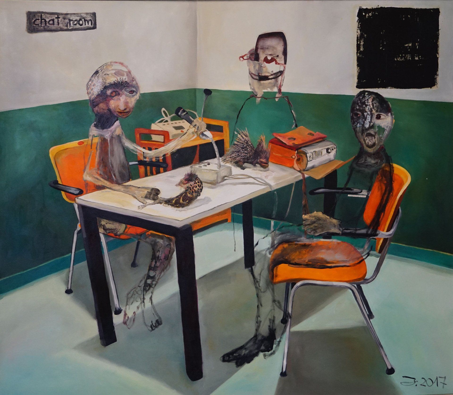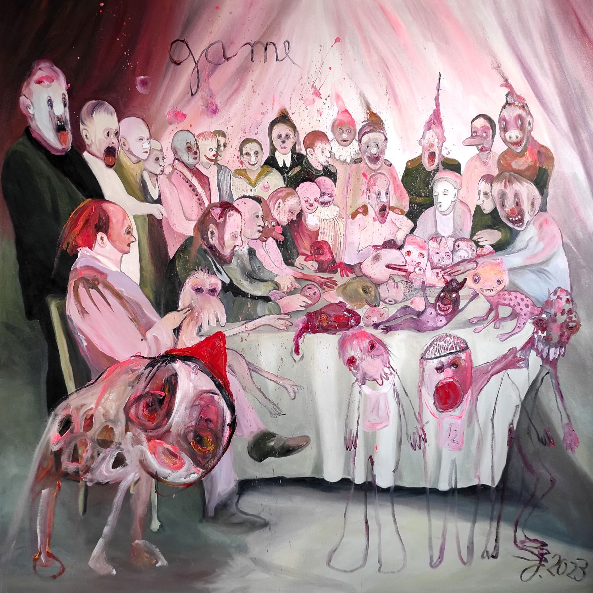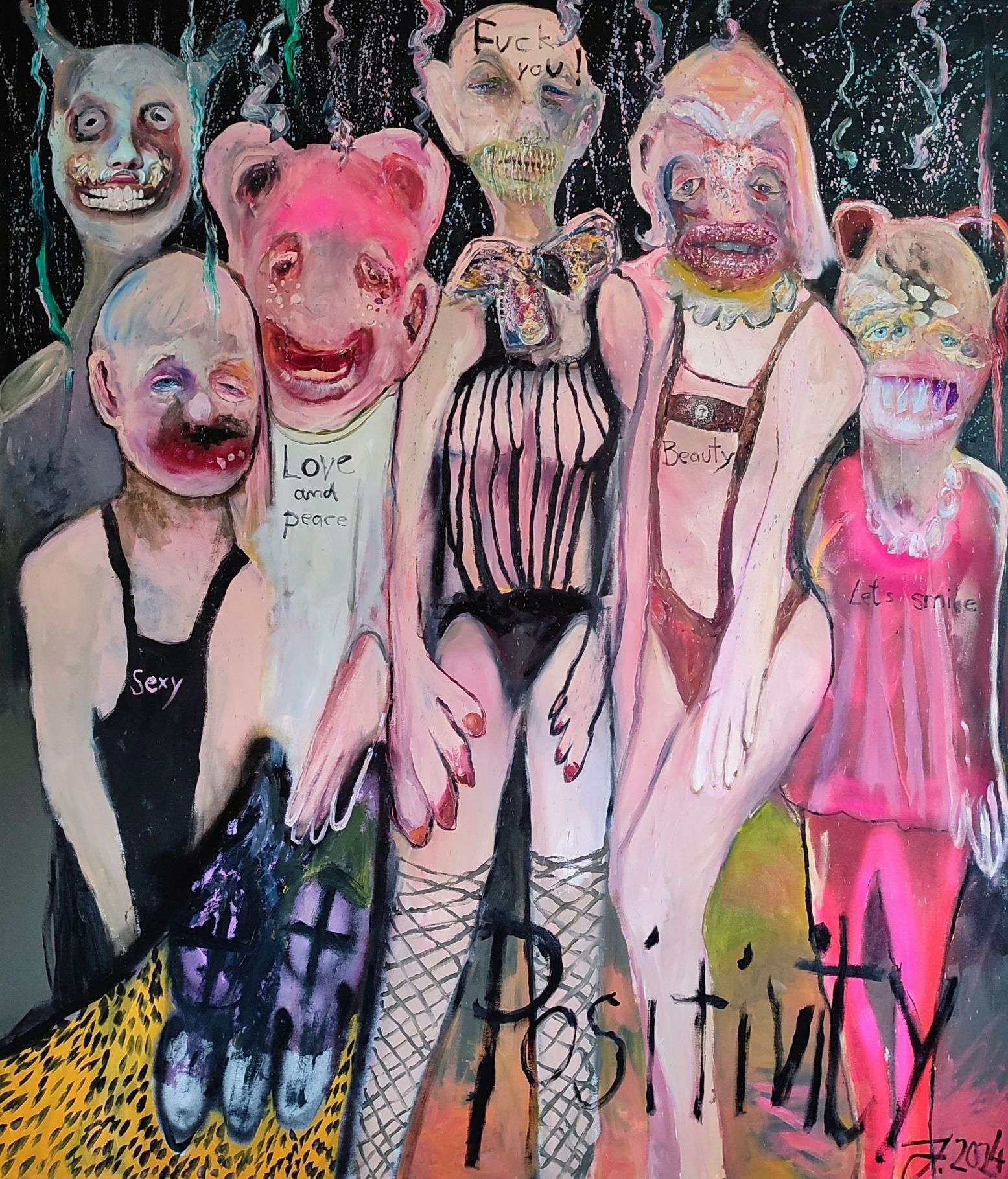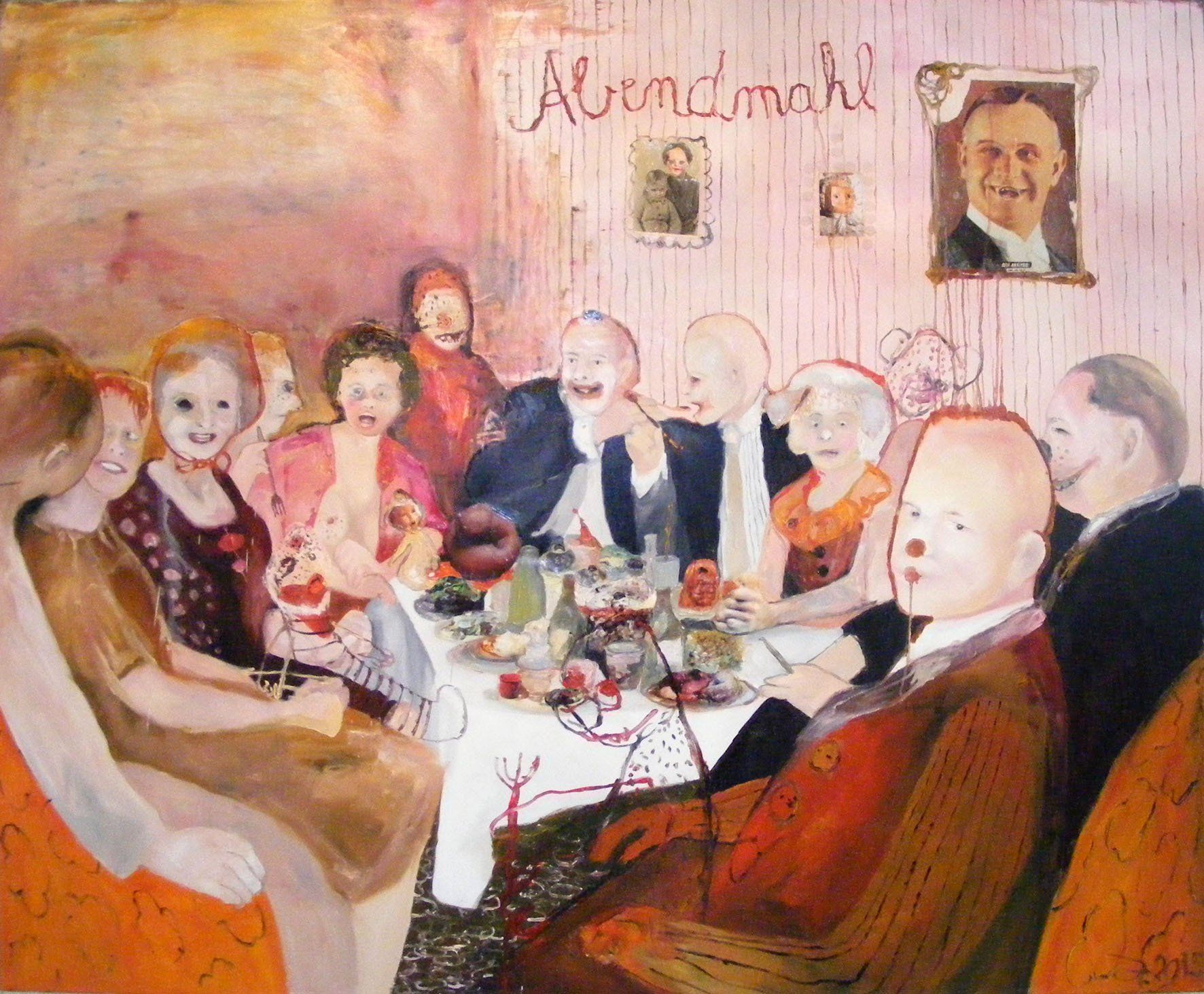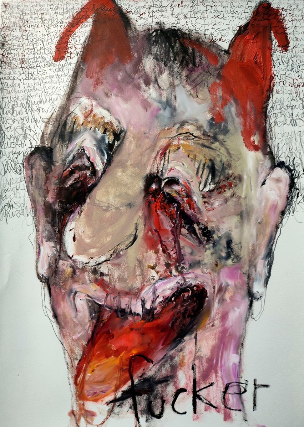 I´m inspired by the following artists. Francis Bacon, Paul Mc Carthy, Georg Grosz, Cindy Sherman but I`m not very ambitious in art history, so I often work very free without having some imaginations from other artists in my mind. I think that is the reason of the independence of my paintings. In my education, during my studies I learned a lot about Georg Grosz. I try to make satire paintings for the present time, we live in today.