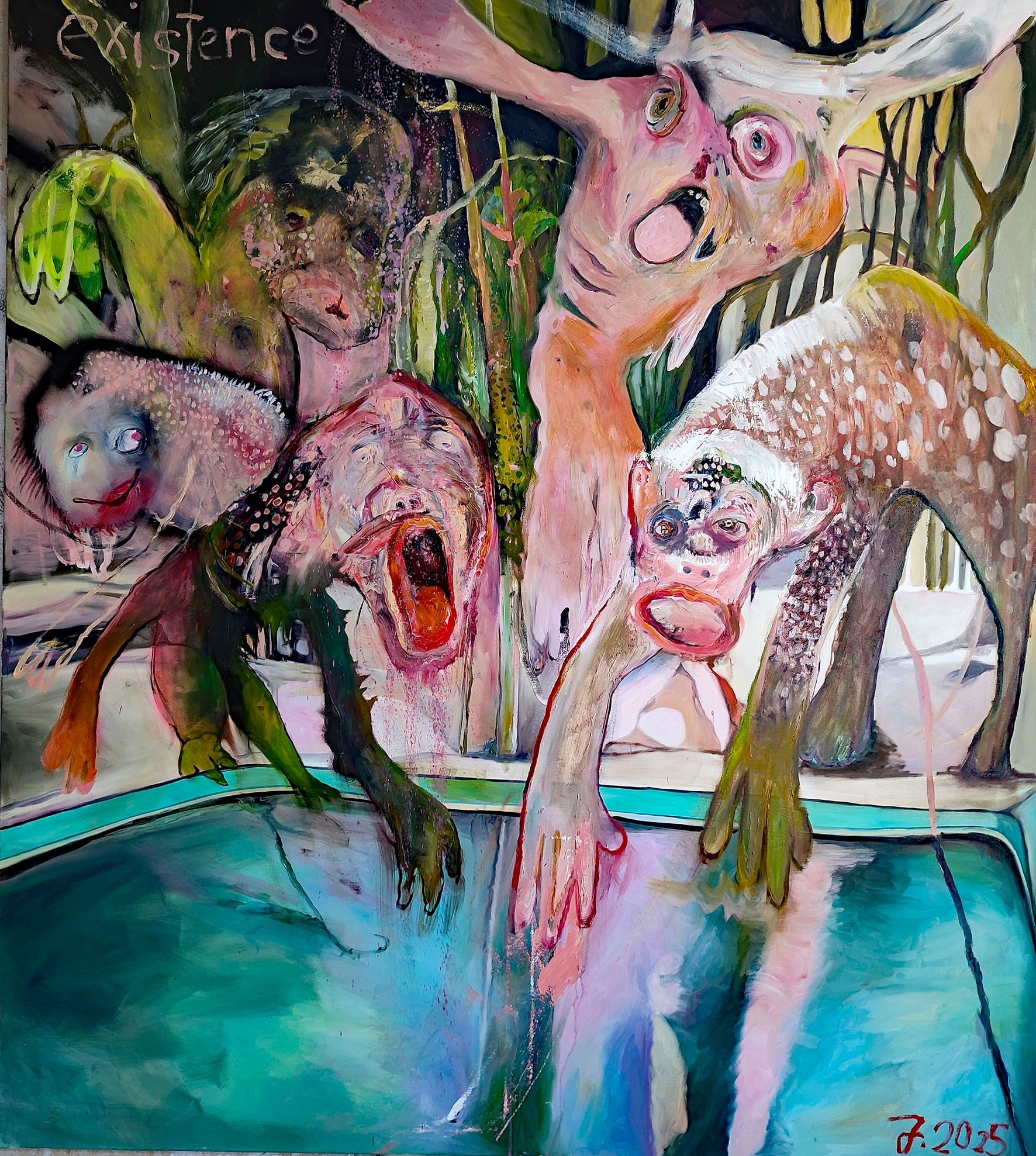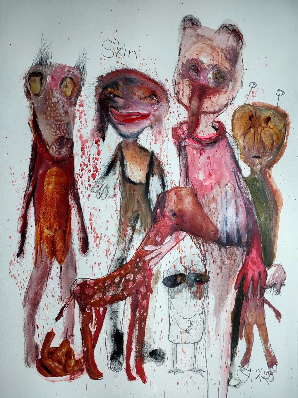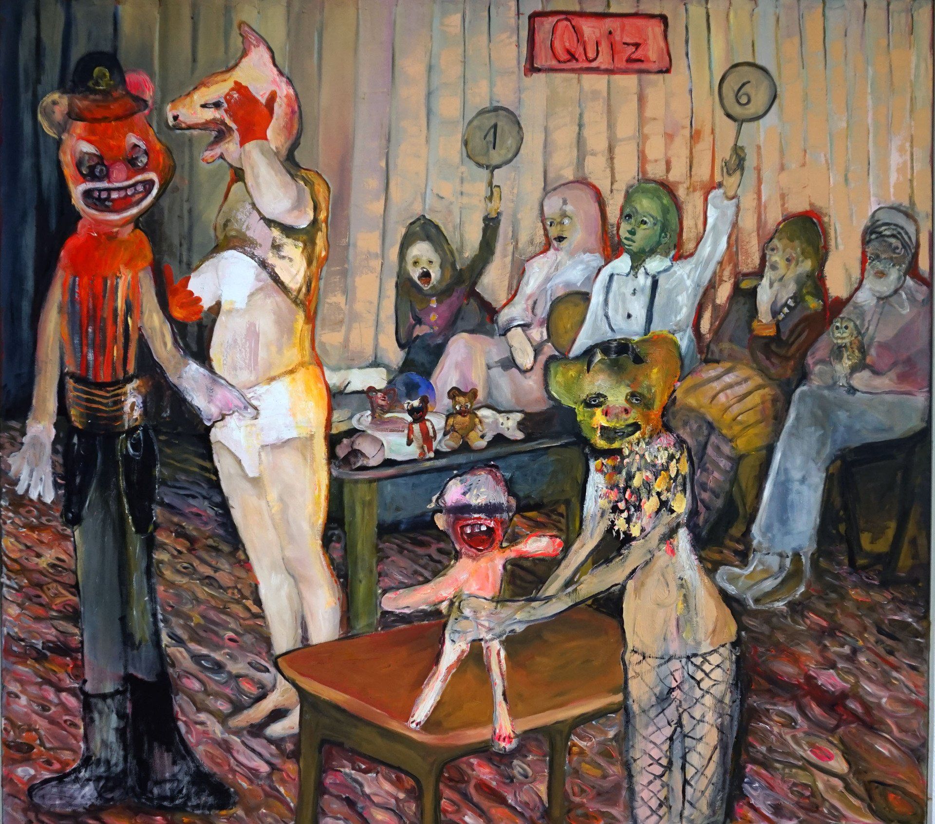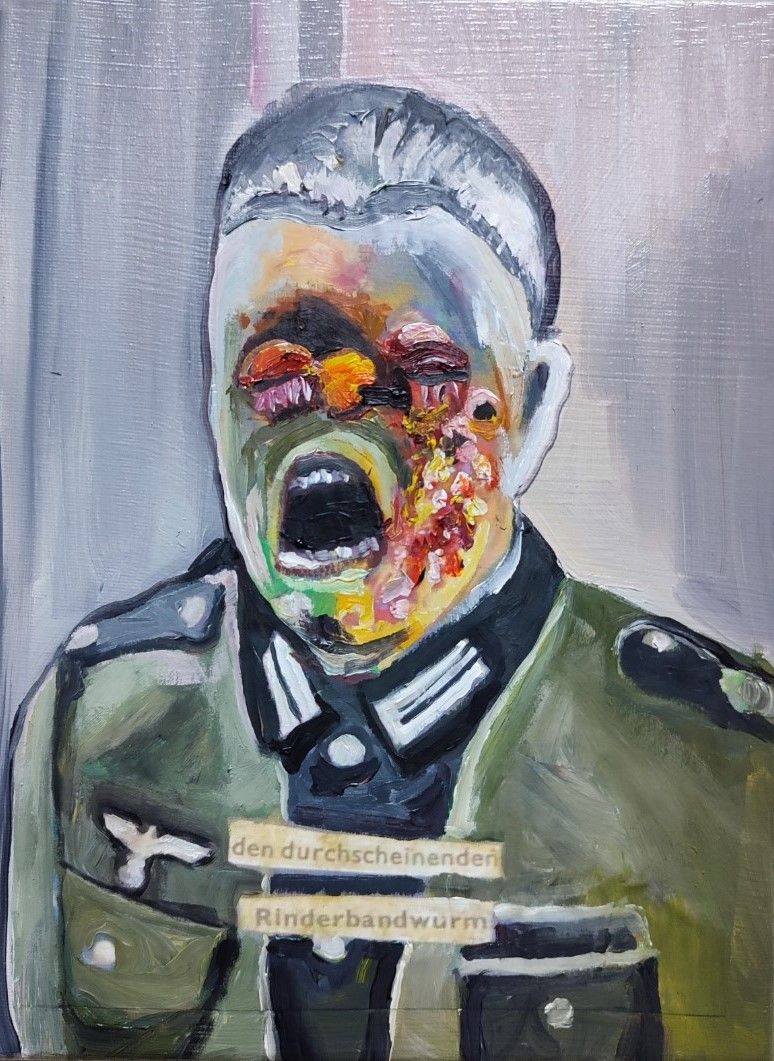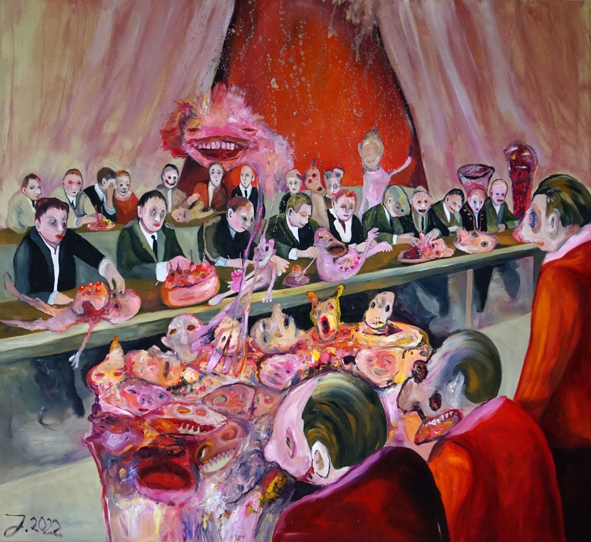 I´m inspired by the following artists. Francis Bacon, Paul Mc Carthy, Georg Grosz, Cindy Sherman but I`m not very ambitious in art history, so I often work very free without having some imaginations from other artists in my mind. I think that is the reason of the independence of my paintings. In my education, during my studies I learned a lot about Georg Grosz. I try to make satire paintings for the present time, we live in today.