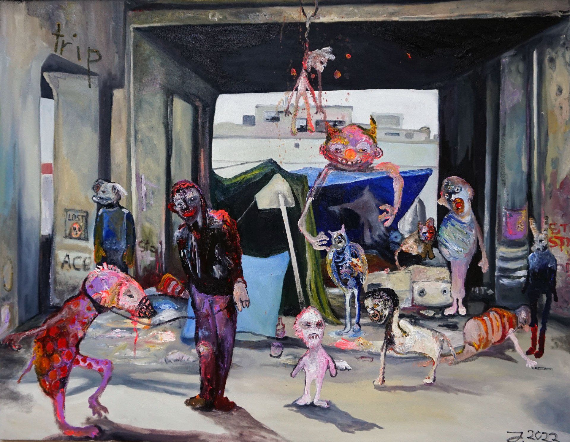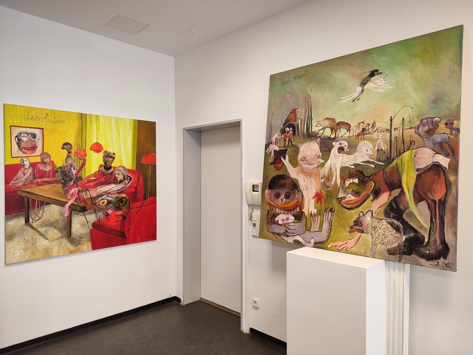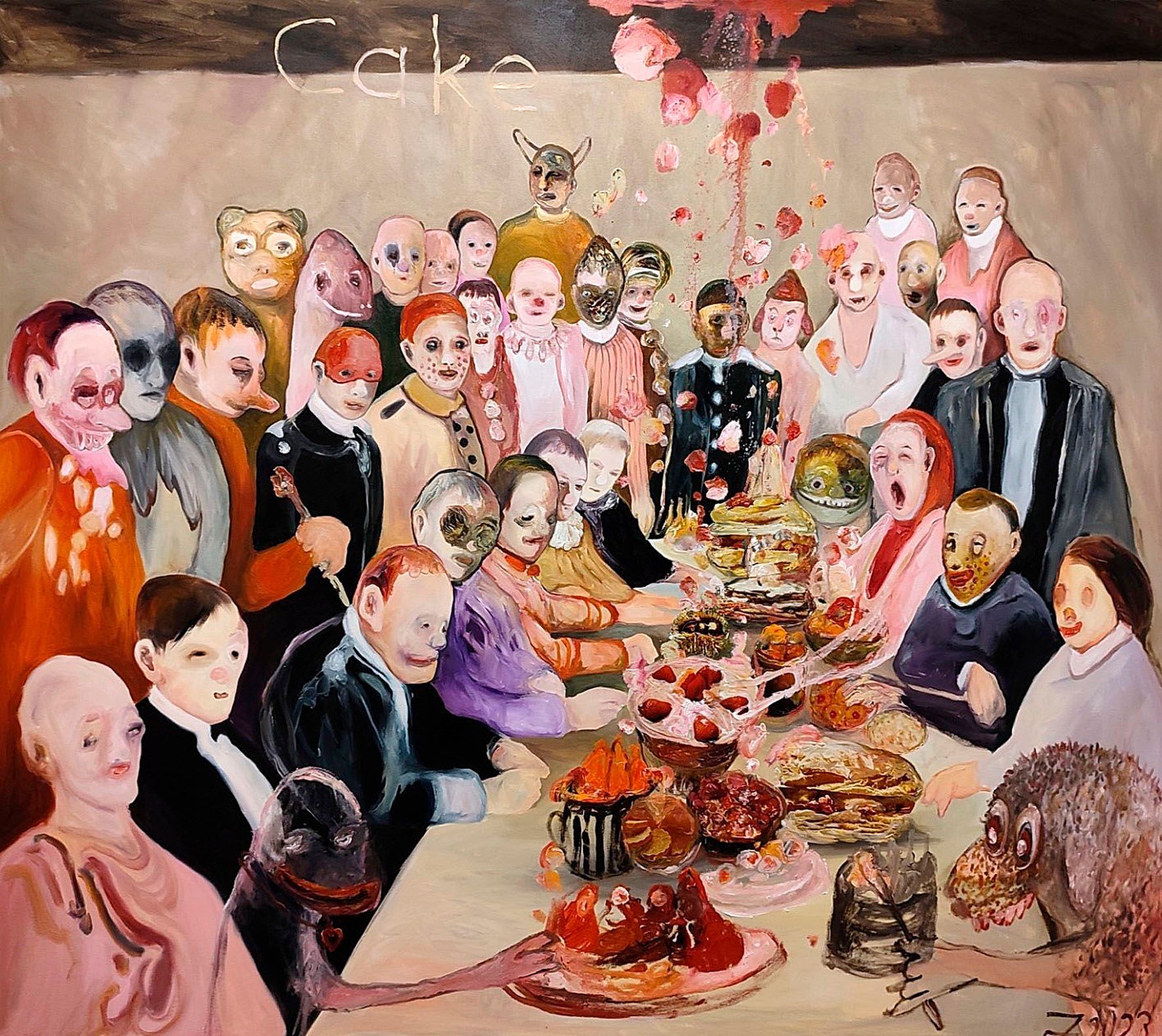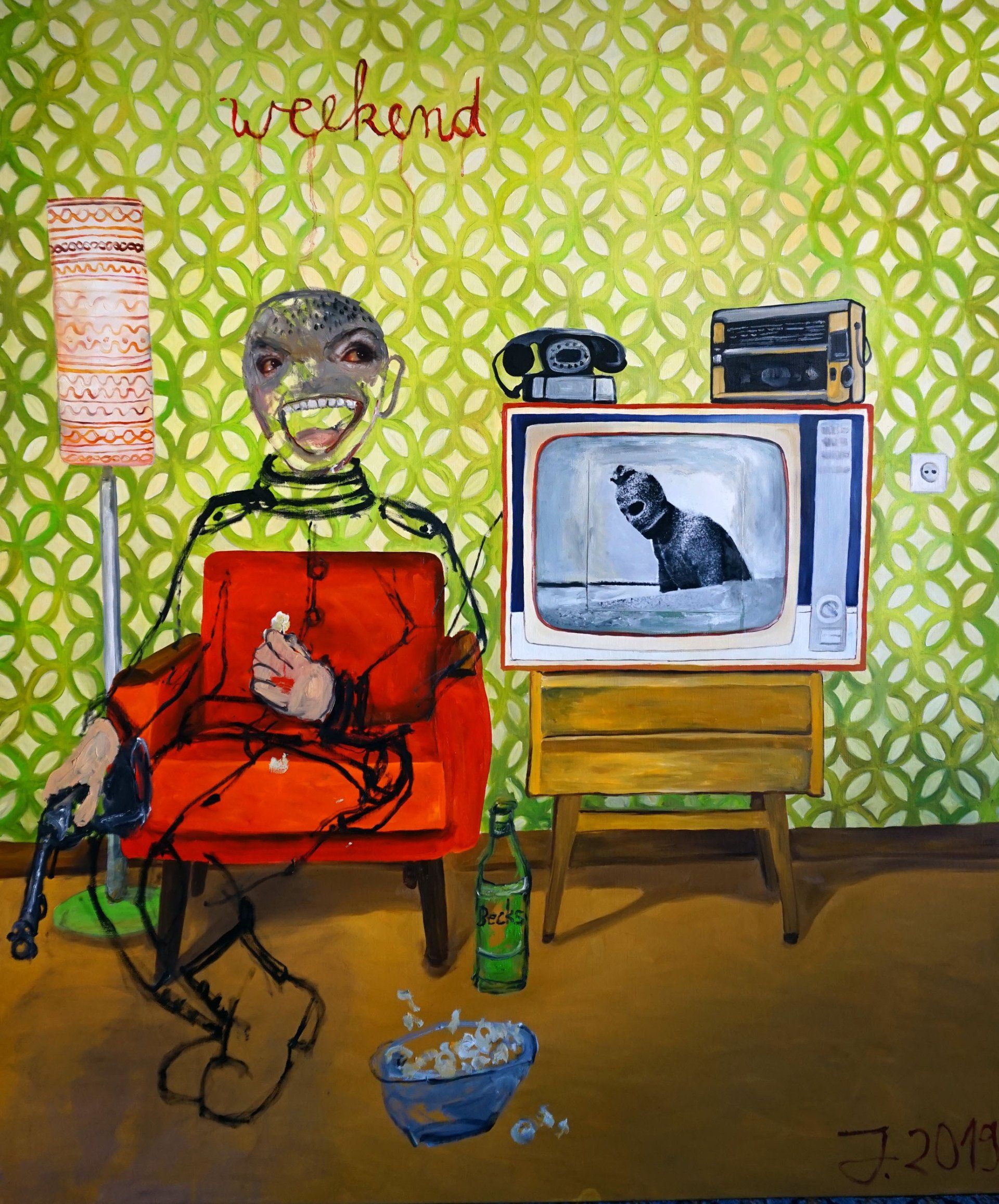 I´m inspired by the following artists. Francis Bacon, Paul Mc Carthy, Georg Grosz, Cindy Sherman but I`m not very ambitious in art history, so I often work very free without having some imaginations from other artists in my mind. I think that is the reason of the independence of my paintings. In my education, during my studies I learned a lot about Georg Grosz. I try to make satire paintings for the present time, we live in today.
