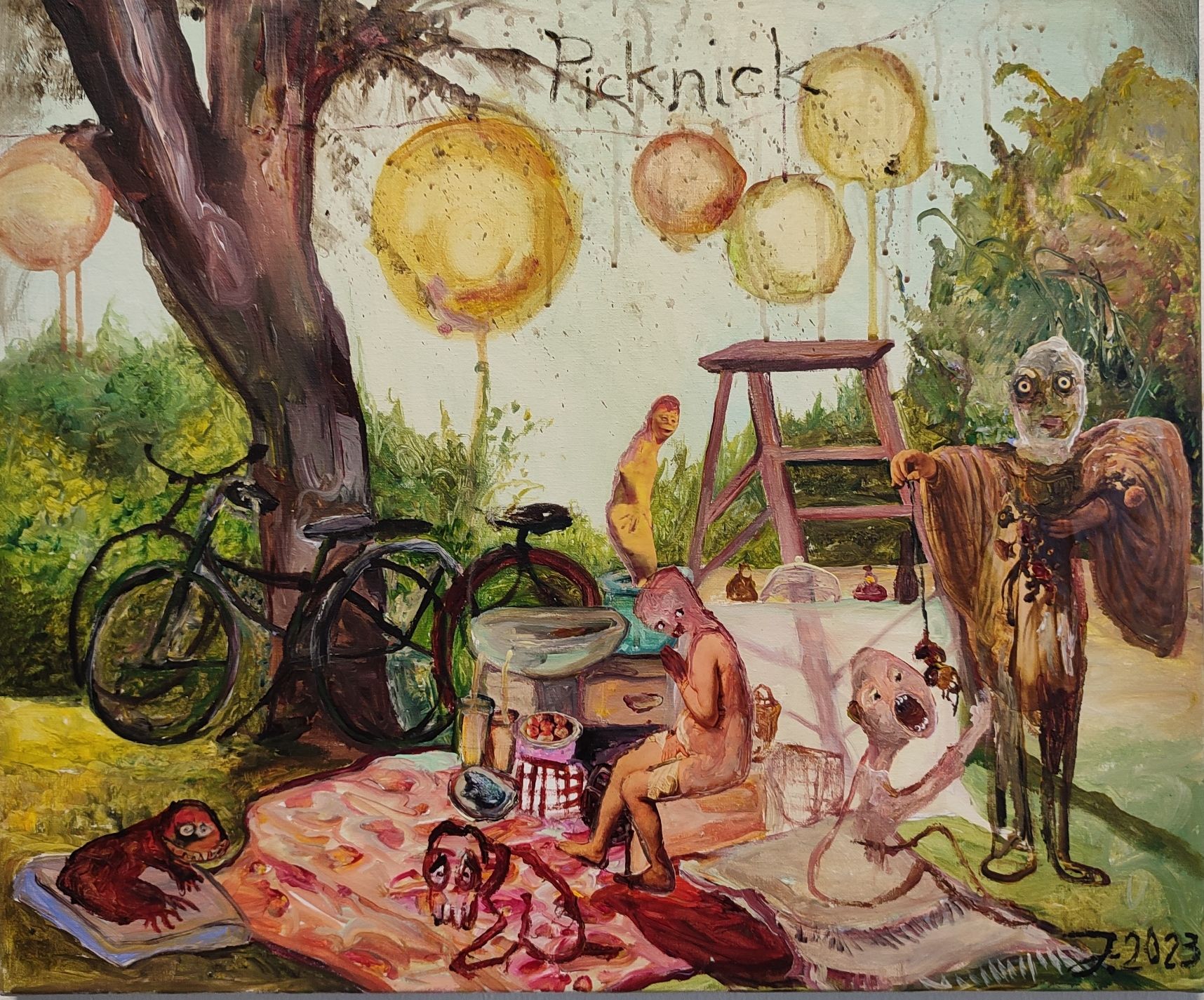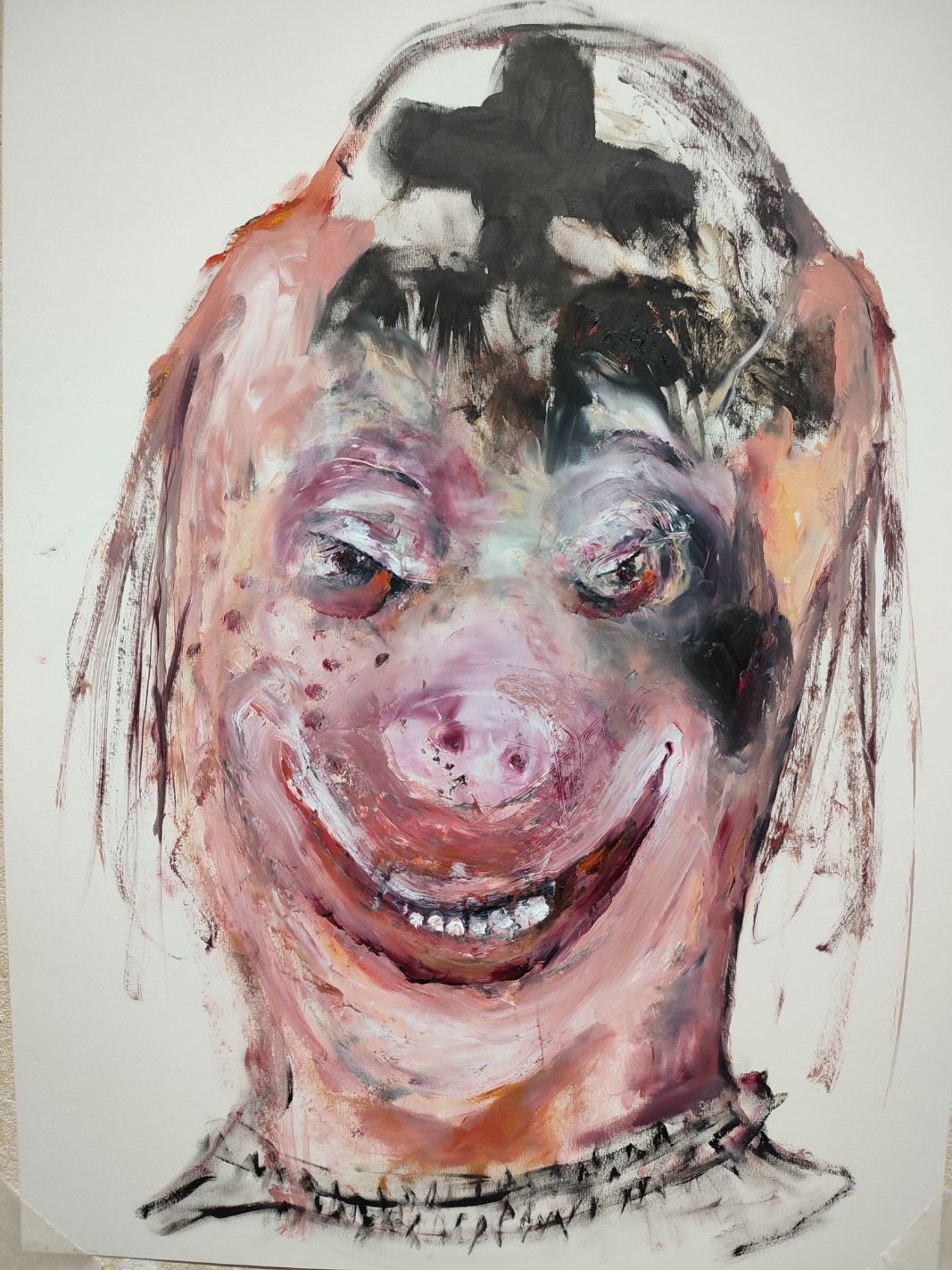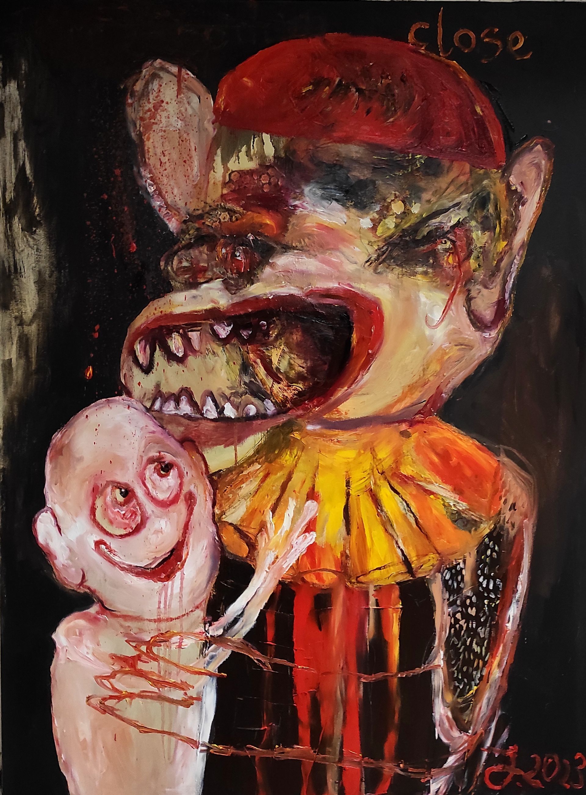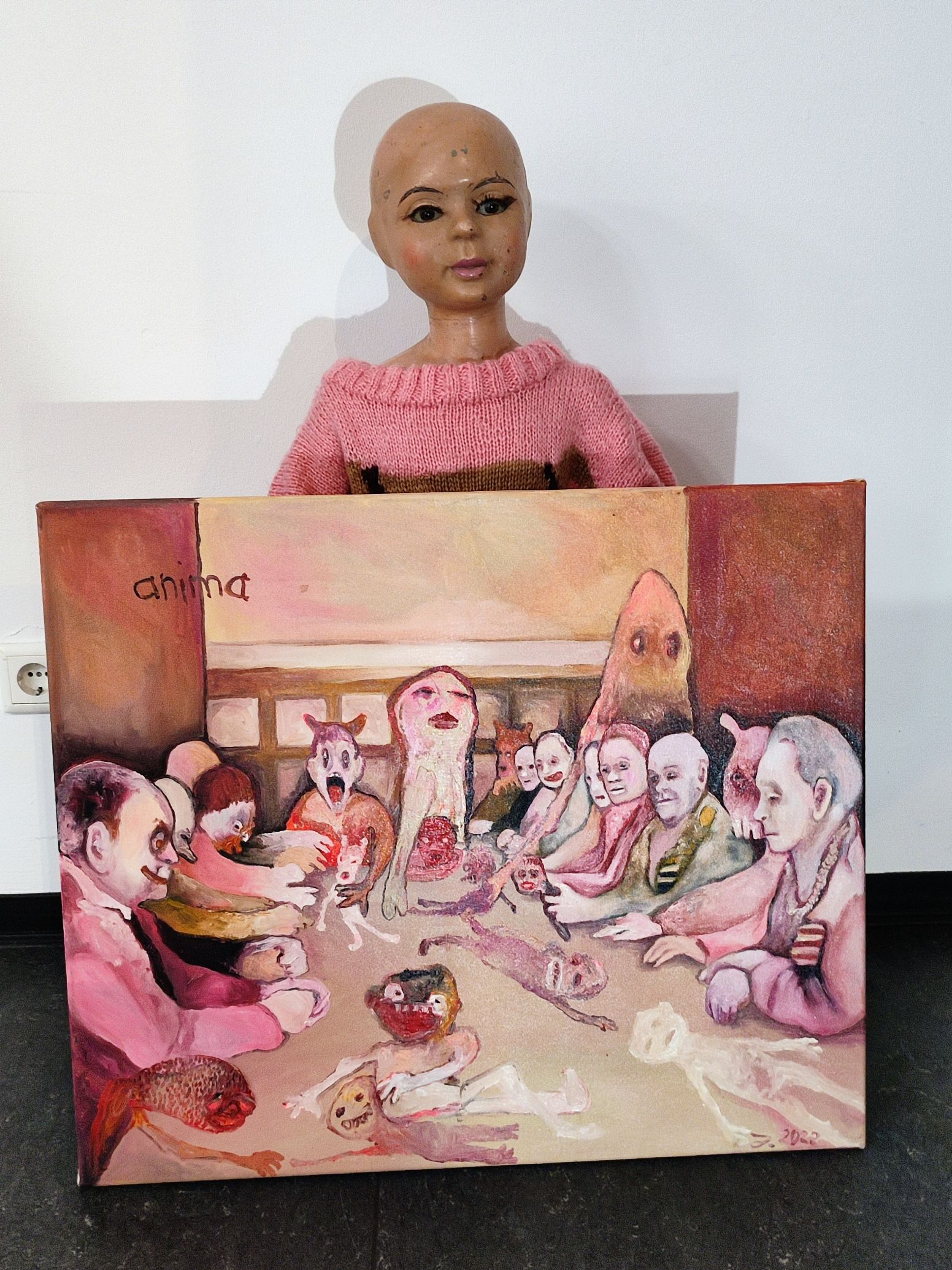 I´m inspired by the following artists. Francis Bacon, Paul Mc Carthy, Georg Grosz, Cindy Sherman but I`m not very ambitious in art history, so I often work very free without having some imaginations from other artists in my mind. I think that is the reason of the independence of my paintings. In my education, during my studies I learned a lot about Georg Grosz. I try to make satire paintings for the present time, we live in today.