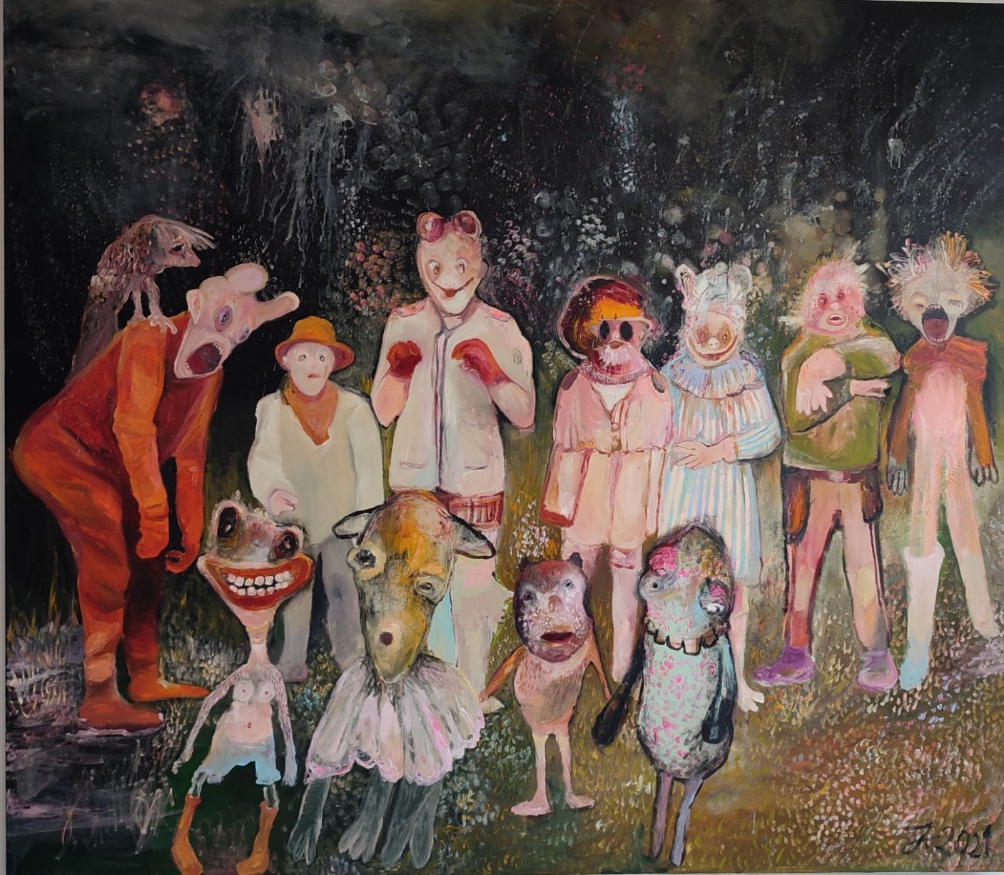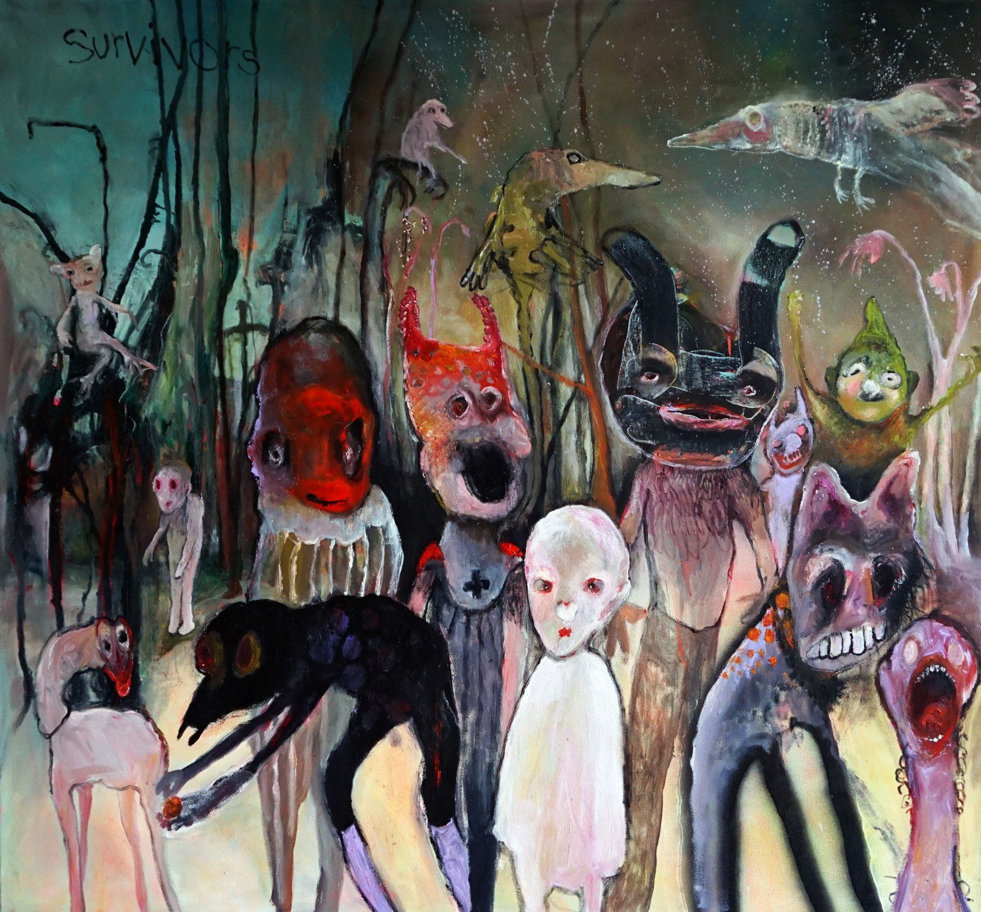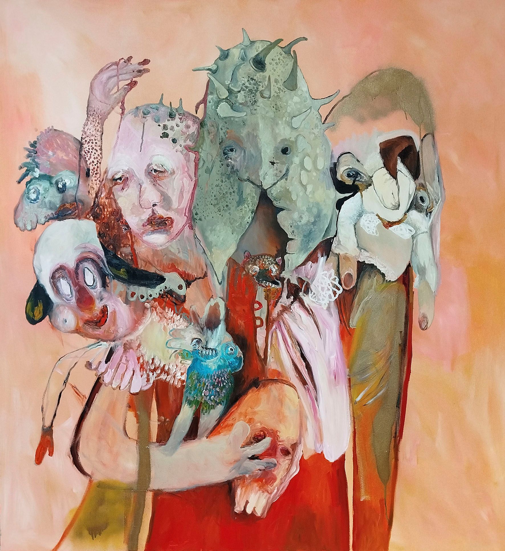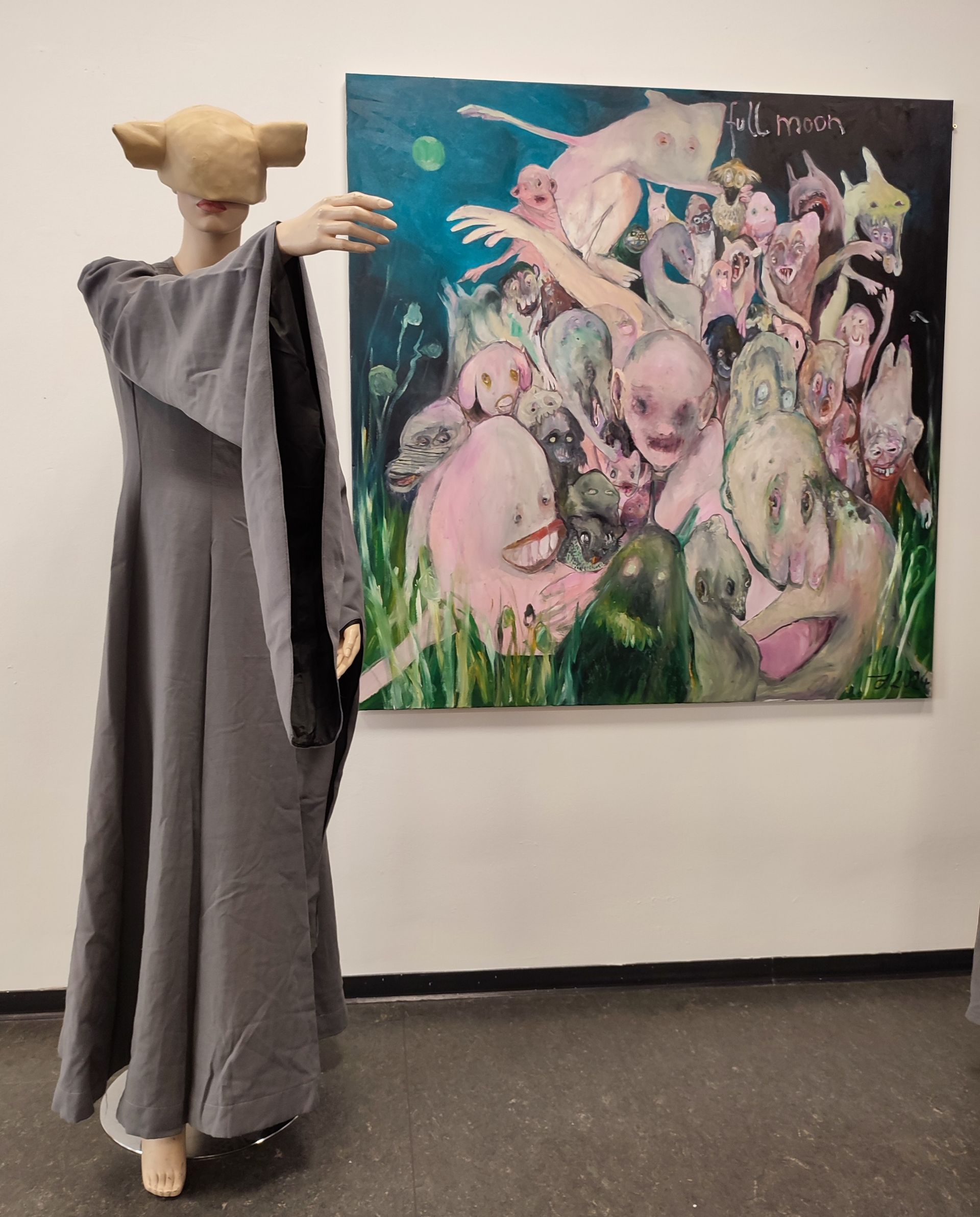 My works are very close to filmstills, like modern theater and when I`m painting I slip into a role to imagine and create the strange creatures I paint in my work.