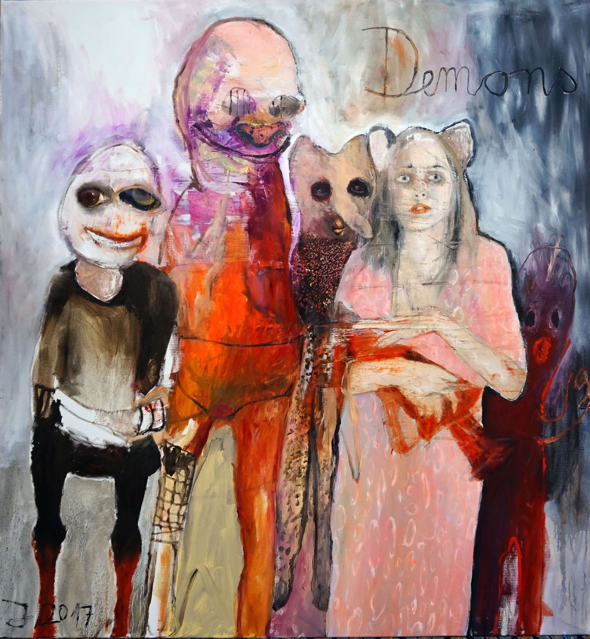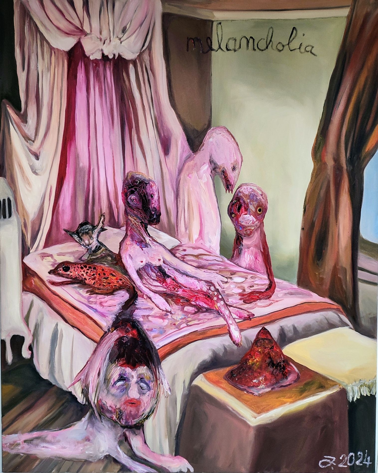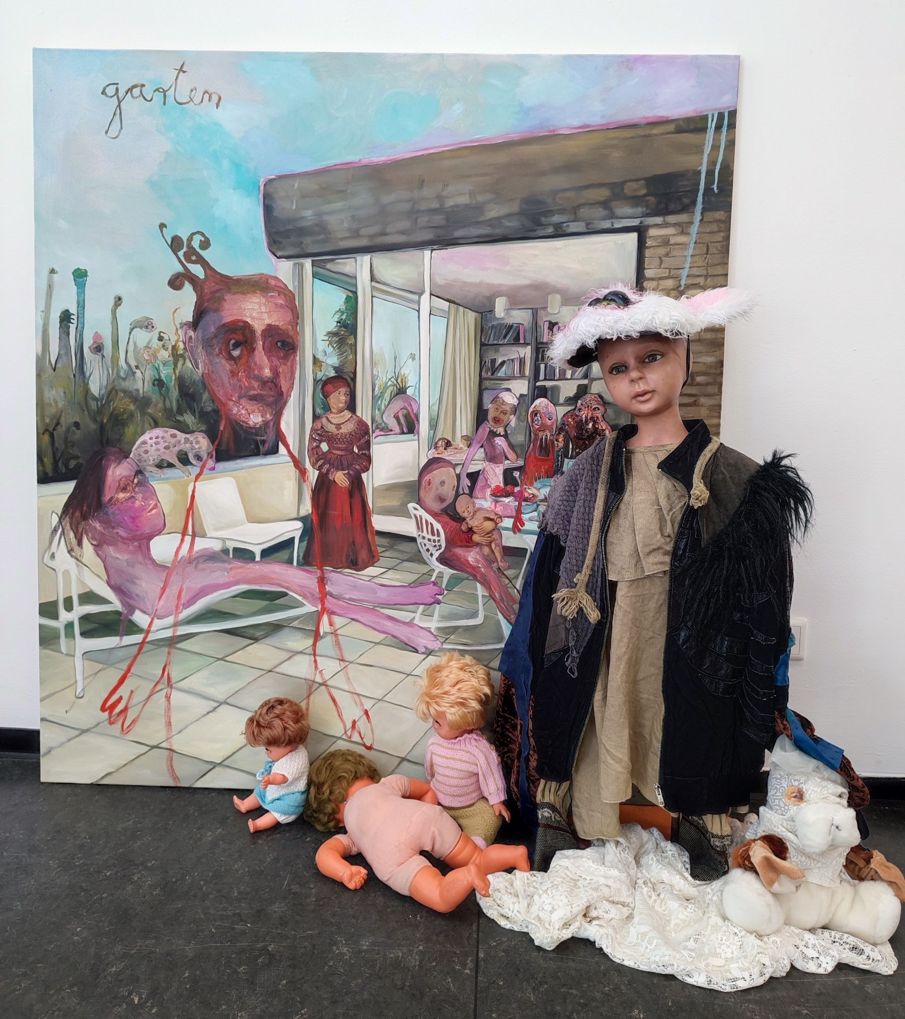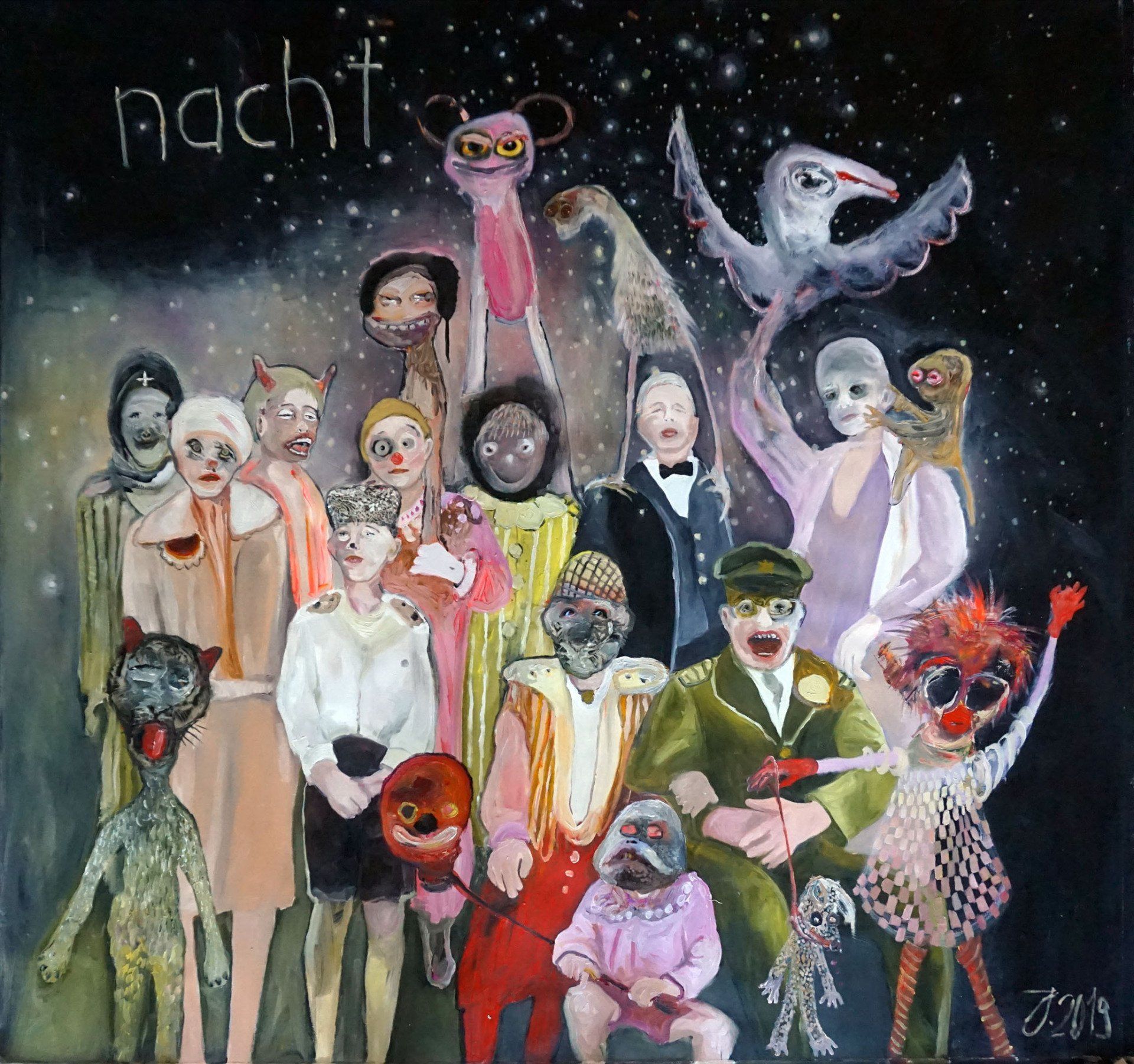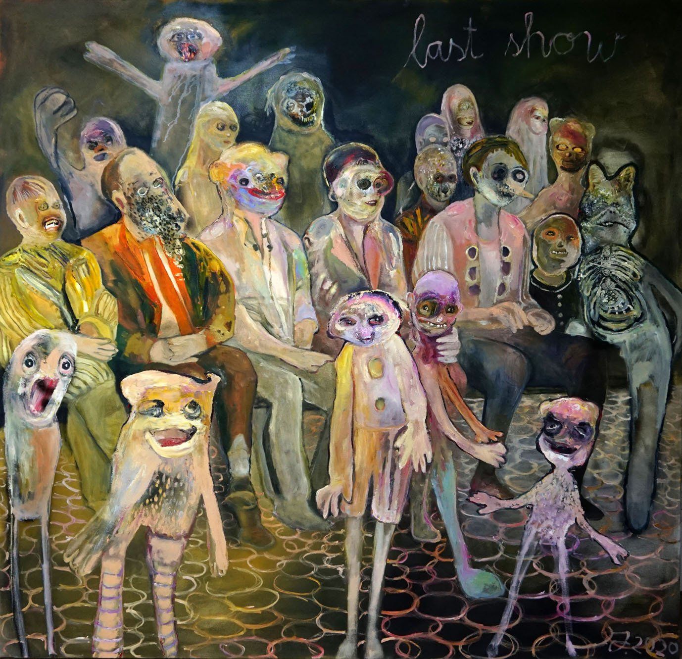 My works are very close to filmstills, like modern theater and when I`m painting I slip into a role to imagine and create the strange creatures I paint in my work.