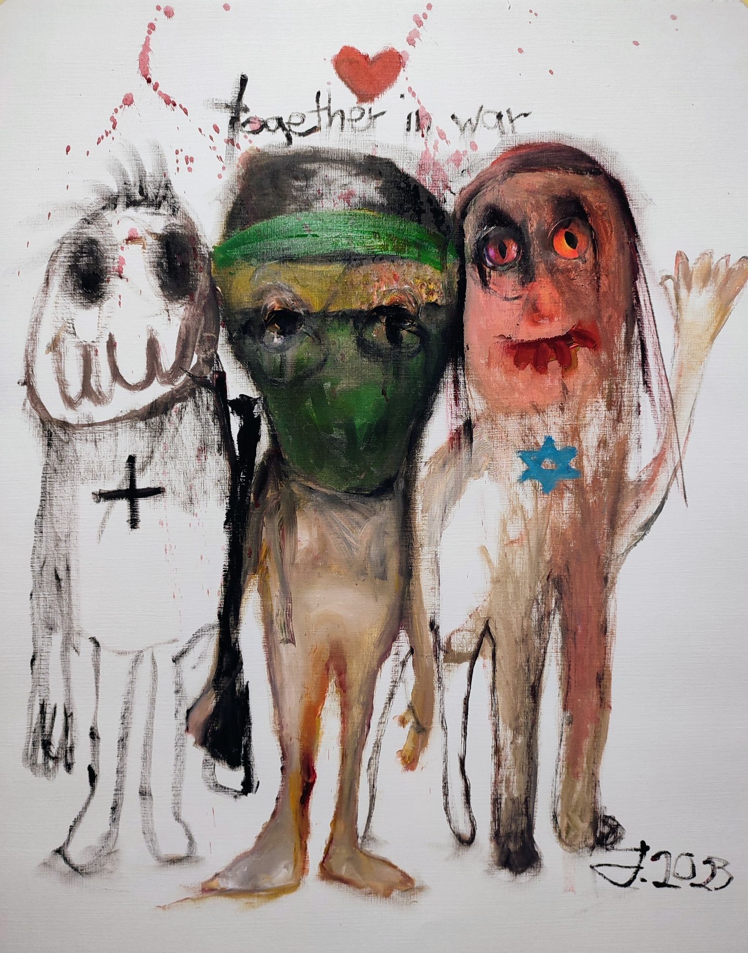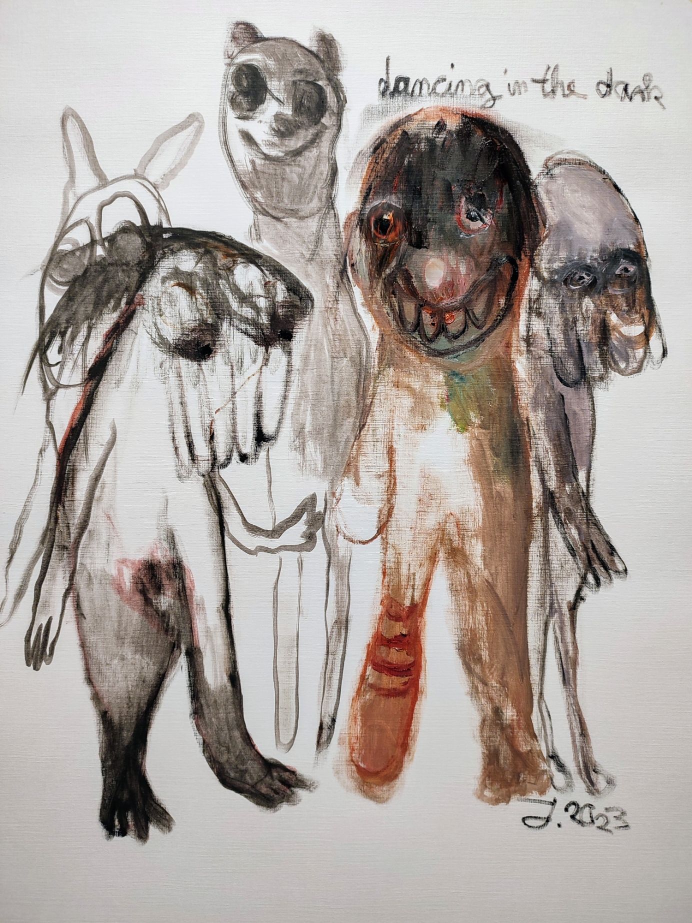 Every painting deals with several of the themes I process throughout my work. There is the anthropomorphism of in my work, but also thoughts, feelings and ideas from outside the world.