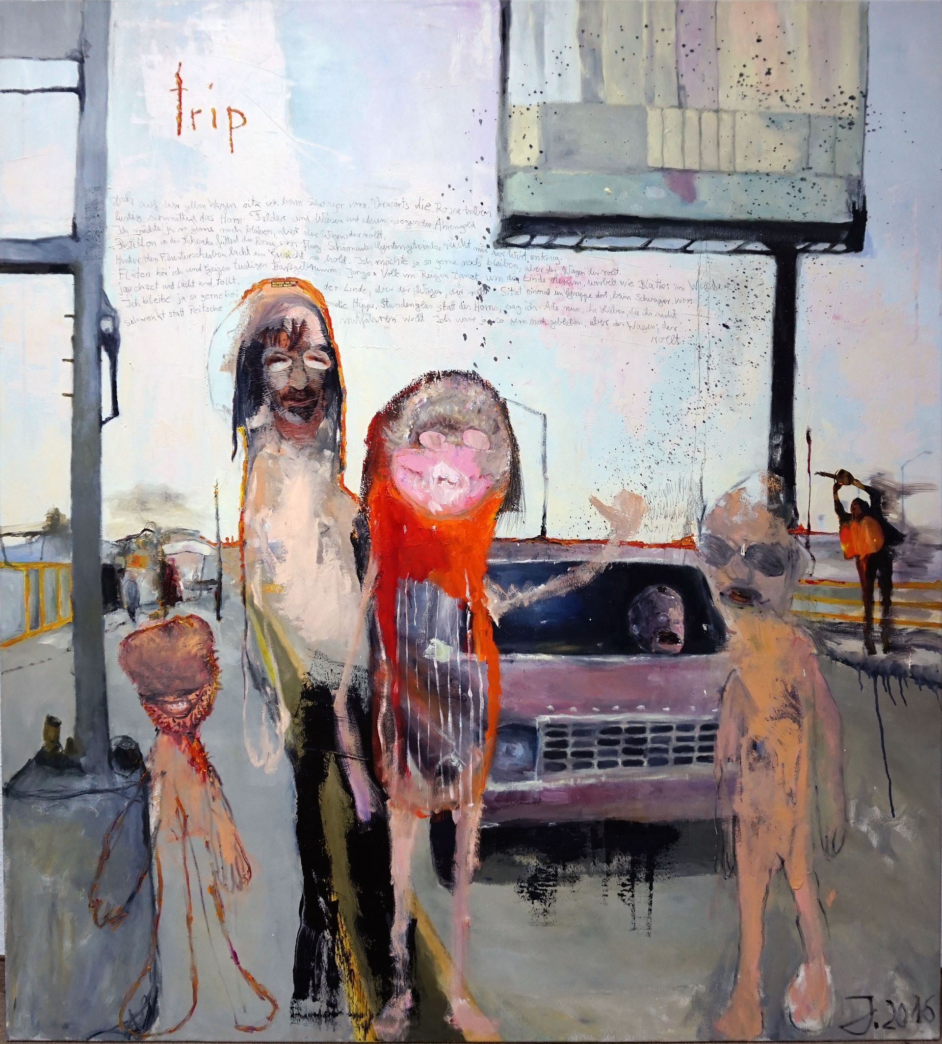 Die dargestellten Figuren wirken wie Protagonisten auf einer Bühne, es findet eine Szene statt, ein Rollenspiel mit einer Gruppendynamik.